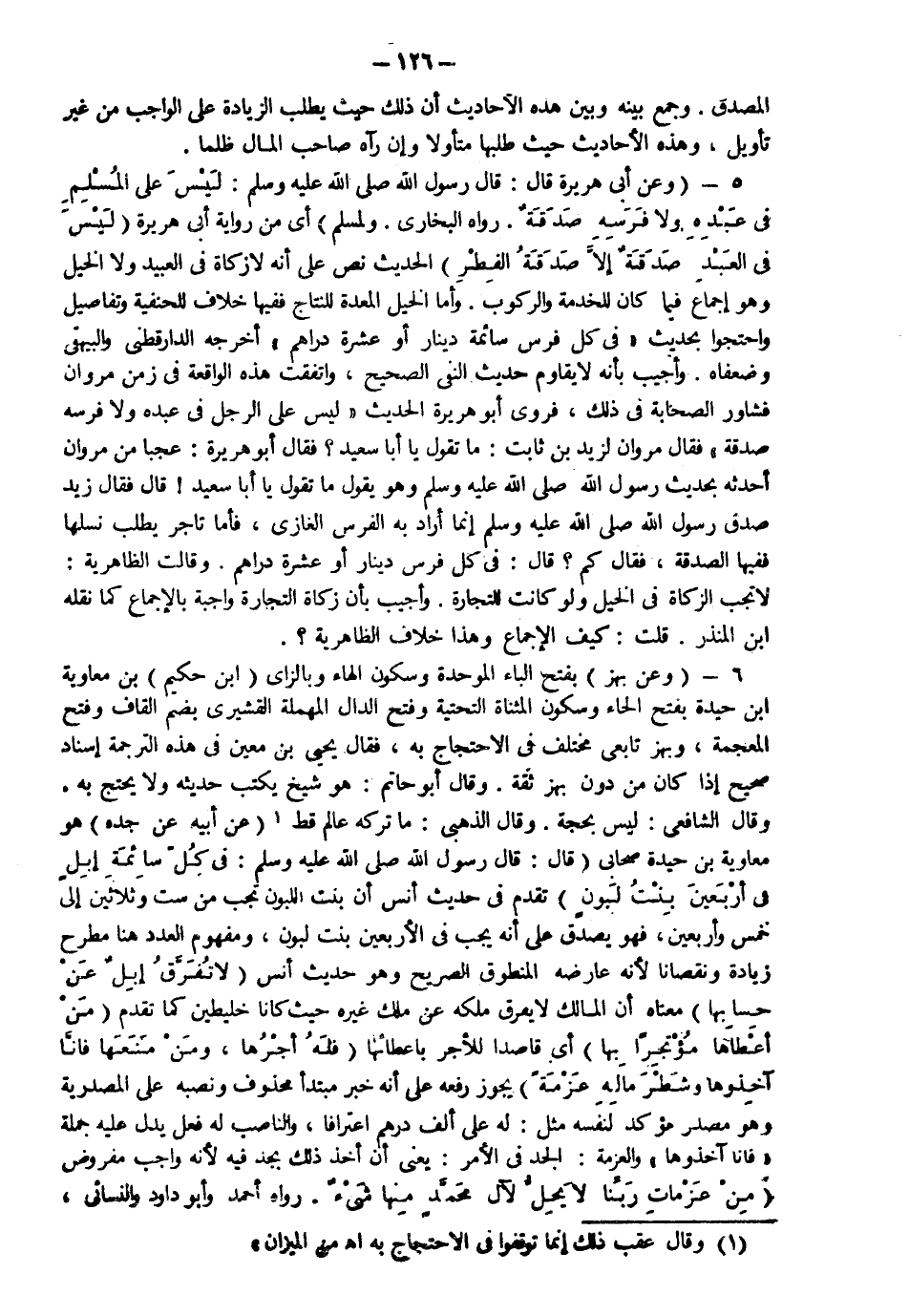6 - وعن بهز بفتح الباء الموحدة وسكون الهاء والزاي ابن حكيم ابن معاوية بن حيدة بفتح الحاء المهملة وسكون المثناة التحتية وفتح الدال المهملة القشيري بضم القاف وفتح المعجمة وبهز تابعي مختلف في الاحتجاج به فقال يحيى بن معين في هذه الترجمة إسناد صحيح إذا كان من دون بهز ثقة وقال أبو حاتم هو شيخ يكتب حديثه ولا يحتج به وقال الشافعي ليس بحجة وقال الذهبي ما تركه عالم قط عن أبيه عن جده رضي الله عنهم عن معاوية بن حيدة صحابي قال قال رسول الله صلى الله عليه وسلم: "في كل سائمة إبل في أربعين بنت لبون" تقدم في حديث أنس أن بنت اللبون تجب من ست وثلاثين إلى خمس وأربعين فهو يصدق على أنه يجب في الأربعين بنت لبون ومفهوم العدد هنا مطرح زيادة ونقصانا لأنه عارضه المنطوق الصريح وهو حديث أنس "لا تفرق إبل عن حسابها" معناه أن المالك لا يفرق ملكه عن ملك غيره حيث كانا خليطين كما تقدم "من أعطاها مؤتجرا بها" أي قاصدا للأجر بإعطائها "فله أجرها ومن منعها فإنا آخذوها وشطر ماله عزمة" يجوز رفعه على أنه خبر مبتدإ محذوف ونصبه على المصدرية وهو مصدر مؤكد لنفسه مثل له علي ألف درهم اعترافا والناصب له فعل يدل عليه جملة فإنا آخذوها والعزمة الجد في الأمر يعني أن أخذ ذلك يجد فيه "لأنه واجب مفروض من عزمات ربنا لا يحل لآل محمد منها شيء" رواه أحمد وأبو داود والنسائي