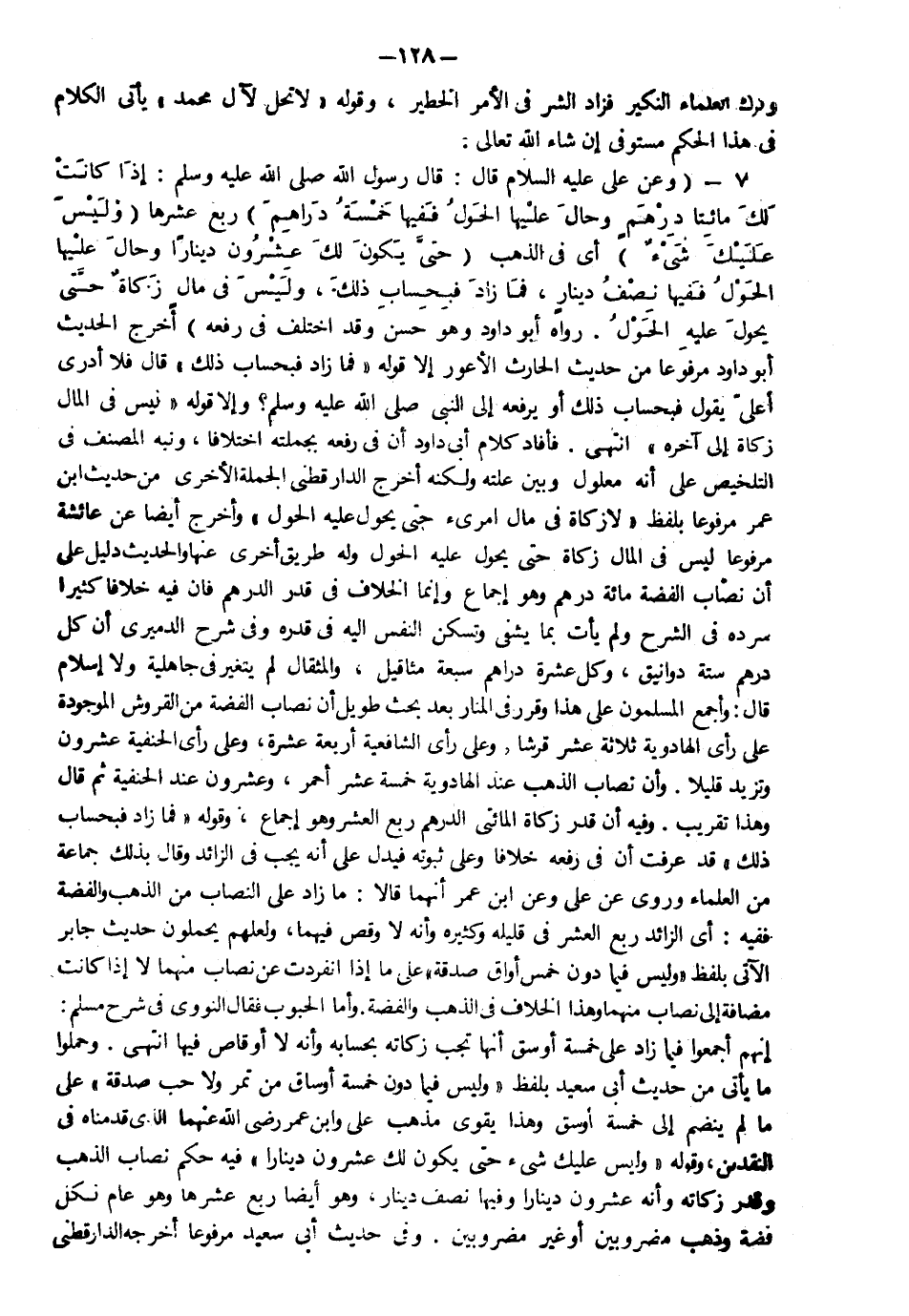7 - (وعن علي عليه السلام قال قال رسول الله صلى الله عليه وسلم: "إذا كانت لك مائتا درهم وحال عليها الحول ففيها خمسة دراهم ربع عشرها وليس عليك شيء" أي في الذهب "حتى يكون لك عشرون دينارا وحال عليها الحول ففيها نصف دينار فما زاد فبحساب ذلك وليس في مال زكاة حتى يحول عليه الحول" رواه أبو داود وهو حسن وقد اختلف في رفعه أخرج الحديث أبو داود مرفوعا من حديث الحارث الأعور إلا قوله فما زاد فبحساب ذلك قال فلا أدري أعلي يقول فبحساب ذلك أو يرفعه إلى النبي صلى الله عليه وسلم وإلا قوله ليس في المال زكاة إلى آخره انتهى فأفاد كلام أبي داود أن في رفعه بجملته اختلافا ونبه المصنف في التلخيص على أنه معلوم وبين علته ولكنه أخرج الدارقطني الجملة الأخرى من حديث ابن عمر مرفوعا بلفظ "لا زكاة في مال امريء حتى يحول عليه الحول" وأخرج أيضا عن عائشة مرفوعا " ليس في المال زكاة حتى يحول عليه الحول" وله طريق أخرى عنها والحديث دليل على أن نصاب الفضة مائتا درهم وهو إجماع وإنما الخلاف في قدر الدرهم فإن فيه خلافا كثيرا سرده في الشرح ولم يأت بما يشفي وتسكن النفس إليه في قدره وفي شرح الدميري أن كل درهم ستة دوانيق وكل عشرة دراهم سبعة مثاقيل والمثقال لم يتغير في جاهلية ولا إسلام قال وأجمع المسلمون على هذا وقرر في المنار بعد بحث طويل أن نصاب الفضة من القروش الموجودة على رأي الهادوية ثلاثة عشر قرشا وعلى رأي الشافعية أربعة عشر وعلى رأي الحنفية عشرون وتزيد قليلا وأن نصاب الذهب عند الهادوية خمسة عشر أحمر وعشرون عند الحنفية ثم قال وهذا تقريب وفيه أن قدر زكاة المائتي الدرهم ربع العشر وهو إجماع وقوله فما زاد فبحساب ذلك قد عرفت أن في رفعه خلافا وعلى ثبوته فيدل على أنه يجب في الزائد وقال بذلك جماعة من العلماء وروي عن علي وعن ابن عمر أنهما قالا ما زاد على النصاب من الذهب والفضة ففيه أي الزائد ربع العشر في قليله وكثيره وأنه لا وقص فيهما ولعلهم يحملون حديث جابر الآتي بلفظ "وليس فيما دون خمس أواق صدقة" على ما إذا انفردت عن نصاب منهما إلا إذا كانت مضافة إلى نصاب منهما وهذا الخلاف في الذهب والفضة وأما الحبوب فقال النووي في شرح مسلم إنهم أجمعوا فيما زاد على خمسة أوسق أنها تجب زكاته بحسابه وأنه لا أوقاص فيها انتهى وحملوا ما يأتي من حديث أبي سعيد بلفظ "وليس فيما دون خمسة أوساق من تمر ولا حب صدقة " على ما لم ينضم إلى خمسة أوسق وهذا يقوي مذهب علي وابن عمر رضي الله عنهما الذي قدمناه في النقدين وقوله "وليس عليك شيء حتى يكون لك عشرون دينارا" فيه حكم نصاب الذهب وقدر زكاته وأنه عشرون دينارا وفيها نصف دينار وهو أيضا ربع عشرها وهو عام لكل فضة وذهب مضروبين أوغير مضروبين وفي حديث أبي سعيد مرفوعا أخرجه الدارقطني