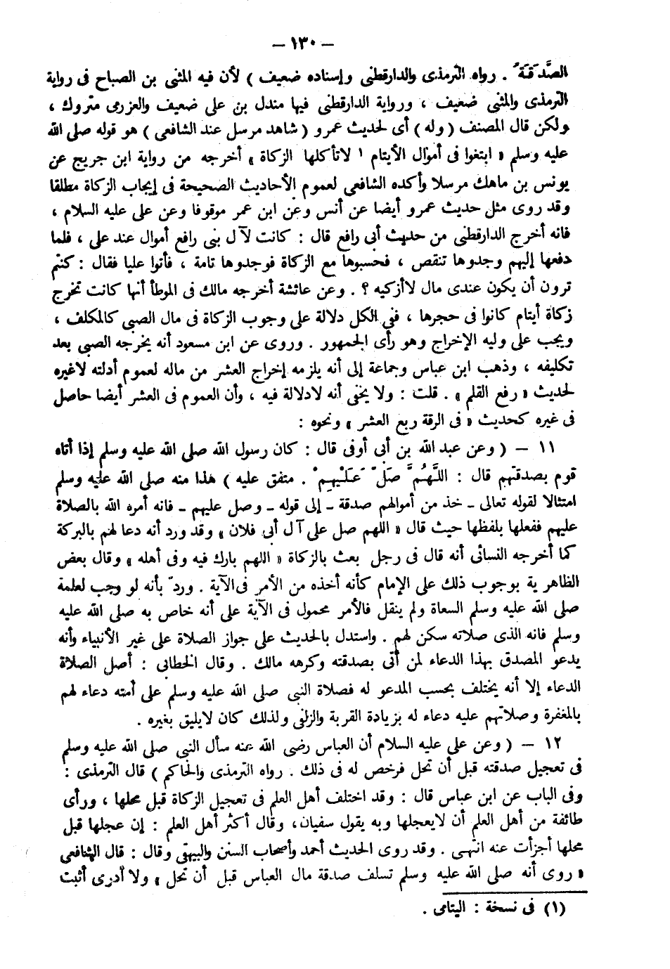 الصدقة رواه الترمذي والدارقطني وإسناده ضعيف لأن فيه المثنى بن الصباح في رواية الترمذي والمثنى ضعيف ورواية الدارقطني فيها مندل بن علي ضعيف والعزرمي متروك ولكن قال المصنف وله أي لحديث عمرو شاهد مرسل عند الشافعي هو قوله صلى الله عليه وسلم ابتغوا في أموال الأيتام لا تأكلها الزكاة أخرجه من رواية ابن جريج عن يوسف بن ماهك مرسلا وأكده الشافعي لعموم الأحاديث الصحيحة في إيجاب الزكاة مطلقا وقد روي مثل حديث عمرو أيضا عن أنس وعن ابن عمرو موقوفا وعن علي عليه السلام فإنه أخرج الدارقطني من حديث أبي رافع قال كانت لآل بني رافع أموال عند علي فلما دفعها إليهم وجدوها تنقص فحسبوها مع الزكاة فوجدوها تامة فأتوا عليا فقال كنتم ترون أن يكون عندي مال لا أزكيه وعن عائشة أخرجه مالك في الموطأ أنها كانت تخرج زكاة أيتام كانوا في حجرها ففي الكل دلالة على وجوب الزكاة في مال الصبي كالمكلف ويجب على وليه الإخراج وهو رأي الجمهور وروي عن ابن مسعود أنه يخرجه الصبي بعد تكليفه وذهب ابن عباس وجماعة إلى أنه يلزمه إخراج العشر من ماله لعموم أدلته لاغيره لحديث رفع القلم قلت ولا يخفى أنه لا دلالة فيه وأن العموم في العشر أيضا حاصل في غيره كحديث في الرقة ربع العشر ونحوه