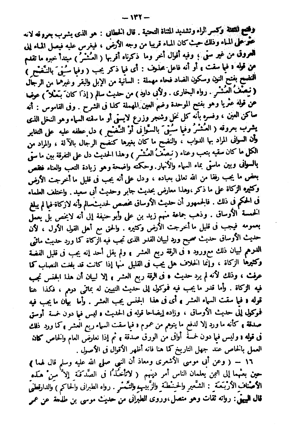 وفتح المثلثة وكسر الراء وتشديد المثناة التحتية قال الخطابي هو الذي يشرب بعروقه لأنه عثر على الماء وذلك حيث كان الماء قريبا من وجه الأرض فيغرس عليه فيصل الماء إلى العروق من غير سقي وفيه أقوال أخر وما ذكرناه أقربها "العشر" مبتدأ خبره ماتقدم من قوله فيما سقت أو أنه فاعل محذوف أي فيما ذكر يجب "وفيما سقي" بالنضح النضح بفتح النون وسكون الضاد فحاء مهملة السانية من الإبل والبقر وغيرهما من الرجال "نصف العشر" رواه البخاري ولأبي داود من حديث سالم "إذا كان بعلا" عوضا عن قوله عثريا وهو بفتح الموحدة وضم العين المهملة كذا في الشرح وفي القاموس إنه ساكن العين وفسره بأنه كل نخل وشجر وزرع لا يسقى أو ما سقته السماء وهو النخل الذي يشرب بعروقه "العشر وفيما سقي بالسواني أو النضح" دل عطفه عليه على التغاير وأن السواني المراد بها الدواب والنضح ما كان بغيرها كنضح الرجال بالآلة والمراد من الكل ما كان سقيه بتعب وعناء "نصف العشر" وهذا الحديث دل على التفرقة بين ما سقي بالسواني وبين ما سقي بماء السماء والأنهار وحكمته واضحة وهو زيادة التعب والعناء فنقص بعض ما يجب رفقا من الله تعالى بعباده ودل على أنه يجب في قليل ما أخرجت الأرض وكثيره الزكاة على ما ذكر وهذا معارض بحديث جابر وحديث أبي سعيد واختلف العلماء في الحكم في ذلك فالجمهور أن حديث الأوساق مخصص لحديث سالم وأنه لا زكاة فيما لم يبلغ الخمسة الأوساق وذهب جماعة منهم زيد بن علي وأبو حنيفة إلى أنه لا يخص بل يعمل بعمومه فيجب في قليل ما أخرجت الأرض وكثيره والحق مع أهل القول الأول لأن حديث الأوساق حديث صحيح ورد لبيان القدر الذي تجب فيه الزكاة كما ورد حديث مائتي الدرهم لبيان ذلك مع ورود "في الرقة ربع العشر" ولم يقل أحد إنه يجب في قليل الفضة وكثيرها الزكاة وإنما الخلاف هل يجب في القليل منها إذا كانت قد بلغت النصاب كما عرفت وذلك لأنه لم يرد حديث "في الرقة ربع العشر" إلا لبيان أن هذا الجنس تجب فيه الزكاة وأما قدر ما يجب فيه فموكول إلى الحديث التبيين له بمائتي درهم فكذا هنا قوله "فيما سقت السماء العشر" أي في هذا الجنس يجب العشر وأما بيان ما يجب فيه فموكول إلى حديث الأوساق وزاده إيضاحا قوله في الحديث ليس فيما دون خمسة أوسق صدقة كأنه ما ورد إلالدفع ما يتوهم من عموم فيما سقت السماء ربع العشر كما ورد في ذلك في قوله وليس فيما دون خمسة أوقي من الورق صدقة ثم إذا تعارض العام والخاص كان العمل بالخاص عند جهل التاريخ كما هنا فإنه أظهر الأقوال في الأصول