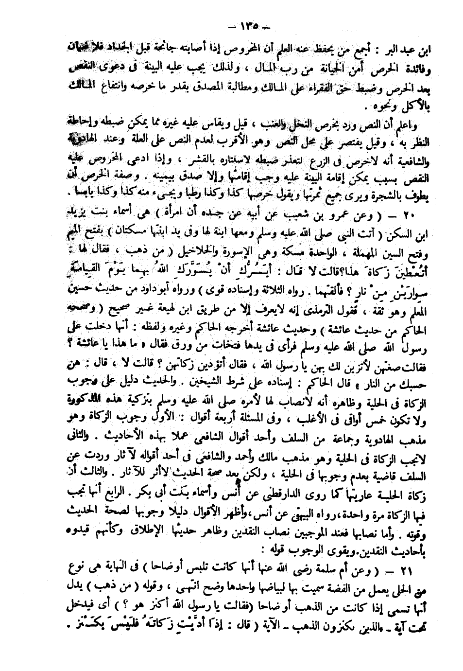 20 - ( وعن عمرو بن شعيب عن أبيه عن جده أن امرأة) هي أسماء بنت يزيد ابن السكن "أتت النبي صلى الله عليه وسلم ومعها ابنة لها وفي يد ابنتها مسكتان غليظتان" بفتح الميم وفتح السين المهملة والواحدة مسكة وهي الأسورة والخلاخيل " من ذهب فقال لها أتعطين زكاة هذا قالت لا قال أيسرك أن يسورك الله بهما يوم القيامة سوارين من نار فألقتهما" رواه الثلاثة وإسناده قوي ورواه أبو داود من حديث حسين المعلم وهو ثقة فقول الترمذي إنه لا يعرف إلا من طريق ابن لهيعة غيرصحيح (وصححه الحاكم من حديث عائشة وحديث عائشة أخرجه الحاكم وغيره ولفظه أنها دخلت على رسول الله صلى الله عليه وسلم فرأى في يدها فتخات من ورق فقال "ما هذا يا عائشة فقالت صغتهن لأتزين لك بهن يا رسول الله فقال أتؤدين زكاتهن قالت لا قال هن حسبك من النار" قال الحاكم إسناده على شرط الشيخين والحديث دليل على وجوب الزكاة في الحلية وظاهره أنه لا نصاب لها لأمره صلى الله عليه وسلم بتزكية هذه المذكورة ولا تكون خمس أواقي في الأغلب وفي المسألة أربعة أقوال الأول وجوب الزكاة وهو مذهب الهادوية وجماعة من السلف وأحد أقوال الشافعي عملا بهذه الأحاديث والثاني لا تجب الزكاة في الحلية وهو مذهب مالك وأحمد والشافعي في أحد أقواله لآثار وردت عن السلف قاضية بعد وجوبها في الحلية ولكن بعد صحة الحديث لا أثر للآثار والثالث أن زكاة الحلية عاريتها كما روى الدارقطني عن أنس وأسماء بنت أبي بكر الرابع أنها تجب فيها الزكاة مرة واحدة رواه البيهقي عن أنس وأظهر الأقوال دليلا وجوبها لصحة الحديث وقوته وأما نصابها فعند الموجبين نصاب النقدين وظاهر حديثها الإطلاق وكأنهم قيدوه بأحاديث النقدين ويقوي الوجوب قوله
