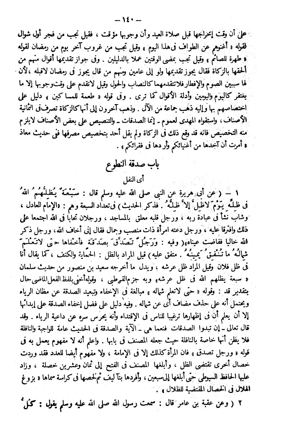 1 - عن أبي هريرة عن النبي صلى الله عليه وسلم قال: "سبعة يظلهم الله في ظله يوم لا ظل إلا ظله" فذكر الحديث في تعداد السبعة وهم "الإمام العادل وشاب نشأ في عبادة ربه ورجل قلبه معلق بالمساجد ورجلان تحابا في الله اجتمعا على ذلك وافترقا عليه ورجل دعته امرأة ذات منصب وجمال فقال إني أخاف الله ورجل ذكر الله خاليا ففاضت عيناه وفيه رجل تصدق بصدقة فأخفاها حتى لا تعلم شماله ما تنفق يمينه" متفق عليه قيل المراد بالظل الحماية والكنف كما يقال أنا في ظل فلان وقيل المراد ظل عرشه ويدل ما أخرجه سعيد بن منصور من حديث سلمان "سبعة يظلهم الله في ظل عرشه" وبه جزم القرطبي وقوله أخفى بلفظ الفعل الماضي حال بتقدير قد وقوله "حتى لا تعلم شماله" مبالغة في الإخفاء وتبعيد الصدقة عن مظان الرياء ويحتمل أنه على حذف مضاف أي عن شماله وفيه دليل على فضل إخفاء الصدقة على إبدائها إلا أن يعلم أن في إظهارها ترغيبا للناس في الاقتداء وأنه يحرس سره عن داعية الرياء وقد قال تعالى: {إِنْ تُبْدُوا الصَّدَقَاتِ فَنِعِمَّا هِيَ} الآية والصدقة في الحديث عامة للواجبة والنافلة فلا يظن أنها خاصة بالنافلة حيث جعله المصنف في بابها واعلم أنه لا مفهوم يعمل به في قوله " ورجل تصدق" فإن المرأة كذلك إلا في الإمامة ولا مفهوم أيضا للعدد فقد وردت خصال تقتضي الظل وأبلغها المصنف في الفتح إلى ثمان وعشرين خصلة وزاد عليها الحافظ السيوطي حتى أبلغها إلى سبعين وأفردها بالتأليف ثم لخصها في كراسة سماها بزوغ الهلال في الخصال المقتضية للظلال