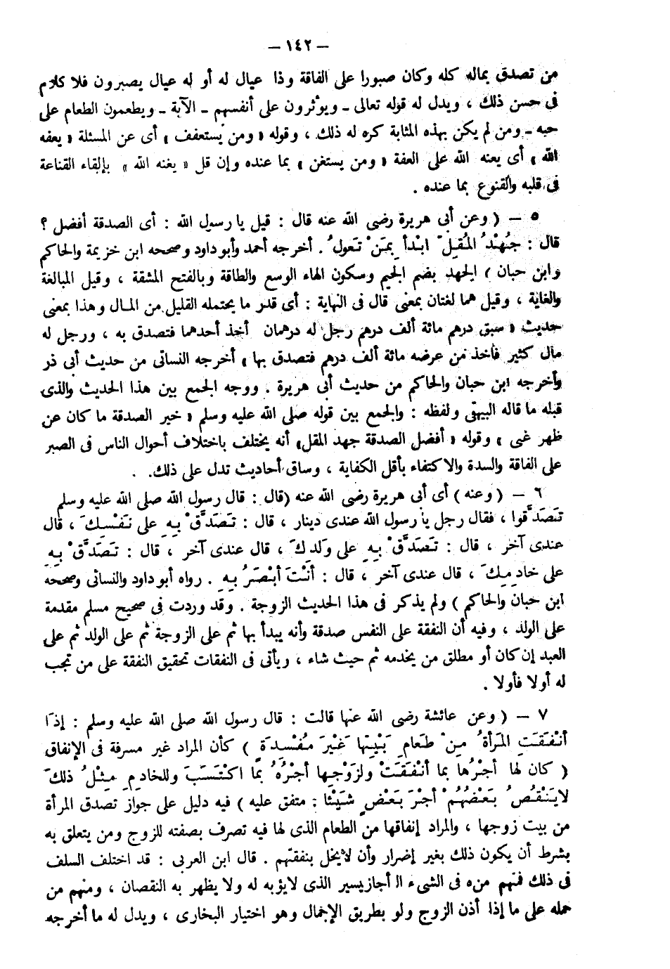 6 - وعنه أي أبي هريرة رضي الله عنه قال قال رسول الله صلى الله عليه وسلم: "تصدقوا" فقال رجل يا رسول الله عندي دينار قال: "تصدق به على نفسك" قال عندي آخر قال: "تصدق به على ولدك" قال عندي آخر قال: "تصدق به على خادمك" قال عندي آخر قال: "أنت أبصر به" رواه أبو داود والنسائي وصححه ابن حبان والحاكم ولم يذكر في هذا الحديث الزوجة وقد وردت في صحيح مسلم مقدمة على الولد وفيه أن النفقة على النفس صدقة وأنه يبدأ بها ثم على الزوجة ثم على الولد ثم على العبد إن كان أو مطلق من يخدمه ثم حيث شاء ويأتي في النفقات تحقيق النفقة على من تجب له أولا فأولا