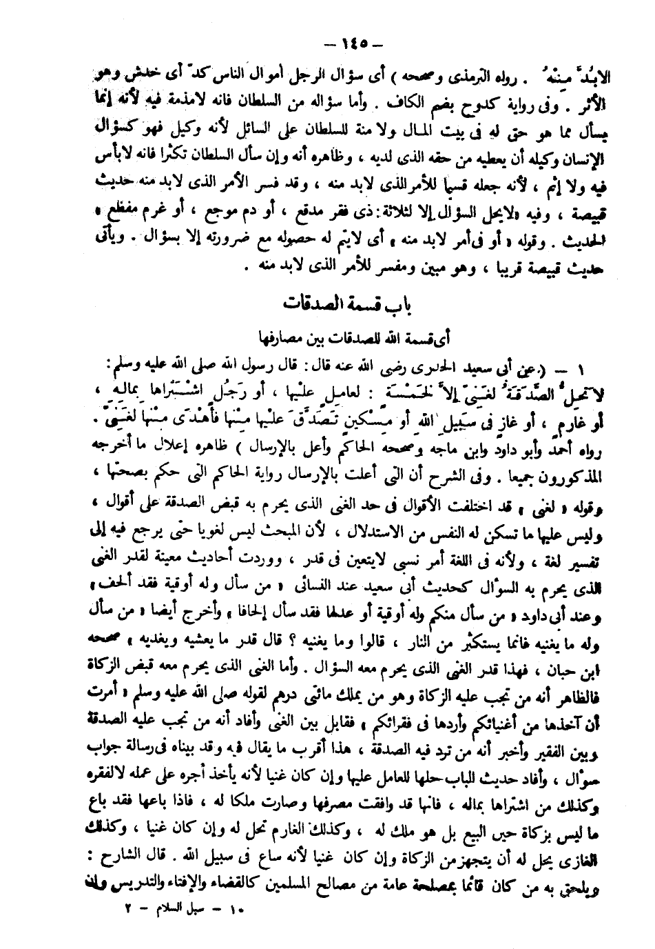1 - عن أبي سعيد الخدري رضي الله عنه قال قال رسول الله صلى الله عليه وسلم: "لا تحل الصدقة لغني إلا لخمسة لعامل عليها أو رجل اشتراها بماله أو غارم أو غاز في سبيل الله أو مسكين تصدق عليه منها فأهدى منها لغني" رواه أحمد وأبو داود وابن ماجه وصححه الحاكم وأعل بالإرسال ظاهره إعلال ما أخرجه المذكورون جميعا وفي الشرح أن التي أعلت بالإرسال رواية الحاكم التي حكم بصحتها وقوله لغني قد اختلفت الأقوال في حد الغنى الذي يحرم به قبض الصدقة على أقوال وليس عليها ما تسكن له النفس من الاستدلال لأن المبحث ليس لغويا حتى يرجع فيه إلى تفسير لغة ولأنه في اللغة أمر نسبي لا يتعين في قدر ووردت أحاديث معينة لقدر الغنى الذي يحرم به السؤال كحديث أبي سعيد ثم النسائي "من سأل وله أوقية فقد ألحف" وعند أبي داود من سأل منكم وله أوقية أو عدلها فقد سأل إلحافا وأخرج أيضا من سؤل وله ما يغنيه فإنما يستكثر من النار قالوا وما يغنيه قال قدر ما يعشيه ويغديه صححه ابن حبان فهذا قدر الغنى الذي يحرم معه السؤال وأما الغنى الذي يحرم معه قبض الزكاة فالظاهر أنه من تجب عليه الزكاة وهو من يملك مائتي درهم لقوله صلى الله عليه وسلم: "أمرت أن آخذها من أغنيائكم وأردها في فقرائكم" فقابل بين الغنى وأفاد أنه من تجب عليه الصدقة وبين الفقير وأخبر أنه من ترد فيه الصدقة هذا أقرب ما يقال فيه وقد بيناه في رسالة جواب سؤال وأفاد حديث الباب حلها للعامل عليها وإن كان غنيا لأنه يأخذ أجره على عمله لا لفقره وكذلك من اشتراها بماله فإنها قد وافقت مصرفها وصارت ملكا له فإذا باعها فقد باع ما ليس بزكاة حين البيع بل هو ملك له وكذلك الغارم تحل له وإن كان غنياوكذلك الغازي يحل له أن يتجهز من الزكاة وإن كان غنيا لأنه ساع في سبيل الله قال الشارح ويلحق به من كان قائما بمصلحة عامة من مصالح المسلمين كالقضاء والإفتاء والتدريس وإن