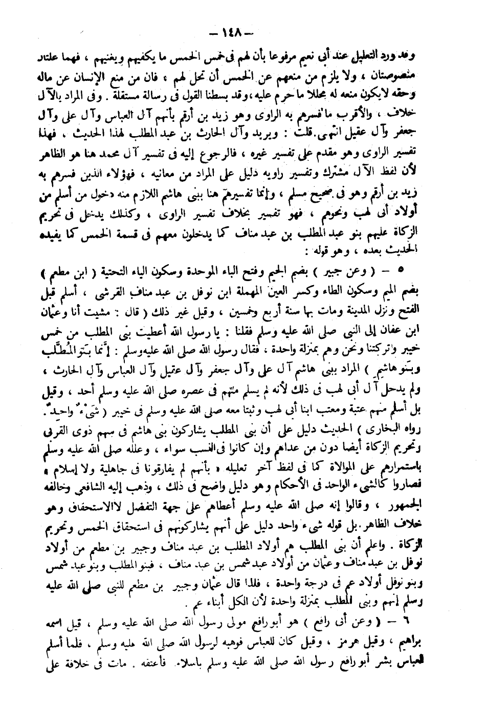 5 - وعن جبير بضم الجيم وفتح الباء الموحدة وسكون الياء التحتية ابن مطعم بضم الميم وسكون الطاء وكسر العين المهملة بن نوفل بن عبد مناف القرشي أسلم قبل الفتح ونزل المدينة ومات بها سنة أربع وخمسين وقيل غير ذلك قال مشيت أنا وعثمان بن عفان إلى النبي صلى الله عليه وسلم فقلنا يا رسول الله أعطيت بني المطلب من خمس خيبر وتركتنا ونحن وهم بمنزلة واحدة فقال رسول الله صلى الله عليه وسلم: "إنما بنو المطلب وبنو هاشم" المراد ببني هاشم آل علي آل جعفر وآل عقيل وآل العباس وآل الحارث ولم يدخل آل أبي لهب في ذلك لأنه لم يسلم منهم في عصره صلى الله عليه وسلم أحد وقيل بل أسلم منهم عتبة ومعتب ابنا أبي لهب وثبتا معه صلى الله عليه وسلم في خيبر "شيء واحد" رواه البخاري الحديث دليل على أن بني المطلب يشاركون بني هاشم في سهم ذوي القربي وتحريم الزكاة أيضا دون من عداهم وإن كانوا في النسب سواء وعلله صلى الله عليه وسلم باستمرارهم على الموالاة كما في لفظ آخر تعليله "بأنهم لم يفارقونا في جاهلية ولا إسلام" فصاروا كالشيء الواحد في الأحكام وهو دليل واضح في ذلك وذهب إليه الشافعي وخالفه الجمهور وقالوا إنه صلى الله عليه وسلم أعطاهم على جهة التفضل لا الاستحقاق وهو خلاف الظاهر بل قوله شيء واحد دليل على أنهم يشاركونهم في استحقاق الخمس وتحريم الزكاة واعلم أن بني المطلب هم أولاد المطلب بن عبد مناف وجبير بن مطعم من أولاد نوفل بن عبد مناف وعثمان من أولاد عبد شمس بن عبد مناف فبنو المطلب وبنو عبد شمس وبنو نوفل أولاد عم في درجة واحدة طاعة فلذا قال عثمان وجبير بن مطعم للنبي صلى الله عليه وسلم إنهم وبني المطلب بمنزلة واحدة لأن الكل أبناء عم