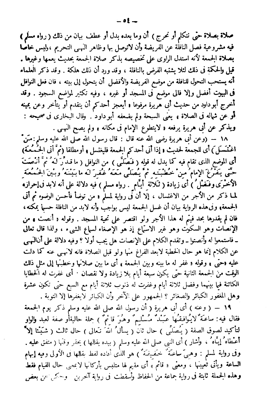 19- وعنه" أي أبي هريرة "رضي الله عنه أن رسول الله صَلّى الله عَلَيْهِ وَسَلّم ذكر يوم الجمعة فقال: "فيه ساعةٌ لا يوافِقُها عبْدٌ مُسْلمٌ وهوَ قائمٌ" جملة حالية أو صفة لعبد والواو لتأكيد لصوق الصفة "يُصَلي" حال ثانية "يسأَلُ الله عزَّ وجلَّ" حال ثالثة "شيئاً إلا أَعطاهُ إياهُ وأشار" أي النبي صَلّى الله عَلَيْهِ وَسَلّم "بيده يقللها" يحقر وقتها متفق عليه: وفي رواية لمسلم "وهي ساعةٌ خفيفة"" هو الذي أفاده لفظ يقللها في الأولى وفيه إبهام الساعة ويأتي تعيينها.