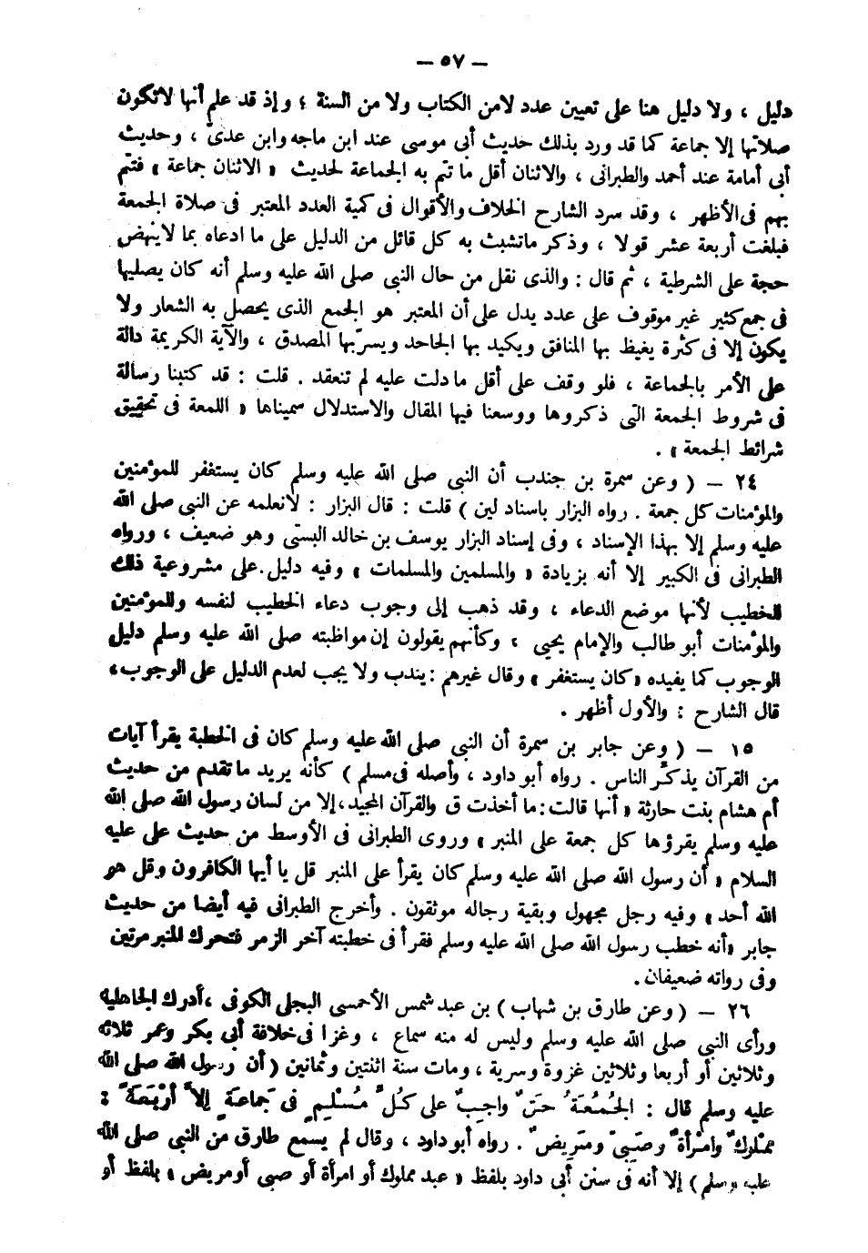 26- وعن طارق بن شهاب رضي الله عنه" ابن عبد شمس الأحمسي البجلي الكوفي أدرك الجاهلية ورأى النبي صَلّى الله عَلَيْهِ وَسَلّم وليس له منه سماع وغزا في خلافة أبي بكر وعمر ثلاثاً وثلاثين أو أربعاً وثلاثين غزوة وسرية ومات سنة اثنتين وثمانين "أن رسول الله صَلّى الله عَلَيْهِ وَسَلّم قال: "الجمعة حق واجبٌ على كلِّ مُسْلمٍ في جماعةٍ إلا أربعة مملُوكٌ وامرأةٌ وصبيٌّ ومريضٌ" رواه أبو داود وقال: لم يسمع طارق من النبي صَلّى الله عَلَيْهِ وَسَلّم" إلا أنه في سنن أبي داود بلفظ "عبد مملوك أو امرأة أو صبي أو مريض" بلفظ أو