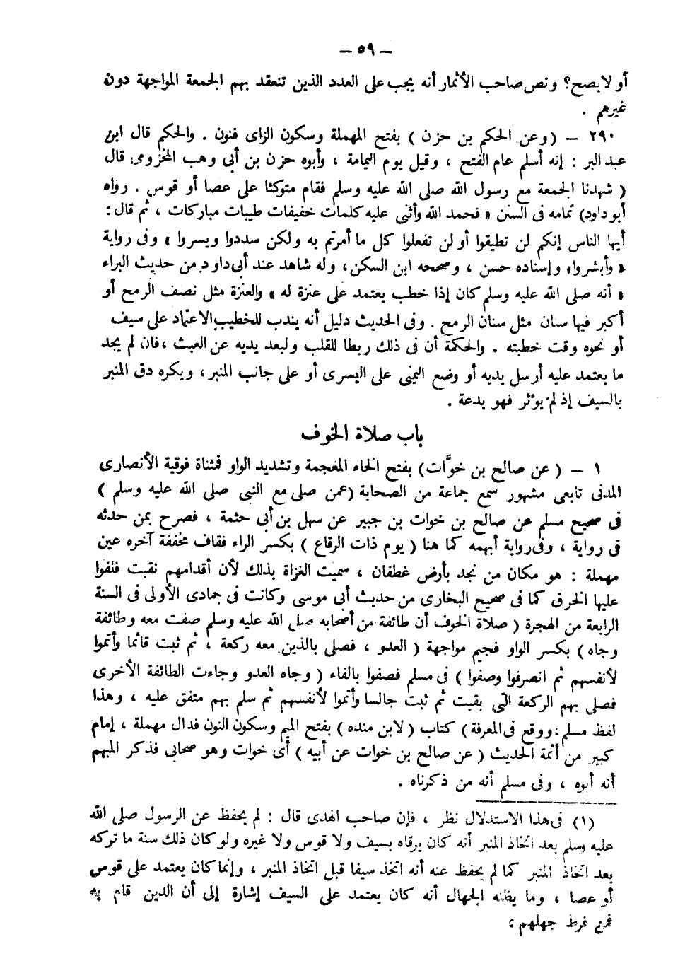 1- عن صالح بن خوّات رضي الله عنه" بفتح الخاء المعجمة وتشديد الواو فمثناة فوقية الأنصاري المدني تابعي مشهور سمع جماعة من الصحابة "عمن صلى مع النبي صَلّى الله عَلَيْهِ وَسَلّم" في صحيح مسلم عن صالح بن خوات ابن جبير عن سهل بن أبي حثمة، فصرح بمن حدثه في رواية. وفي رواية أبهمه كما هنا "يوم ذات الرِّقاع" بكسر الراء فقاف مخففة آخره عين مهملة هو مكان من نجد بأرض غطفان. سميت الغزوة بذلك لأن أقدامهم نقبت فلفوا عليها الخرق كما في صحيح البخاري من حديث أبي موسى وكانت في جمادى الأولى في السنة الرابعة من الهجرة "صلاة الخوف أن طائفة" من أصحابه صَلّى الله عَلَيْهِ وَسَلّم "صفت معه وطائفة وجاه" بكسر الواو فجيم مواجهة "العدو فصلى بالذين معه ركعة ثم ثبت قائماً وأتموا لأنفسهم ثم انصرفوا وصفوا" في مسلم فصفوا بالفاء "وجاه العدو وجاءت الطائفة الأخرى فصلى بهم الركعة التي بقيت ثم ثبت جالساً وأتموا لأنفسهم ثم سلم بهم. متفق عليه وهذا لفظ مسلم ووقع في المعرفة" كتاب "لابن منده" بفتح الميم وسكون النون فدال مهملة إمام كبير من أئمة الحديث "عن صالح بن خوات عن أبيه" أي خوات وهو صحابي فذكر المبهم أنه أبوه، وفي مسلم أنه من ذكرناه.