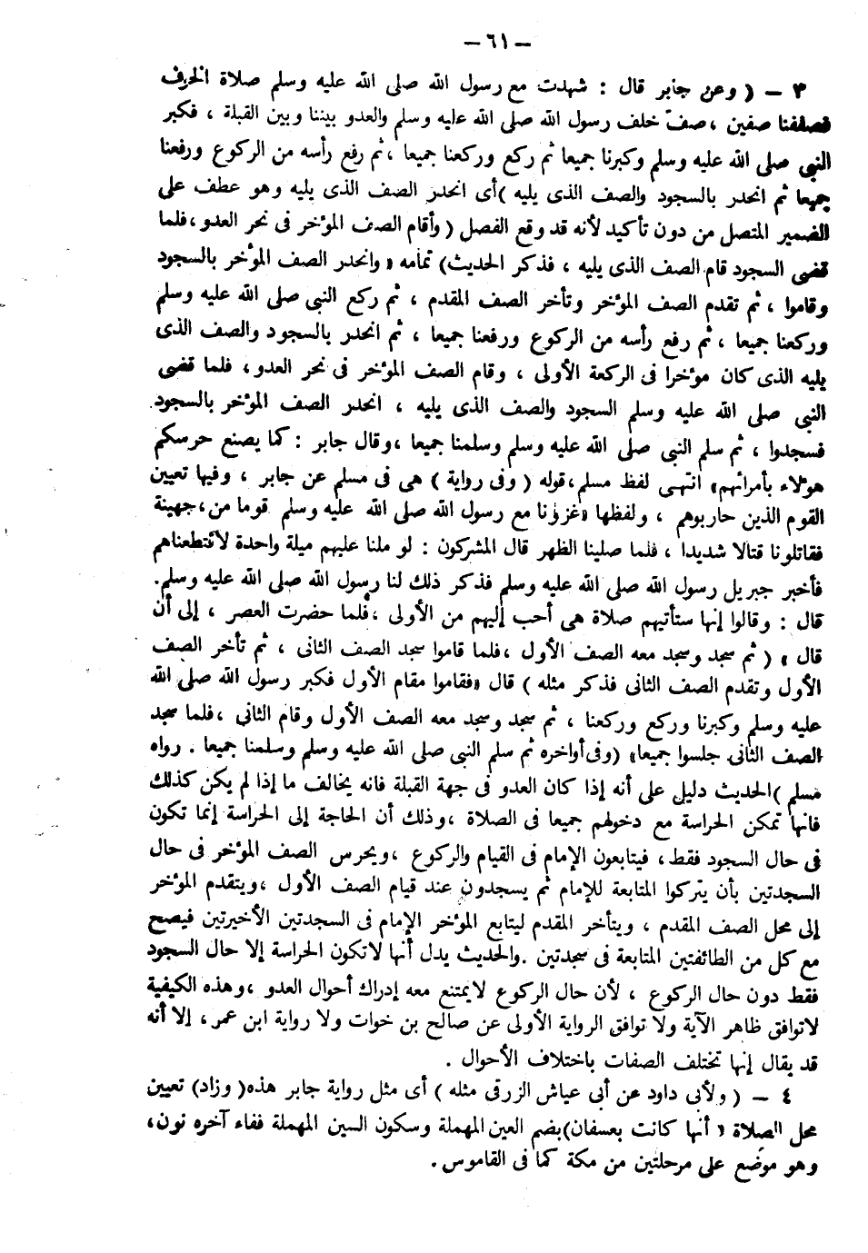 3- وعن جابر رضي الله عنه قال: شهدت مع رسول الله صَلّى الله عَلَيْهِ وَسَلّم صلاة الخوف فصففنا صفين: صفٌّ خلف رسول الله صَلّى الله عَلَيْهِ وَسَلّم والعدوُّ بيننا وبين القبلة فكبر النبي صَلّى الله عَلَيْهِ وَسَلّم وكبرنا جميعاً ثم ركع وركعنا جميعاً ثم رفع رأسه من الركوع ورفعنا جميعاً ثم انحدر بالسجود والصف الذي يليه" أي انحدر الصف الذي يليه وهو عطف على الضمير المتصل من دون تأكيد لأنه وقد وقع الفصل "وأقام الصف المؤخر في نحر العدو فلما قضى السجود وقام الصف الذي يليه فذكر الحديث" تمامه "انحدر الصف المؤخر بالسجود وقاموا ثم تقدم الصف المؤخر وتأخر الصف المقدم ثم ركع النبي صَلّى الله عَلَيْهِ وَسَلّم وركعنا جميعاً ثم رفع رأسه من الركوع ورفعنا جميعاً ثم انحدر بالسجود والصف الذي يليه الذي كان مؤخراً في الركعة الأولى وقام والصف المؤخر في نحور العدو، فلما قضى النبي صَلّى الله عَلَيْهِ وَسَلّم السجود والصف الذي يليه انحدر الصف المؤخر بالسجود فسجدوا ثم سلم النبي صَلّى الله عَلَيْهِ وَسَلّم وسلمنا جميعاً، قال جابر: كما يصنع حرسكم هؤلاء بأمرائهم" انتهى لفظ مسلم.