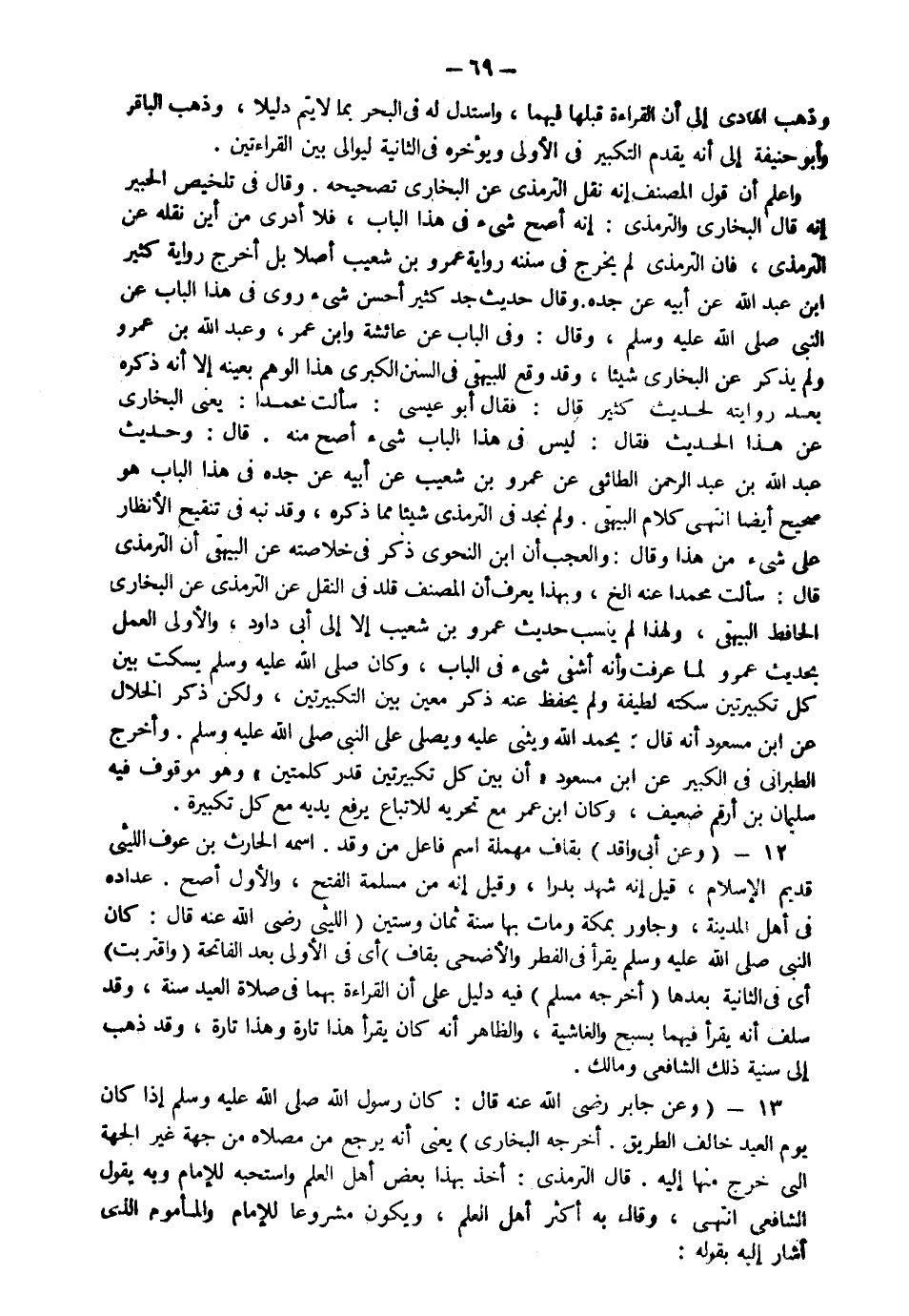 ولم نجد في الترمذي شيئاً مما ذكره، وقد نبه في تنقيح الأنظار على شيء من هذا، وقال: والعجب أن ابن النحوي ذكر في خلاصته عن البيهقي أن الترمذي قال: سألت محمداً عنه إلخ، وبهذا يعرف أن المصنف قلد في النقل عن الترمذي عن البخاري الحافظ البيهقي، ولهذا لم ينسب حديث عمرو بن شعيب إلا إلى أبي دادو، والأولى العمل بحديث عمرو لما عرفت، وأنه أشفى شيء في الباب، وكان صَلّى الله عَلَيْهِ وَسَلّم يسكت بين كل تكبيرتين سكتة لطيفة ولم يحفظ عنه ذكر معين بين التكبيرتين ولكن ذكر الخلال عن ابن مسعود أنه قال: يحمد الله ويثني عليه ويصلي على النبي صَلّى الله عَلَيْهِ وَسَلّم. وأخرج الطبراني في الكبير عن ابن مسعود "أن بين كل تكبيرتين قدر كلمتين" وهو موقوف. وفيه[تض] سليمان بن أرقم[تض] ضعيف، وكان ابن عمر مع تحريه للاتباع يرفع يديه مع كل تكبيرة.