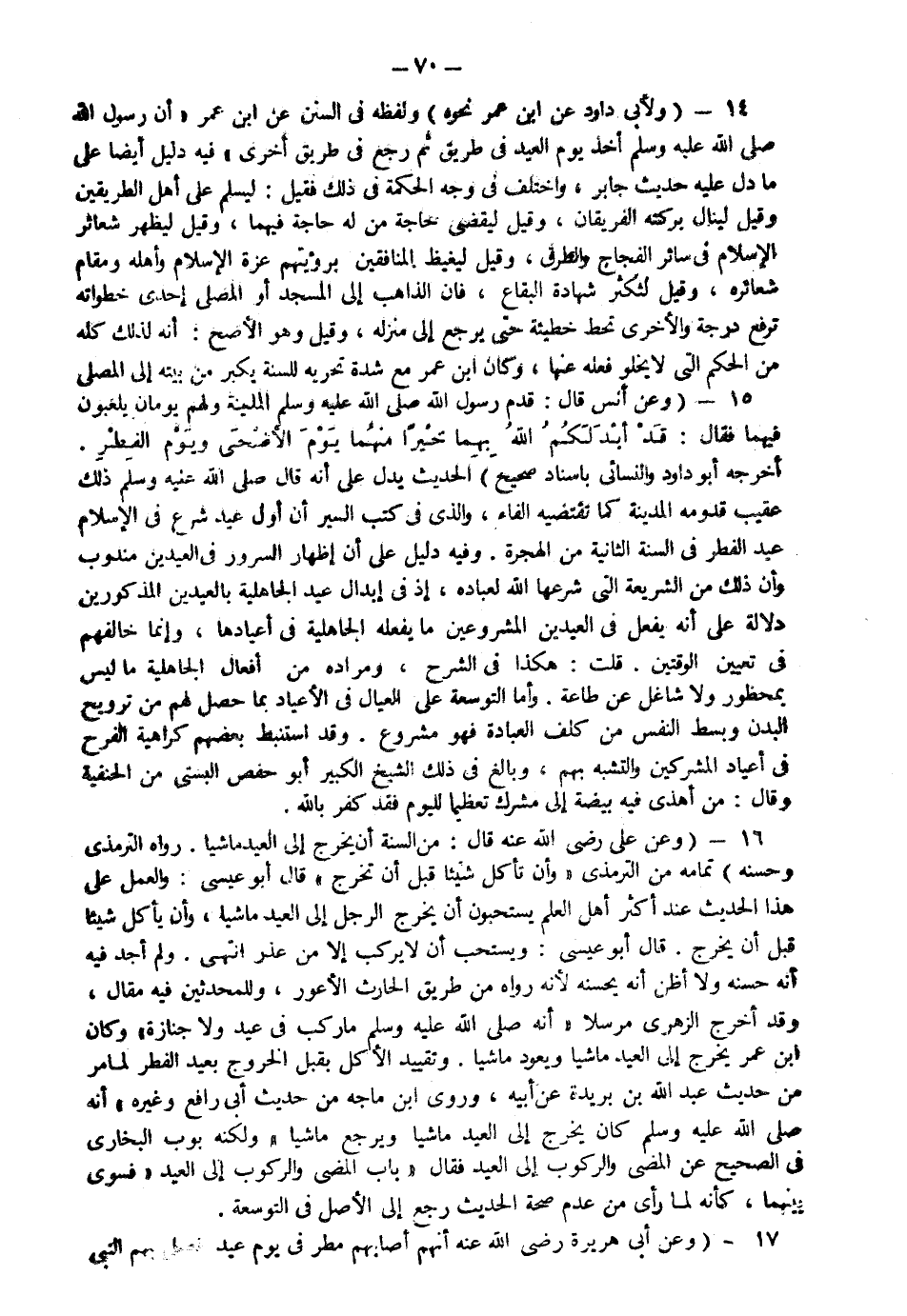 16 ـ وعَنْ علي رَضيَ اللَّهُ عَنْهُ قالَ: "مِنَ السُّنّةِ أَنْ تَخْرُج إلى العِيدِ مَاشياً" رواهُ التّرْمِذيُّ وحَسّنهُ.