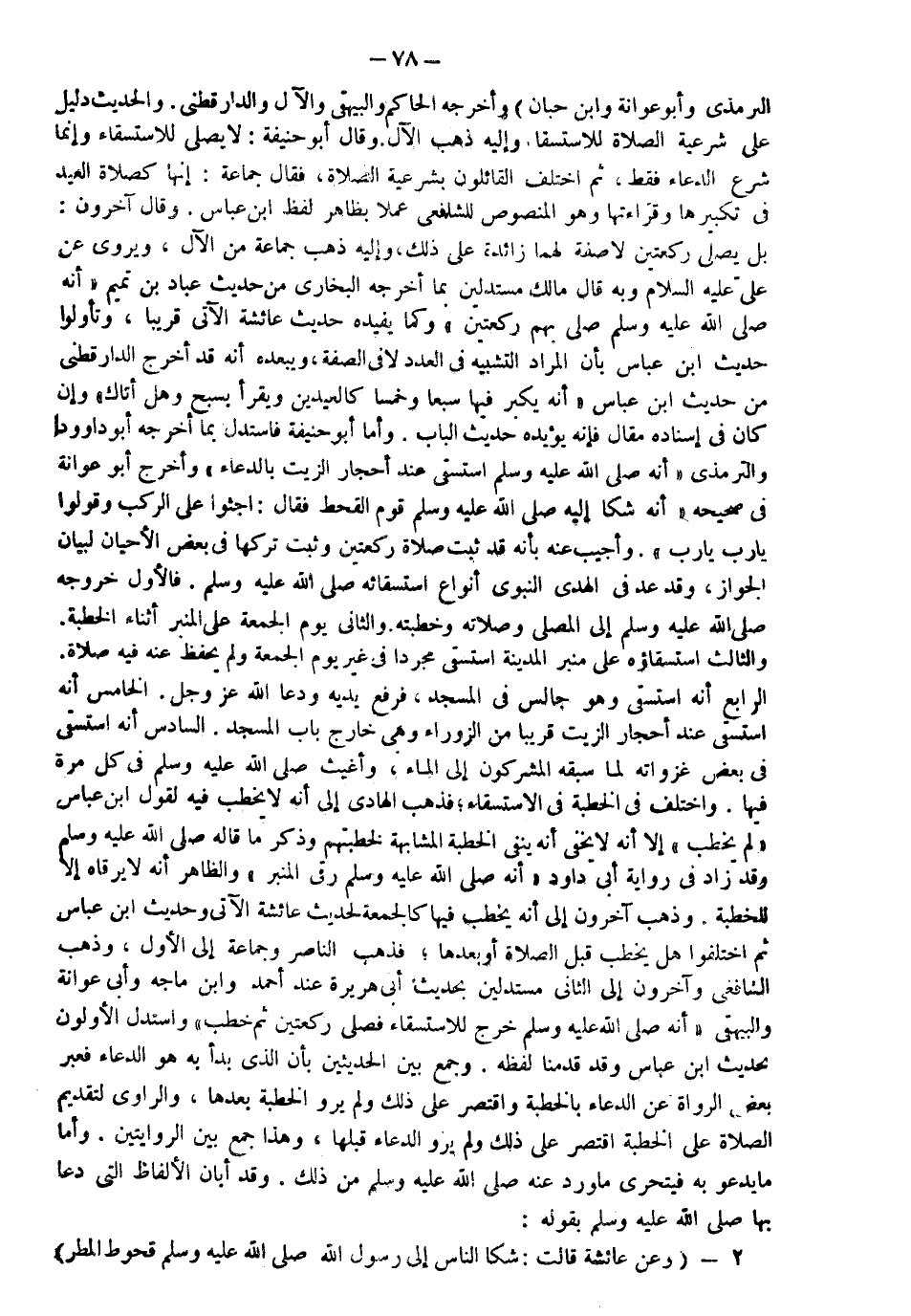 وذهب الشافعي وآخرون إلى الثاني مستدلين بحديث أبي هريرة عند أحمد وابن ماجه وأبي عوانة والبيهقي: أنه صَلّى الله عَلَيْهِ وَسَلّم خرج للاستسقاء فصلى ركعتين ثم خطب. واستدل الأوّلون بحديث ابن عباس وقد قدمنا لفظه.