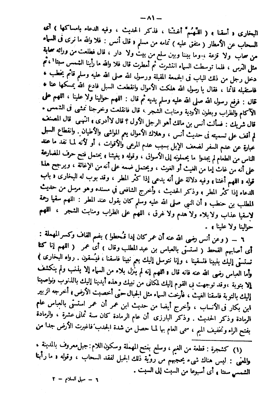 6- وعن أنس رضي الله عنه أن عمر كان إذا قُحِطوا" بضم القاف وكسر المهملة أي أصابهم القحط "استسقى بالعباس بن عبد المطلب وقال" أي عمر: "اللهم إنا كنا نتوسل إليك بنبينا فتسقينا وإنا نتوسل إليك بعم نبينا فاسقنا فيسقون. رواه البخاري" وأما العباس رضي الله عنه فإنه قال: "اللهم إنه لم ينزل بلاء من السماء إلا بذنب ولم ينكشف إلا بتوبة وقد توجه بي القوم إليك لمكاني من نبيك وهذه أيدينا إليك بالذنوب ونواصينا إليك بالتوبة فاسقنا الغيث؛ فأرخت السماء مثل الجبال حتى أخصبت الأرض" أخرجه الزبير بن بكار في الأنساب، وأخرجه أيضاً من حديث ابن عمر أن عمر استسقى بالعباس عام الرمادة وذكر الحديث، وذكر الباذري أن عام الرمادة كان سنة ثماني عشرة، والرمادة بفتح الراء وتخفيف الميم، سمي العام بها لما حصل من شدة الجدب فاغبرت الأرض جداً من