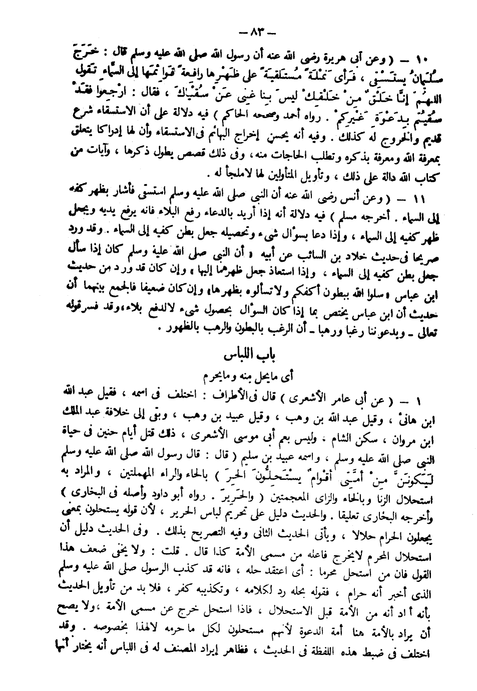 1- عن أبي عامر الأشعري رضي الله عنه" قال في الأطراف: اختلف في اسمه فقيل عبد الله بن هانىء، وقيل عبد الله بن وهب، وقيل عبيد الله بن وهب وبقي إلى خلافة عبد الملك بن مروان سكن الشام. وليس بعم أبي موسى الأشعري فإنّ ذلك قتل أيام حنين في حياة النبي صَلّى الله عَلَيْهِ وَسَلّم واسمه عبيد بن سليم "قال: قال رسول الله صَلّى الله عَلَيْهِ وَسَلّم: "ليكوننَّ من أمّتي أَقوامٌ يَسْتحلُّونَ الْحِرَ" بالحاء والراء المهملتين والمراد به استحلال الزنا وبالخاء والزاي المعجمتين "والحريرَ" رواه أبو داود وأصله في البخاري" وأخرجه البخاري تعليقاً.