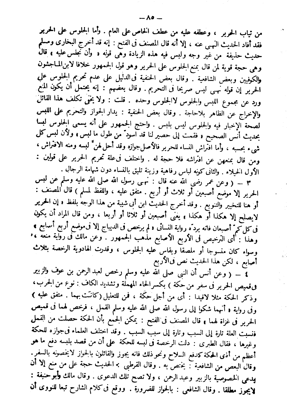 4- وعن أنس رضي الله عنه أن النبي صَلّى الله عَلَيْهِ وَسَلّم رخص لعبد الرحمن بن عوف والزبير في قميص الحرير من حِكّة" بكسر الحاء المهملة وتشديد الكاف نوع من الجرب وذكر الحكة مثلا لا قيداً أي من أجل حكة، فمن للتعليل "كانت بهما . متفق عليه" وفي رواية "أنهما شكوَا إلى رسول الله صلى الله عليه وعلى آله وسلم القمل فرخص لهما في قميص الحرير في غزاة لهما".