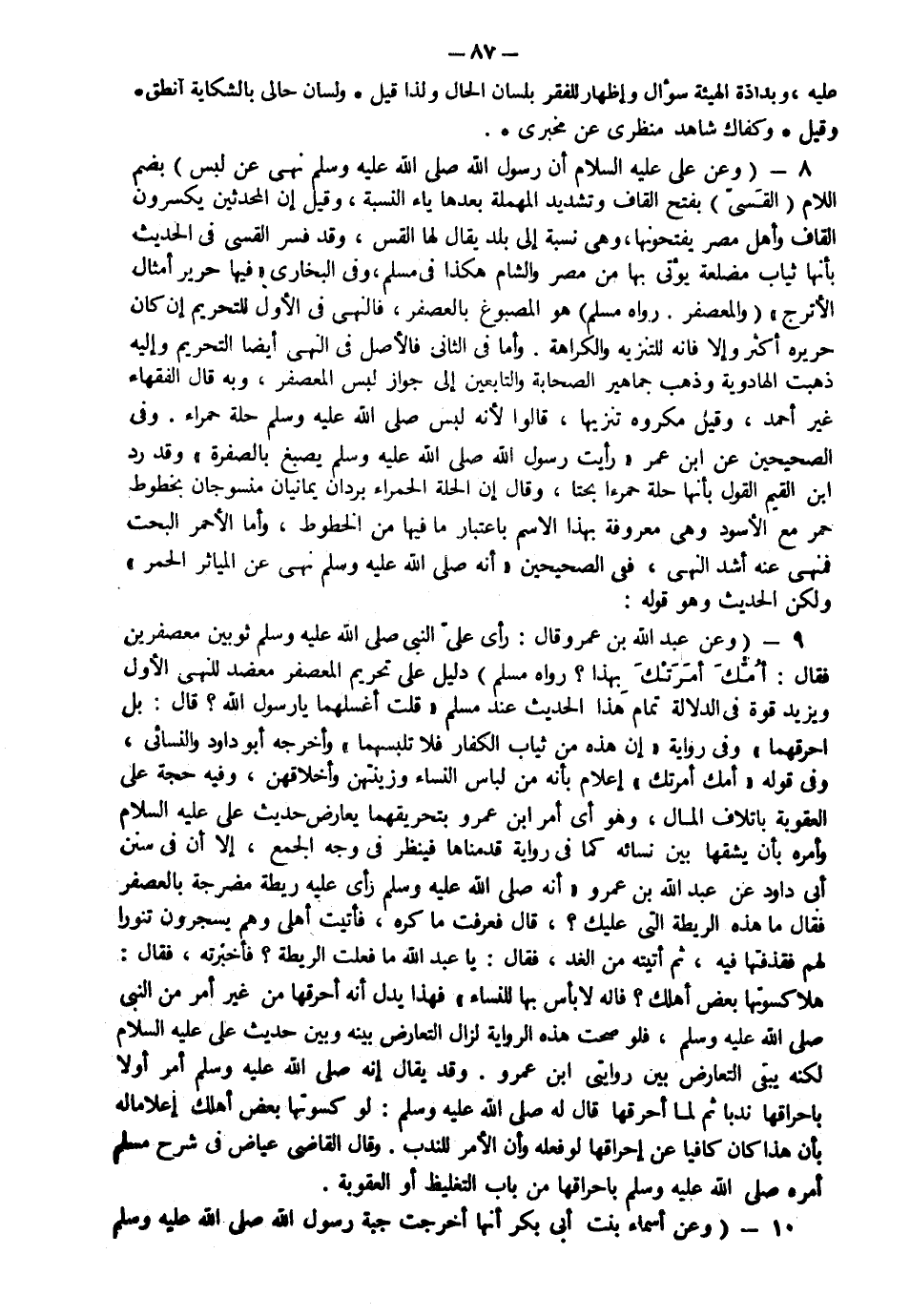 8- وعن علي رضي الله عنه أن رسول الله صلى الله عليه وآله وسلم نهى عن لُبس" بضم اللام "القَسِّي" بفتح القاف وتشديد المهملة بعدها ياء النسبة وقيل: إن المحدثين يكسرون القاف وأهل مصر يفتحونها وهي نسبة إلى بلد يقال لها القس، وقد فسر القسي في الحديث بأنها ثياب مضلعة يؤتى بها من مصر والشام هكذا في مسلم وفي البخاري فيها حرير أمثال الأترج "والمعصفر . رواه مسلم" هو المصبوغ بالعصفر.