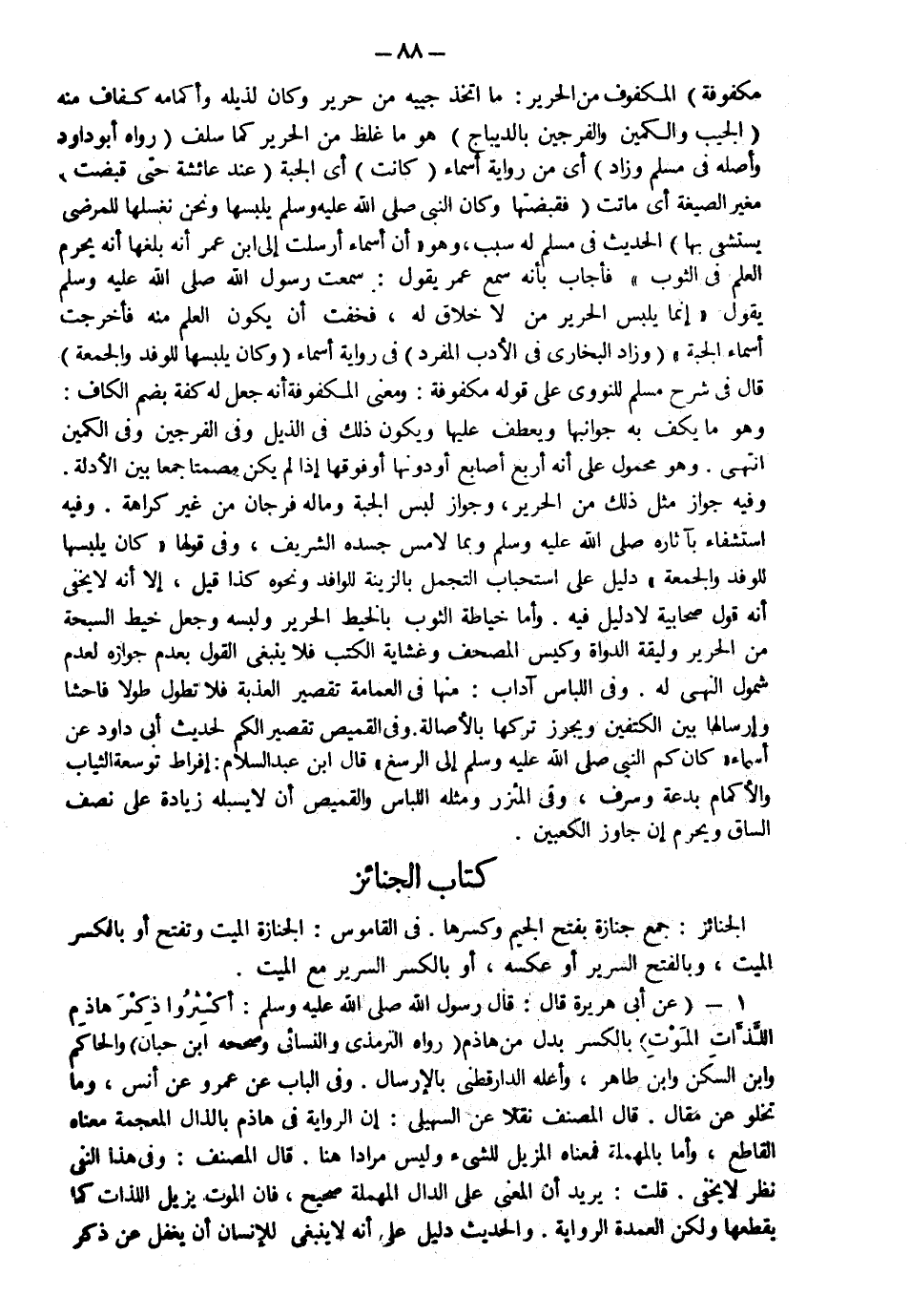 الجنائز: جمع جنازة بفتح الجيم وكسرها، في القاموس: الجنازة الميت وتفتح أو بالكسر الميت وبالفتح السرير أو عكسه أو بالكسر السرير مع الميت.