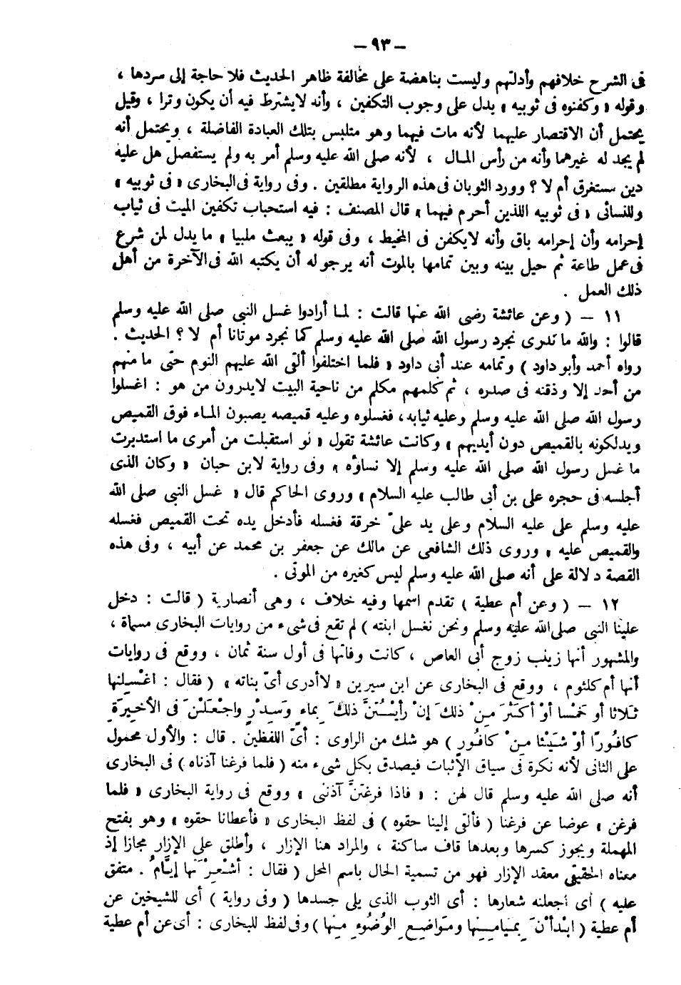 11- ( وعَنْ عائشةَ رضي الله عَنْها قالتْ: "لمّا أَرادُوا غُسْلَ النبي صَلّى الله عَلَيْهِ وَسَلّم قالوا: واللَّهِ ما نَدْري نُجَرِّد رسولَ الله صَلّى الله عَلَيْهِ وَسَلّم كما نُجَرِّدُ مَوْتانا أَمْ لا؟" الحديثَ، رواهُ أَحْمَدُ وأَبو داود.
