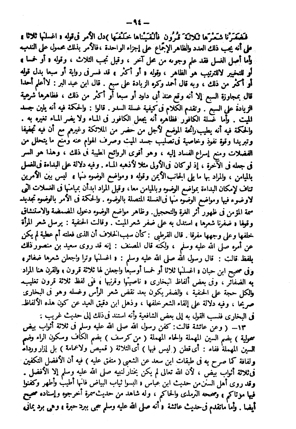 13- (وعن عائشة رضي الله عنها قالت: كفن رسول الله صَلّى الله عَلَيْهِ وَسَلّم في ثلاثة أثواب بيض سُحولية ) بضم السين المهملة والحاء المهملة ( من كُرْسُف ) بضم الكاف وسكون الراء وضم السين المهملة ففاء أي قطن ( ليس فيها ) أي الثلاثة ( قميص ولا عمامة ) بل إزار ورداء ولفافة كما صرح به في طبقات ابن سعد عن الشعبي (متفق عليه(.