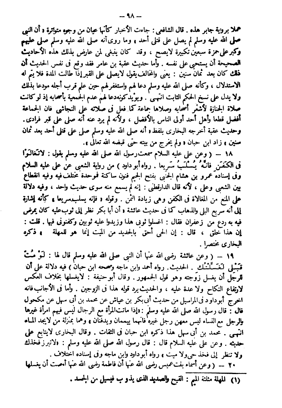 19- (وعن عائشةَ رضيَ الله عَنْها أَنَّ النّبي صَلّى الله عَلَيْهِ وَسَلّم قالَ لهَا: "لَوْمُتِّ قَبْلي لَغَسّلْتُك" الحديث، رواهُ أَحمدُ وابن مَاجَهْ وصَحّحهُ ابنُ حبِّانَ.