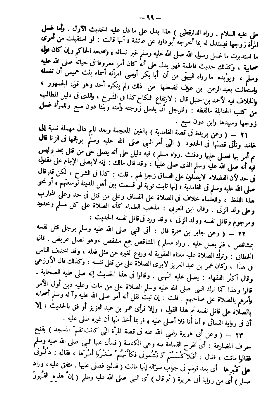 21- ( وعن بريدة في قصة الغامدية) بالغين المعجمة وبعد الميم دال مهملة نسبة إلى غامد وتأتي قصتها في الحدود (التي أمر النبي صَلّى الله عَلَيْهِ وَسَلّم برجمها في الزنا قال: ثم أمر بها فصُلِّي عليها ودفنت . رواه مسلم(.