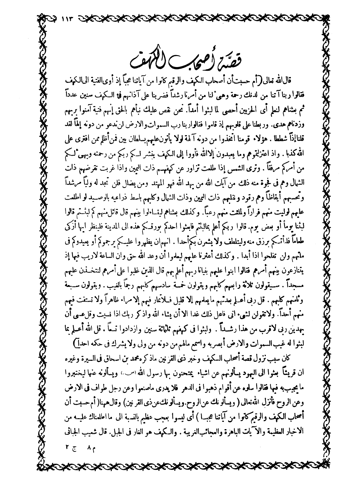 قَالَ اللَّهُ تَعَالَى أَمْ حَسِبْتَ أَنَّ أَصْحابَ الْكَهْفِ وَالرَّقِيمِ كانُوا مِنْ آياتِنا عَجَباً إِذْ أَوَى الْفِتْيَةُ إِلَى الْكَهْفِ فَقالُوا رَبَّنا آتِنا مِنْ لَدُنْكَ رَحْمَةً وَهَيِّئْ لَنا مِنْ أَمْرِنا رَشَداً فَضَرَبْنا عَلَى آذانِهِمْ فِي الْكَهْفِ سِنِينَ عَدَداً ثُمَّ بَعَثْناهُمْ لِنَعْلَمَ أَيُّ الْحِزْبَيْنِ أَحْصى لِما لَبِثُوا أَمَداً. نَحْنُ نَقُصُّ عَلَيْكَ نَبَأَهُمْ بِالْحَقِّ إِنَّهُمْ فِتْيَةٌ آمَنُوا بِرَبِّهِمْ وَزِدْناهُمْ هُدىً. وَرَبَطْنا عَلى قُلُوبِهِمْ إِذْ قامُوا فَقالُوا رَبُّنا رَبُّ السَّماواتِ وَالْأَرْضِ لَنْ نَدْعُوَا مِنْ دُونِهِ إِلهاً لَقَدْ قُلْنا إِذاً شَطَطاً. هؤُلاءِ قَوْمُنَا اتَّخَذُوا مِنْ دُونِهِ آلِهَةً لَوْلا يَأْتُونَ عَلَيْهِمْ بِسُلْطانٍ بَيِّنٍ فَمَنْ أَظْلَمُ مِمَّنِ افْتَرى عَلَى اللَّهِ كَذِباً. وَإِذِ اعْتَزَلْتُمُوهُمْ وَما يَعْبُدُونَ إِلَّا اللَّهَ فَأْوُوا إِلَى الْكَهْفِ يَنْشُرْ لَكُمْ رَبُّكُمْ مِنْ رَحْمَتِهِ وَيُهَيِّئْ لَكُمْ مِنْ أَمْرِكُمْ مِرفَقاً. وَتَرَى الشَّمْسَ إِذا طَلَعَتْ تَتَزاوَرُ عَنْ كَهْفِهِمْ ذاتَ الْيَمِينِ وَإِذا غَرَبَتْ تَقْرِضُهُمْ ذاتَ الشِّمالِ وَهُمْ فِي فَجْوَةٍ مِنْهُ ذلِكَ مِنْ آياتِ اللَّهِ مَنْ يَهْدِ اللَّهُ فَهُوَ الْمُهْتَدِ وَمن يُضْلِلْ فَلَنْ تَجِدَ لَهُ وَلِيًّا مُرْشِداً وَتَحْسَبُهُمْ أَيْقاظاً وَهُمْ رُقُودٌ وَنُقَلِّبُهُمْ ذاتَ الْيَمِينِ وَذاتَ الشِّمالِ وَكَلْبُهُمْ باسِطٌ ذِراعَيْهِ بِالْوَصِيدِ لَوِ اطَّلَعْتَ عَلَيْهِمْ لَوَلَّيْتَ مِنْهُمْ فِراراً وَلَمُلِئْتَ مِنْهُمْ رُعْباً. وَكَذلِكَ بَعَثْناهُمْ لِيَتَسائَلُوا بَيْنَهُمْ قَالَ قائِلٌ مِنْهُمْ كَمْ لَبِثْتُمْ قالُوا لَبِثْنا يَوْماً أَوْ بَعْضَ يَوْمٍ. قالُوا رَبُّكُمْ أَعْلَمُ بِما لَبِثْتُمْ فَابْعَثُوا أَحَدَكُمْ بِوَرِقِكُمْ هذِهِ إِلَى الْمَدِينَةِ فَلْيَنْظُرْ أَيُّها أَزْكى طَعاماً فَلْيَأْتِكُمْ بِرِزْقٍ مِنْهُ وَلْيَتَلَطَّفْ وَلا يُشْعِرَنَّ بِكُمْ أَحَداً. إِنَّهُمْ إِنْ يَظْهَرُوا عَلَيْكُمْ يَرْجُمُوكُمْ أَوْ يُعِيدُوكُمْ فِي مِلَّتِهِمْ وَلَنْ تُفْلِحُوا إِذاً أَبَداً. وَكَذلِكَ أَعْثَرْنا عَلَيْهِمْ لِيَعْلَمُوا أَنَّ وَعْدَ اللَّهِ حَقٌّ وَأَنَّ السَّاعَةَ لَا رَيْبَ فِيها إِذْ يَتَنازَعُونَ بَيْنَهُمْ أَمْرَهُمْ فَقالُوا ابْنُوا عَلَيْهِمْ بُنْياناً رَبُّهُمْ أَعْلَمُ بِهِمْ قَالَ الَّذِينَ غَلَبُوا عَلى أَمْرِهِمْ لَنَتَّخِذَنَّ عَلَيْهِمْ مَسْجِداً. سَيَقُولُونَ ثَلاثَةٌ رابِعُهُمْ كَلْبُهُمْ وَيَقُولُونَ خَمْسَةٌ سادِسُهُمْ كَلْبُهُمْ رَجْماً بِالْغَيْبِ. وَيَقُولُونَ سَبْعَةٌ وَثامِنُهُمْ كَلْبُهُمْ. قُلْ رَبِّي أَعْلَمُ بِعِدَّتِهِمْ مَا يَعْلَمُهُمْ إِلَّا قَلِيلٌ فَلا تُمارِ فِيهِمْ إِلَّا مِراءً ظاهِراً وَلا تَسْتَفْتِ فِيهِمْ مِنْهُمْ أَحَداً. وَلا تَقُولَنَّ لِشَيْءٍ إِنِّي فاعِلٌ ذلِكَ غَداً إِلَّا أَنْ يَشاءَ اللَّهُ وَاذْكُرْ رَبَّكَ إِذا نَسِيتَ وَقُلْ عَسى أَنْ يَهْدِيَنِ رَبِّي لِأَقْرَبَ مِنْ هَذَا رَشَداً. وَلَبِثُوا فِي كَهْفِهِمْ ثَلاثَ مِائَةٍ سِنِينَ وَازْدَادُوا تِسْعاً. قُلِ اللَّهُ أَعْلَمُ بِما لَبِثُوا لَهُ غَيْبُ السَّماواتِ وَالْأَرْضِ أَبْصِرْ بِهِ وَأَسْمِعْ مَا لَهُمْ مِنْ دُونِهِ مِنْ وَلِيٍّ وَلا يُشْرِكُ فِي حُكْمِهِ أَحَداً) 18: 9- 26 كَانَ سَبَبُ نُزُولِ قِصَّةِ أَصْحَابِ الْكَهْفِ وَخَبَرِ ذِي الْقَرْنَيْنِ مَا ذَكَرَهُ مُحَمَّدُ بْنُ إِسْحَاقَ فِي السِّيرَةِ وَغَيْرُهُ أَنَّ قُرَيْشًا بَعَثُوا إِلَى الْيَهُودِ يَسْأَلُونَهُمْ عَنْ أَشْيَاءَ يَمْتَحِنُونَ بِهَا رَسُولَ اللَّهِ صَلَّى اللَّهُ عَلَيْهِ وَسَلَّمَ وَ