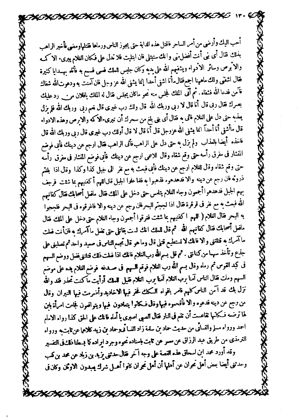 أَحَبَّ إِلَيْكَ وَأَرْضَى مِنْ أَمْرِ السَّاحِرِ فَاقْتُلْ هَذِهِ الدَّابَّةَ حَتَّى يَجُوزَ النَّاسُ وَرَمَاهَا فَقَتَلَهَا وَمَضَى فَأَخْبَرَ الرَّاهِبَ بِذَلِكَ فَقَالَ أَيْ بُنَيَّ أَنْتَ أَفْضَلُ مِنِّي وَإِنَّكَ سَتُبْتَلَى فَإِنِ ابْتُلِيتَ فَلَا تَدُلَّ عَلَيَّ فَكَانَ الْغُلَامُ يُبْرِئُ الْأَكْمَهَ والأبرص وسائر الأدواء ويشفيهم الله على يديه وَكَانَ جَلِيسٌ لِلْمَلِكِ فَعَمِيَ فَسَمِعَ بِهِ فَأَتَاهُ بِهَدَايَا كَثِيرَةٍ فَقَالَ اشْفِنِي وَلَكَ مَا هَاهُنَا أَجْمَعُ فَقَالَ مَا أَنَا أَشْفِي أَحَدًا إِنَّمَا يَشْفِي اللَّهُ عَزَّ وَجَلَّ فَإِنْ آمَنْتَ بِهِ وَدَعَوْتُ اللَّهَ شَفَاكَ فَآمَنَ فَدَعَا اللَّهَ فَشَفَاهُ. ثُمَّ أَتَى الْمَلِكَ فَجَلَسَ مِنْهُ نَحْوَ مَا كَانَ يَجْلِسُ فَقَالَ لَهُ الْمَلِكُ يَا فُلَانُ مَنْ رَدَّ عَلَيْكَ بَصَرَكَ فَقَالَ رَبِّي قَالَ أَنَا قَالَ لَا رَبِّي وَرَبُّكَ اللَّهُ قَالَ وَلَكَ رَبُّ غَيْرِي قَالَ نَعَمْ رَبِّي وَرَبُّكَ اللَّهُ فَلَمْ يَزَلْ يُعَذِّبْهُ حَتَّى دَلَّ عَلَى الْغُلَامِ فَأُتِيَ بِهِ فَقَالَ أَيْ بُنَيَّ بَلَغَ مِنْ سِحْرِكَ أَنْ تُبْرِئَ الْأَكْمَهَ وَالْأَبْرَصَ وَهَذِهِ الْأَدْوَاءَ قَالَ مَا أَشْفِي أَنَا أَحَدًا إِنَّمَا يَشْفِي اللَّهُ عَزَّ وَجَلَّ قَالَ أَنَا قَالَ لَا قَالَ أَوَلَكَ رَبٌّ غَيْرِي قَالَ رَبِّي وَرَبُّكَ اللَّهُ قَالَ فَأَخَذَهُ أَيْضًا بِالْعَذَابِ وَلَمْ يَزَلْ بِهِ حَتَّى دَلَّ عَلَى الرَّاهِبِ فَأُتِيَ الراهب فَقَالَ ارْجِعْ عَنْ دِينِكَ فَأَبَى فَوَضَعَ الْمِنْشَارَ فِي مَفْرِقِ رَأْسِهِ حَتَّى وَقَعَ شِقَّاهُ وَقَالَ لِلْأَعْمَى ارْجِعْ عَنْ دِينِكَ فَأَبَى فَوَضَعَ الْمِنْشَارَ فِي مَفْرِقِ رَأْسِهِ حَتَّى وَقَعَ شِقَّاهُ وَقَالَ لِلْغُلَامِ ارْجِعْ عَنْ دِينِكَ فَأَبَى فَبَعَثَ بِهِ مَعَ نَفَرٍ إِلَى جَبَلِ كَذَا وَكَذَا وَقَالَ إِذَا بَلَغْتُمْ ذُرْوَتَهُ فَإِنْ رَجَعَ عَنْ دِينِهِ وَإِلَّا فَدَهْدِهُوهُ فَذَهَبُوا بِهِ فَلَمَّا عَلَوُا الْجَبَلَ قَالَ اللَّهمّ اكْفِنِيهِمْ بِمَا شِئْتَ فَرَجَفَ بِهِمُ الْجَبَلُ فَدُهْدِهُوا أَجْمَعُونَ وَجَاءَ الْغُلَامُ يَتَلَمَّسُ حَتَّى دَخَلَ عَلَى الْمَلِكِ فَقَالَ مَا فَعَلَ أَصْحَابُكَ فَقَالَ كَفَانِيهِمُ اللَّهُ فَبَعَثَ بِهِ مَعَ نَفَرٍ في قرقرة فَقَالَ إِذَا لَجَجْتُمُ الْبَحْرَ فَإِنْ رَجَعَ عَنْ دِينِهِ وَإِلَّا فَأَغْرِقُوهُ فِي الْبَحْرِ فَلَجَّجُوا بِهِ الْبَحْرَ فَقَالَ الْغُلَامُ (اللَّهمّ اكْفِنِيهِمْ بِمَا شِئْتَ فَغَرِقُوا أَجْمَعُونَ وَجَاءَ الْغُلَامُ حَتَّى دَخَلَ عَلَى الْمَلِكِ فَقَالَ مَا فَعَلَ أَصْحَابُكَ فَقَالَ كَفَانِيهِمُ اللَّهُ. ثُمَّ قَالَ لِلْمَلِكِ إِنَّكَ لَسْتَ بِقَاتِلِي حَتَّى تَفْعَلَ مَا آمُرَكَ بِهِ فَإِنْ أَنْتَ فَعَلْتَ مَا آمُرُكَ بِهِ قَتَلْتَنِي وَإِلَّا فَإِنَّكَ لَا تَسْتَطِيعُ قَتْلِي قَالَ وَمَا هُوَ قَالَ تَجْمَعُ النَّاسَ فِي صَعِيدٍ وَاحِدٍ ثُمَّ تَصْلُبُنِي عَلَى جِذْعٍ وَتَأْخُذُ سَهْمًا مِنْ كِنَانَتِي. ثُمَّ قُلْ بِسْمِ اللَّهِ رَبِّ الْغُلَامِ فَإِنَّكَ إِذَا فَعَلْتَ ذَلِكَ قَتَلْتَنِي فَفَعَلَ وَوَضَعَ السَّهْمَ فِي كَبِدِ الْقَوْسِ ثُمَّ رَمَاهُ وَقَالَ بِسْمِ اللَّهِ رَبِّ الْغُلَامِ فَوَقَعَ السَّهْمُ فِي صُدْغِهِ فَوَضَعَ الْغُلَامُ يَدَهُ عَلَى مَوْضِعِ السَّهْمِ وَمَاتَ فَقَالَ الناس آمنا برب الغلام آمَنَّا بِرَبِّ الْغُلَامِ فَقِيلَ لِلْمَلِكِ أَرَأَيْتَ مَا كُنْتَ تَحْذَرُ فَقَدْ وَاللَّهِ نَزَلَ بِكَ قَدْ آمَنَ النَّاسُ كُلُّهُمْ فَأَمَرَ بِأَفْوَاهِ السِّكَكِ فَحَفَرَ فِيهَا الْأَخَادِيدَ وَأُضْرِمَتْ فِيهَا النِّيرَانُ وَقَالَ مَنْ رَجَعَ ع