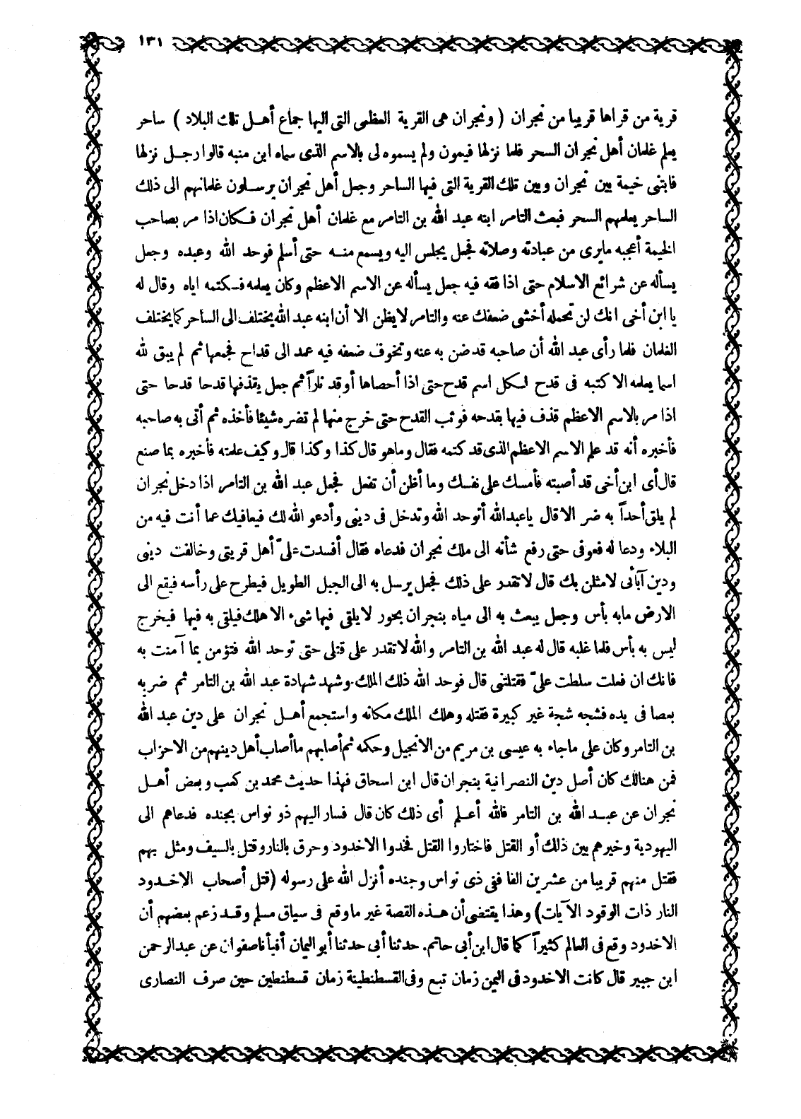 قَرْيَةٍ مِنْ قُرَاهَا قَرِيبًا مِنْ نَجْرَانَ (وَنَجْرَانُ هِيَ الْقَرْيَةُ الْعُظْمَى الَّتِي إِلَيْهَا جِمَاعُ أَهْلِ تِلْكَ الْبِلَادِ) سَاحِرٌ يُعَلِّمُ غِلْمَانَ أَهْلِ نَجْرَانَ السحر فلما نزلها فيمون وَلَمْ يُسَمُّوهُ لِي بِالِاسْمِ الَّذِي سَمَّاهُ ابْنُ مُنَبِّهٍ قَالُوا رَجُلُ نَزَلَهَا فَابْتَنَى خَيْمَةً بَيْنَ نَجْرَانَ وَبَيْنَ تِلْكَ الْقَرْيَةِ الَّتِي فِيهَا السَّاحِرُ وَجَعَلَ أَهْلُ نَجْرَانَ يُرْسِلُونَ غِلْمَانَهُمْ إِلَى ذَلِكَ الساحر يعلمهم السحر فبعث التامر ابنه عبد الله بن التامر مَعَ غِلْمَانِ أَهْلِ نَجْرَانَ فَكَانَ إِذَا مَرَّ بِصَاحِبِ الْخَيْمَةِ أَعْجَبَهُ مَا يَرَى مِنْ عِبَادَتِهِ وَصَلَاتِهِ فَجَعَلَ يَجْلِسُ إِلَيْهِ وَيَسْمَعُ مِنْهُ حَتَّى أَسْلَمَ فَوَحَّدَ اللَّهَ وَعَبَدَهُ وَجَعَلَ يَسْأَلُهُ عَنْ شَرَائِعِ الْإِسْلَامِ حَتَّى إِذَا فَقُهَ فِيهِ جَعَلَ يَسْأَلُهُ عَنِ الِاسْمِ الْأَعْظَمِ وَكَانَ يَعْلَمُهُ فَكَتَمَهُ إِيَّاهُ وَقَالَ لَهُ يَا ابْنَ أَخِي إِنَّكَ لن تحمله أخشى ضعفك عنه والتامر لا يظن الا أن ابنه عبد الله يَخْتَلِفُ إِلَى السَّاحِرِ كَمَا يَخْتَلِفُ الْغِلْمَانُ فَلَمَّا رَأَى عَبْدُ اللَّهِ أَنَّ صَاحِبَهُ قَدْ ضَنَّ بِهِ عَنْهُ وَتَخَوَّفَ ضَعْفَهُ فِيهِ عَمَدَ إِلَى قِدَاحٍ فَجَمَعَهَا ثُمَّ لَمْ يَبْقَ للَّه اسْمًا يَعْلَمُهُ إِلَّا كَتَبَهُ فِي قَدَحٍ لِكُلِّ اسْمٍ قدح حتى إذا أحصاها أو قد نَارًا ثُمَّ جَعَلَ يَقْذِفُهَا قَدَحًا قَدَحًا حَتَّى إِذَا مَرَّ بِالِاسْمِ الْأَعْظَمِ قَذَفَ فِيهَا بِقَدَحِهِ فَوَثَبَ الْقَدَحُ حَتَّى خَرَجَ مِنْهَا لَمْ تَضُرَّهُ شَيْئًا فَأَخَذَهُ ثُمَّ أَتَى بِهِ صَاحِبَهُ فَأَخْبَرَهُ أَنَّهُ قَدْ عَلِمَ الِاسْمَ الْأَعْظَمَ الَّذِي قَدْ كَتَمَهُ فَقَالَ وَمَا هُوَ قَالَ كَذَا وَكَذَا قَالَ وَكَيْفَ عَلِمْتَهُ فَأَخْبَرَهُ بِمَا صَنَعَ قَالَ أَيِ ابْنَ أَخِي قَدْ أَصَبْتَهُ فَأَمْسِكْ عَلَى نَفْسِكَ وَمَا أَظُنُّ أَنْ تَفْعَلَ فَجَعَلَ عَبْدُ الله بن التامر إِذَا دَخَلَ نَجْرَانَ لَمْ يَلْقَ أَحَدًا بِهِ ضُرٌّ إِلَّا قَالَ يَا عَبْدَ اللَّهِ أَتُوَحِّدَ اللَّهَ وَتَدْخُلَ فِي دِينِي وَأَدْعُو اللَّهَ لَكَ فيعافيك عما أنت فيه من البلاء وَدَعَا لَهُ فَعُوفِيَ حَتَّى رُفِعَ شَأْنُهُ إِلَى مَلِكِ نَجْرَانَ فَدَعَاهُ فَقَالَ أَفْسَدْتَ عَلَيَّ أَهْلَ قَرْيَتِي وَخَالَفْتَ دِينِي وَدِينَ آبَائِي لَأُمَثِّلَنَّ بِكَ قَالَ لَا تَقْدِرُ عَلَى ذَلِكَ فَجَعَلَ يُرْسِلُ بِهِ إِلَى الْجَبَلِ الطَّوِيلِ فَيُطْرَحُ عَلَى رَأْسِهِ فَيَقَعُ إِلَى الْأَرْضِ مَا بِهِ بَأْسٌ وَجَعَلَ يُبْعَثُ بِهِ إِلَى مِيَاهٍ بِنَجْرَانَ بُحُورٍ لَا يُلْقَى فِيهَا شَيْءٌ إِلَّا هَلَكَ فَيُلْقَى بِهِ فِيهَا فَيَخْرُجُ لَيْسَ بِهِ بَأْسٌ فَلَمَّا غَلَبَهُ قال له عبد الله بن التامر وَاللَّهِ لَا تَقْدِرُ عَلَى قَتْلِي حَتَّى تُوَحِّدَ اللَّهَ فَتُؤْمِنَ بِمَا آمَنْتَ بِهِ فَإِنَّكَ إِنْ فَعَلْتَ سُلِّطْتَ عَلَيَّ فَقَتَلْتَنِي قَالَ فَوَحَّدَ اللَّهَ ذَلِكَ الْمَلِكُ وَشَهِدَ شَهَادَةَ عَبْدِ اللَّهِ بْنِ التامر ثُمَّ ضَرَبَهُ بِعَصًا فِي يَدِهِ فَشَجَّهُ شَجَّةً غَيْرَ كَبِيرَةٍ فَقَتَلَهُ وَهَلَكَ الْمَلِكُ مَكَانَهُ وَاسْتَجْمَعَ أَهْلُ نَجْرَانَ عَلَى دِينِ عَبْدِ اللَّهِ بْنِ التامر وكان على ما جاء به عيسى بن مَرْيَمَ مِنَ الْإِنْجِيلِ وَحِكَمِهِ ثُمَّ أَصَابَهُمْ مَا أصاب أهل دينهم من الأحزاب فَمِنْ هُنَالِكَ كَانَ أَصْلُ دِينِ النَّصْرَانِيَّةِ بِنَجْرَانَ قَالَ ابْنُ إِسْحَاقَ فَهَذَا حَدِيثُ مُحَمَّدِ بْنِ كَعْبٍ وَبَعْضِ أَهْلِ نَجْرَانَ عَنْ عَبْدِ اللَّهِ بن التامر فاللَّه أَعْلَمُ أَيُ