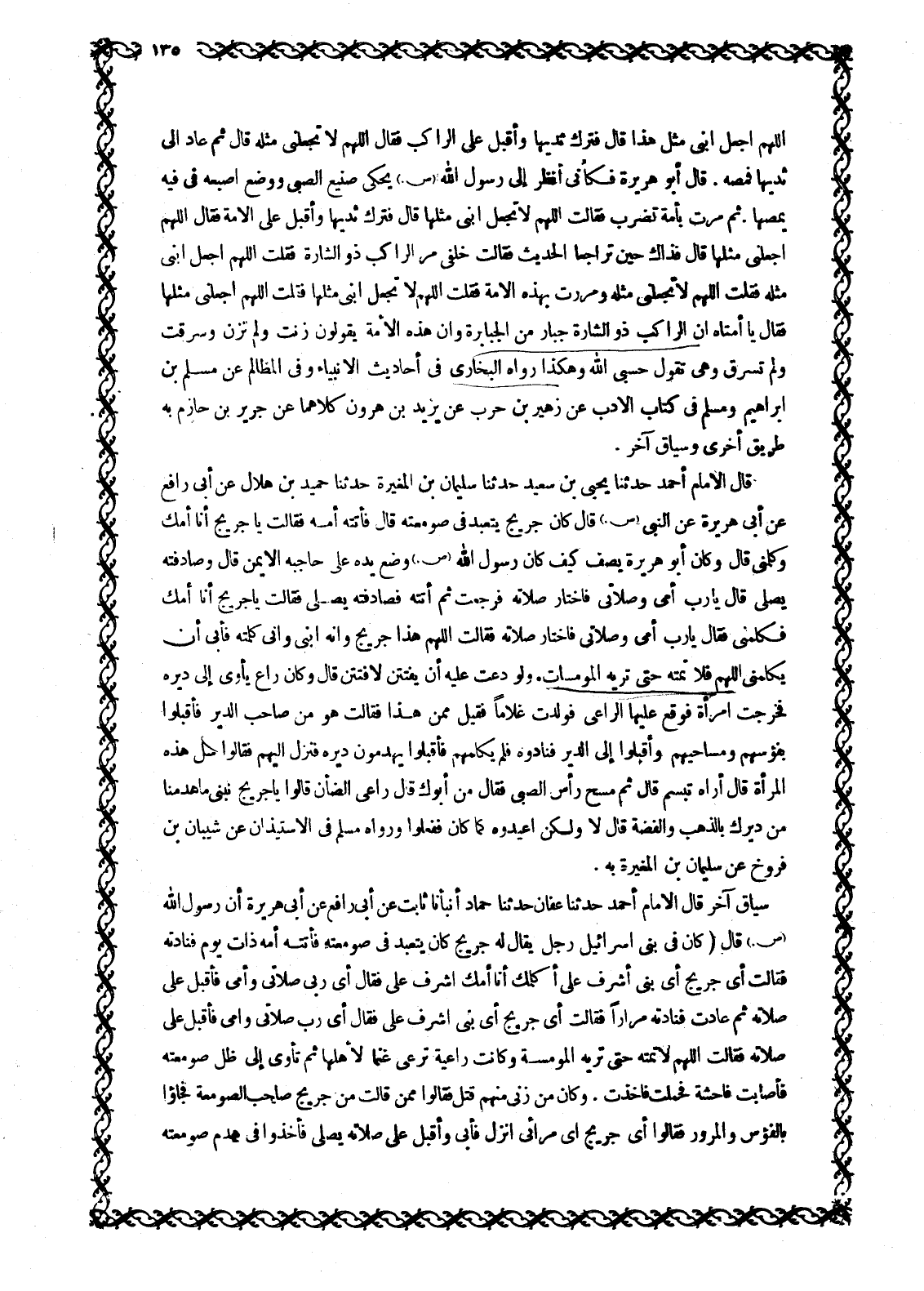 اللَّهمّ اجْعَلِ ابْنِي مِثْلَ هَذَا قَالَ فَتَرَكَ ثَدْيَهَا وَأَقْبَلَ عَلَى الرَّاكِبِ فَقَالَ اللَّهمّ لَا تَجْعَلْنِي مِثْلَهُ قَالَ ثُمَّ عَادَ إِلَى ثَدْيِهَا فَمَصَّهُ. قَالَ أَبُو هُرَيْرَةَ فَكَأَنِّي أَنْظُرُ إِلَى رَسُولِ اللَّهِ صَلَّى اللَّهُ عَلَيْهِ وَسَلَّمَ يَحْكِي صنيع الصبى ووضع إصبعه في فيه يمصها. ثم مرت بِأَمَةٍ تُضْرَبُ فَقَالَتِ اللَّهمّ لَا تَجْعَلِ ابْنِي مِثْلَهَا قَالَ فَتَرَكَ ثَدْيَهَا وَأَقْبَلَ عَلَى الْأَمَةِ فَقَالَ اللَّهمّ اجْعَلْنِي مِثْلَهَا قَالَ فَذَاكَ حِينَ تراجعا الحديث فقالت خلفي مَرَّ الرَّاكِبُ ذُو الشَّارَةِ فَقُلْتُ اللَّهمّ اجْعَلِ ابْنِي مِثْلَهُ فَقُلْتَ اللَّهمّ لَا تَجْعَلْنِي مِثْلَهُ ومررت بِهَذِهِ الْأَمَةِ فَقُلْتُ اللَّهمّ لَا تَجْعَلِ ابْنِي مِثْلَهَا فَقُلْتَ اللَّهمّ اجْعَلْنِي مِثْلَهَا فَقَالَ يَا أُمَّتَاهُ إِنَّ الرَّاكِبَ ذُو الشَّارَةِ جَبَّارٌ مِنَ الْجَبَابِرَةِ وَإِنَّ هَذِهِ الْأُمَّةَ يَقُولُونَ زَنَتْ وَلَمْ تَزْنِ وَسَرَقَتْ وَلَمْ تَسْرِقْ وَهِيَ تَقُولُ حَسْبِيَ اللَّهُ وَهَكَذَا رَوَاهُ الْبُخَارِيُّ فِي أَحَادِيثِ الْأَنْبِيَاءِ وَفِي الْمَظَالِمِ عَنْ مُسْلِمِ بْنِ ابْرَاهِيمَ وَمُسْلِمٌ فِي كِتَابِ الْأَدَبِ عَنْ زُهَيْرِ بْنِ حَرْبٍ عَنْ يَزِيدَ بْنِ هَارُونَ كِلَاهُمَا عَنْ جَرِيرِ بْنِ حَازِمٍ بِهِ طَرِيقٌ أُخْرَى وَسِيَاقٌ آخَرُ.