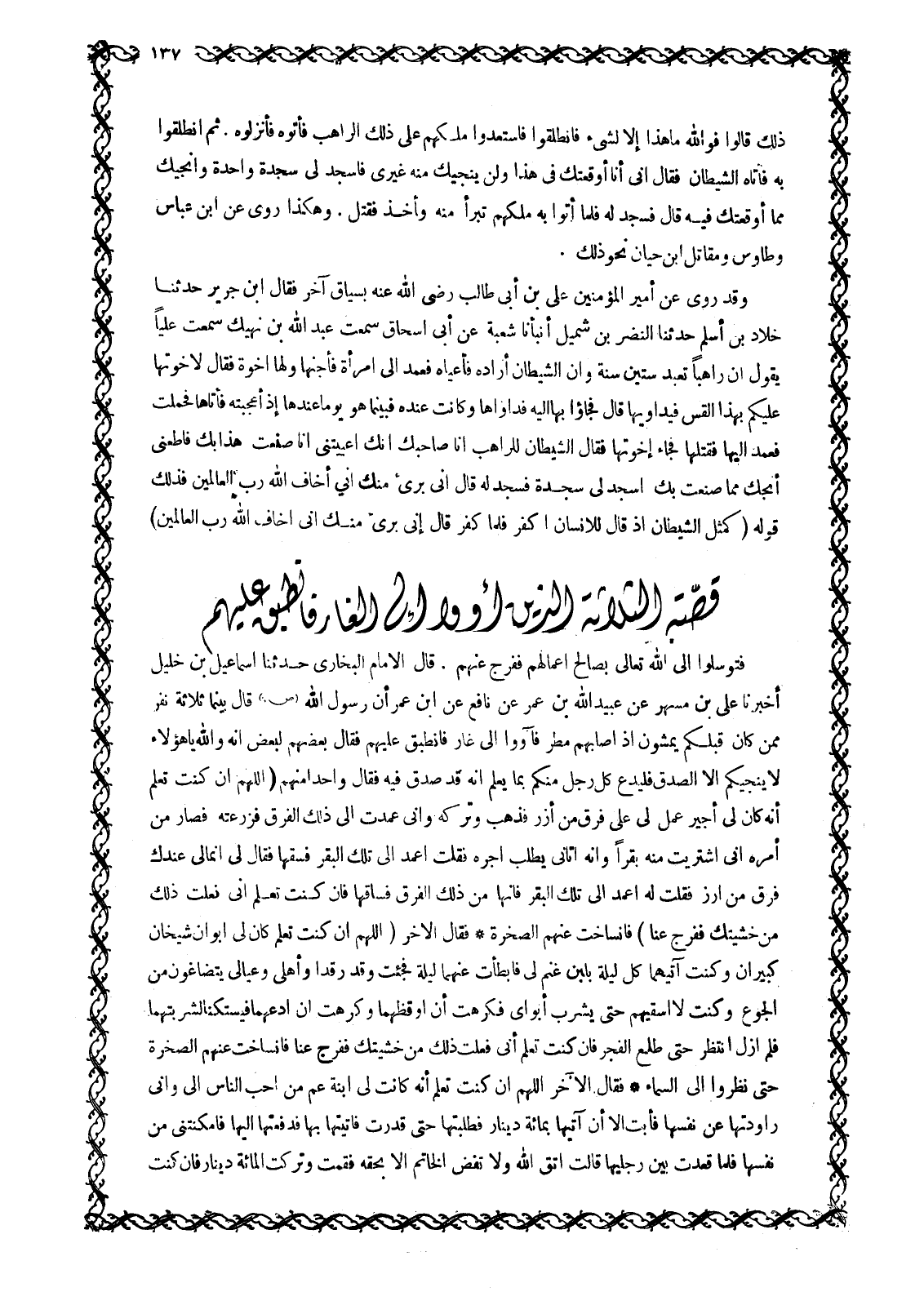 ذلك قالوا فو الله مَا هَذَا إِلَّا لِشَيْءٍ فَانْطَلَقُوا فَاسْتَعَدَوْا مَلِكَهُمْ عَلَى ذَلِكَ الرَّاهِبِ فَأَتَوْهُ فَأَنْزَلُوهُ. ثُمَّ انْطَلَقُوا به فأتاه الشيطان فقال انى أنا أَوْقَعْتُكَ فِي هَذَا وَلَنْ يُنْجِيَكَ مِنْهُ غَيْرِي فَاسْجُدْ لِي سَجْدَةً وَاحِدَةً وَأُنَجِّيَكَ مِمَّا أَوْقَعْتُكَ فِيهِ قَالَ فَسَجَدَ لَهُ فَلَمَّا أَتَوْا بِهِ مَلِكَهُمْ تَبَرَّأَ مِنْهُ وَأُخِذَ فَقُتِلَ. وَهَكَذَا رُوِيَ عن ابن عباس وطاوس ومقاتل ابن حَيَّانَ نَحْوُ ذَلِكَ وَقَدْ رُوِيَ عَنْ أَمِيرِ الْمُؤْمِنِينَ عَلِيِّ بْنِ أَبِي طَالِبٍ رَضِيَ اللَّهُ عَنْهُ بِسِيَاقٍ آخَرَ فَقَالَ ابْنُ جَرِيرٍ حَدَّثَنَا خَلَّادُ بْنُ أَسْلَمَ حَدَّثَنَا النَّضْرُ بْنُ شُمَيْلٍ أَنْبَأَنَا شُعْبَةُ عَنْ أَبِي إِسْحَاقَ سَمِعْتُ عَبْدَ اللَّهِ بْنَ نَهِيكٍ سَمِعْتُ عَلِيًّا يَقُولُ إِنَّ رَاهِبًا تَعَبَّدَ سِتِّينَ سَنَةً وَإِنَّ الشَّيْطَانَ أَرَادَهُ فَأَعْيَاهُ فَعَمَدَ إِلَى امْرَأَةٍ فَأَجَنَّهَا وَلَهَا إِخْوَةٌ فَقَالَ لِإِخْوَتِهَا عَلَيْكُمْ بِهَذَا الْقَسِّ فَيُدَاوِيَهَا قَالَ فَجَاءُوا بِهَا إِلَيْهِ فَدَاوَاهَا وَكَانَتْ عِنْدَهُ فَبَيْنَمَا هُوَ يَوْمًا عِنْدَهَا إِذْ أَعْجَبَتْهُ فَأَتَاهَا فَحَمَلَتْ فَعَمَدَ إِلَيْهَا فَقَتَلَهَا فَجَاءَ إِخْوَتُهَا فَقَالَ الشَّيْطَانُ لِلرَّاهِبِ أَنَا صَاحِبُكَ إِنَّكَ أَعْيَيْتَنِي أَنَا صَنَعْتُ هَذَا بِكَ فَأَطِعْنِي أُنَجِّكَ مِمَّا صَنَعْتُ بِكَ اسجد لي سجدة فسجد لَهُ قَالَ إِنِّي بَرِيءٌ مِنْكَ إِنِّي أَخَافُ اللَّهَ رَبَّ الْعَالَمِينَ فَذَلِكَ قَوْلُهُ (كَمَثَلِ الشَّيْطانِ إِذْ قَالَ لِلْإِنْسانِ اكْفُرْ فَلَمَّا كَفَرَ قَالَ إِنِّي بَرِيءٌ مِنْكَ إِنِّي أَخافُ اللَّهَ رَبَّ الْعالَمِينَ) 59: 16