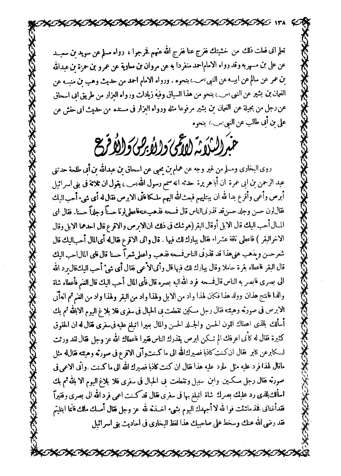 رَوَى الْبُخَارِيُّ وَمُسْلِمٌ مِنْ غَيْرِ وَجْهٍ عَنْ هَمَّامِ بْنِ يَحْيَى عَنْ إِسْحَاقَ بْنِ عَبْدِ اللَّهِ بْنِ أَبِي طَلْحَةَ حَدَّثَنِي عَبْدُ الرَّحْمَنِ بْنُ أَبِي عَمْرَةَ أَنَّ أَبَا هُرَيْرَةَ حَدَّثَهُ أَنَّهُ سَمِعَ رَسُولَ اللَّهِ صَلَّى اللَّهُ عَلَيْهِ وَسَلَّمَ يَقُولُ إِنَّ ثَلَاثَةً فِي بَنِي إِسْرَائِيلَ أَبْرَصُ وَأَعْمَى وَأَقْرَعُ بَدَا للَّه أَنْ يَبْتَلِيَهُمْ فَبَعَثَ الله اليهم ملكا فأتى الأبرص فقال له أَيُّ شَيْءٍ أَحَبُّ إِلَيْكَ فَقَالَ لَوْنٌ حَسَنٌ وَجِلْدٌ حَسَنٌ قَدْ قَذِرَنِي النَّاسُ قَالَ فَمَسَحَهُ فَذَهَبَ عَنْهُ فَأُعْطِيَ لَوْنًا حَسَنًا وَجِلْدًا حَسَنًا. فَقَالَ أَيُّ الْمَالِ أَحَبُّ الَيْكَ قَالَ الْإِبِلُ أَوْ قَالَ الْبَقَرُ (هُوَ شَكٌّ فِي ذَلِكَ أَنَّ الْأَبْرَصَ وَالْأَقْرَعَ قَالَ أَحَدُهُمَا الْإِبِلُ وَقَالَ الْآخَرُ الْبَقَرُ) فَأُعْطِيَ نَاقَةً عُشَرَاءَ فَقَالَ يُبَارَكُ لك فيها. قال وأتى الأقرع فقال له أي المال أَحَبُّ إِلَيْكَ قَالَ شَعْرٌ حَسَنٌ وَيَذْهَبُ عَنِّي هذا قد فذرني النَّاسُ فَمَسَحَهُ فَذَهَبَ وَأُعْطِيَ شَعْرًا حَسَنًا قَالَ فَأَيُّ الْمَالِ أَحَبُّ الَيْكَ قَالَ الْبَقَرُ فَأَعْطَاهُ بقرة حاملا وقال يبارك لك فيها قال وَأَتَى الْأَعْمَى فَقَالَ أَيُّ شَيْءٍ أَحَبُّ الَيْكَ قَالَ يَرُدُّ اللَّهُ إِلَيَّ بَصَرِي فَأُبْصِرُ بِهِ النَّاسَ قَالَ فَمَسَحَهُ فَرَدَّ اللَّهُ إِلَيْهِ بَصَرَهُ قَالَ فَأَيُّ الْمَالِ أَحَبُّ الَيْكَ قَالَ الْغَنَمُ فَأَعْطَاهُ شَاةً وَالِدًا فَأَنْتَجَ هَذَانِ وَوَلَدَ هَذَا فَكَانَ لِهَذَا وَادٍ مِنَ الْإِبِلِ وَلِهَذَا وَادٍ مِنَ الْبَقَرِ وَلِهَذَا وَادٍ مِنَ الْغَنَمِ ثُمَّ إِنَّهُ أَتَى الْأَبْرَصَ فِي صُورَتِهِ وَهَيْئَتِهِ فَقَالَ رَجُلٌ مِسْكِينٌ تَقَطَّعَتْ بِيَ الْحِبَالُ فِي سَفَرِي فَلَا بَلَاغَ الْيَوْمَ إِلَّا باللَّه ثُمَّ بِكَ أَسْأَلُكَ بِالَّذِي أَعْطَاكَ اللَّوْنَ الْحَسَنَ وَالْجِلْدَ الْحَسَنَ وَالْمَالَ بَعِيرًا أَتَبَلَّغُ عَلَيْهِ فِي سَفَرِي فَقَالَ لَهُ إِنَّ الْحُقُوقَ كَثِيرَةٌ فَقَالَ لَهُ كَأَنِّي أَعْرِفُكَ أَلَمْ تَكُنْ أَبْرَصَ يَقْذَرُكَ النَّاسُ فَقِيرًا فَأَعْطَاكَ اللَّهُ عَزَّ وَجَلَّ فَقَالَ لَقَدْ وَرِثْتُ لِكَابِرٍ عَنْ كَابِرٍ فَقَالَ إِنْ كُنْتَ كَاذِبًا فَصَيَّرَكَ اللَّهُ إِلَى مَا كُنْتَ وَأَتَى الْأَقْرَعُ في صورته وهيئته فقال له مثل ما قَالَ لِهَذَا فَرَدَّ عَلَيْهِ مِثْلَ مَا رَدَّ عَلَيْهِ هَذَا فَقَالَ إِنْ كُنْتَ كَاذِبًا فَصَيَّرَكَ اللَّهُ إِلَى مَا كُنْتَ وَأَتَى الْأَعْمَى فِي صُورَتِهِ فَقَالَ رَجُلٌ مِسْكِينٌ وَابْنُ سَبِيلٍ وَتَقَطَّعَتْ بِيَ الْحِبَالُ فِي سَفَرِي فَلَا بَلَاغَ الْيَوْمَ إِلَّا باللَّه ثُمَّ بِكَ أَسْأَلُكَ بِالَّذِي رَدَّ عَلَيْكَ بَصَرَكَ شَاةً أَتَبَلَّغُ بِهَا فِي سَفَرِي فَقَالَ قَدْ كُنْتُ أَعْمَى فَرَدَّ اللَّهُ إِلَيَّ بَصَرِي وَفَقِيرًا فَقَدْ أَغْنَانِي فَخُذْ مَا شِئْتَ فو الله لَا أَجْهَدُكَ الْيَوْمَ بِشَيْءٍ أَخَذْتَهُ للَّه عَزَّ وَجَلَّ فَقَالَ أَمْسِكْ مَالَكَ فَإِنَّمَا ابْتُلِيتُمْ فَقَدْ رَضِيَ اللَّهُ عَنْكَ وَسَخِطَ عَلَى صَاحِبَيْكَ هَذَا لَفْظُ الْبُخَارِيِّ فِي أَحَادِيثِ بَنِي إِسْرَائِيلَ