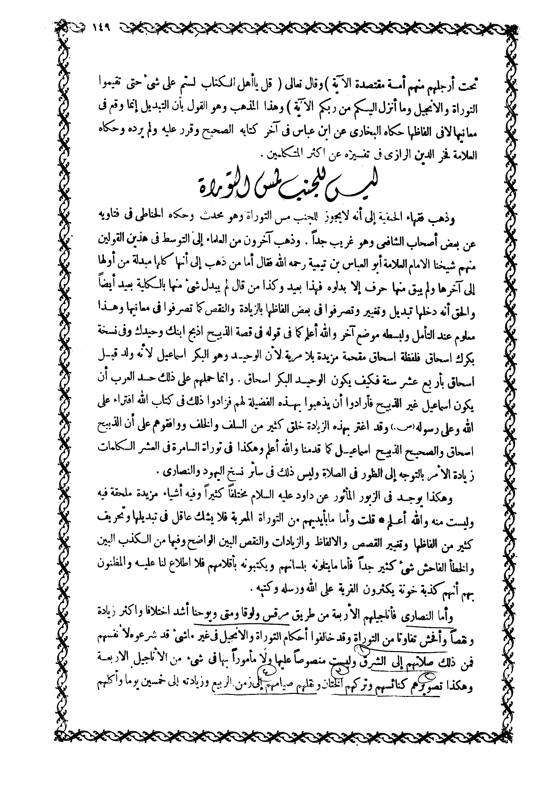وَذَهَبَ فُقَهَاءُ الْحَنَفِيَّةِ إِلَى أَنَّهُ لَا يَجُوزُ لِلْجُنُبِ مَسُّ التَّوْرَاةِ وَهُوَ مُحْدِثٌ وَحَكَاهُ الْحَنَّاطِيُّ فِي فَتَاوِيهِ عَنْ بَعْضِ أَصْحَابِ الشَّافِعِيِّ وَهُوَ غَرِيبٌ جِدًّا. وَذَهَبَ آخَرُونَ مِنَ الْعُلَمَاءِ إِلَى التَّوَسُّطِ فِي هَذَيْنَ الْقَوْلَيْنِ مِنْهُمْ شَيْخُنَا الْإِمَامُ الْعَلَّامَةُ أَبُو الْعَبَّاسِ بْنُ تَيْمِيَةَ رَحِمَهُ اللَّهُ فَقَالَ أَمَّا مَنْ ذَهَبَ إِلَى أَنَّهَا كُلَّهَا مُبَدَّلَةٌ مِنْ أَوَّلِهَا إِلَى آخِرِهَا وَلَمْ يَبْقَ مِنْهَا حَرْفٌ إِلَّا بِدَّلُوهُ فَهَذَا بِعِيدٌ وَكَذَا مَنْ قَالَ لَمْ يُبَدَّلْ شَيْءٌ مِنْهَا بِالْكُلِّيَّةِ بَعِيدٌ أَيْضًا وَالْحَقُّ أَنَّهُ دَخَلَهَا تَبْدِيلٌ وَتَغْيِيرٌ وَتَصَرَّفُوا فِي بَعْضِ أَلْفَاظِهَا بِالزِّيَادَةِ وَالنَّقْصِ كَمَا تَصَرَّفُوا فِي مَعَانِيهَا وَهَذَا مَعْلُومٌ عِنْدَ التَّأَمُّلِ وَلِبَسْطِهِ مَوْضِعٌ آخَرُ وَاللَّهُ أعلم كما في قوله فِي قِصَّةِ الذَّبِيحِ اذْبَحِ ابْنَكَ وَحِيدَكَ وَفِي نُسْخَةٍ بِكْرَكَ إِسْحَاقُ فَلَفْظَةُ إِسْحَاقَ مُقْحَمَةٌ مَزِيدَةٌ بِلَا مِرْيَةٍ لِأَنَّ الْوَحِيدَ وَهُوَ الْبِكْرُ إِسْمَاعِيلُ لأنه ولد قبل إسحاق بأربع عشر سَنَةً فَكَيْفَ يَكُونُ الْوَحِيدُ الْبِكْرَ إِسْحَاقُ. وَإِنَّمَا حَمَلَهُمْ عَلَى ذَلِكَ حَسَدُ الْعَرَبِ أَنْ يَكُونَ إسماعيل غير الذَّبِيحُ فَأَرَادُوا أَنْ يَذْهَبُوا بِهَذِهِ الْفَضِيلَةِ لَهُمْ فَزَادُوا ذَلِكَ فِي كِتَابِ اللَّهِ افْتِرَاءً عَلَى الله وعلى رسوله صلّى الله عليه وسلّم وَقَدِ اغْتَرَّ بِهَذِهِ الزِّيَادَةِ خَلْقٌ كَثِيرٌ مِنَ السَّلَفِ وَالْخَلْفِ وَوَافَقُوهُمْ عَلَى أَنَّ الذَّبِيحَ إِسْحَاقُ والصحيح الذَّبِيحَ إِسْمَاعِيلُ كَمَا قَدَّمْنَا وَاللَّهُ أَعْلَمُ وَهَكَذَا فِي تَوْرَاةِ السَّامِرَةِ فِي الْعَشْرِ الْكَلِمَاتِ زِيَادَةُ الْأَمْرِ بِالتَّوَجُّهِ إِلَى الطُّورِ فِي الصَّلَاةِ وَلَيْسَ ذَلِكَ فِي سَائِرِ نُسَخِ الْيَهُودِ وَالنَّصَارَى.