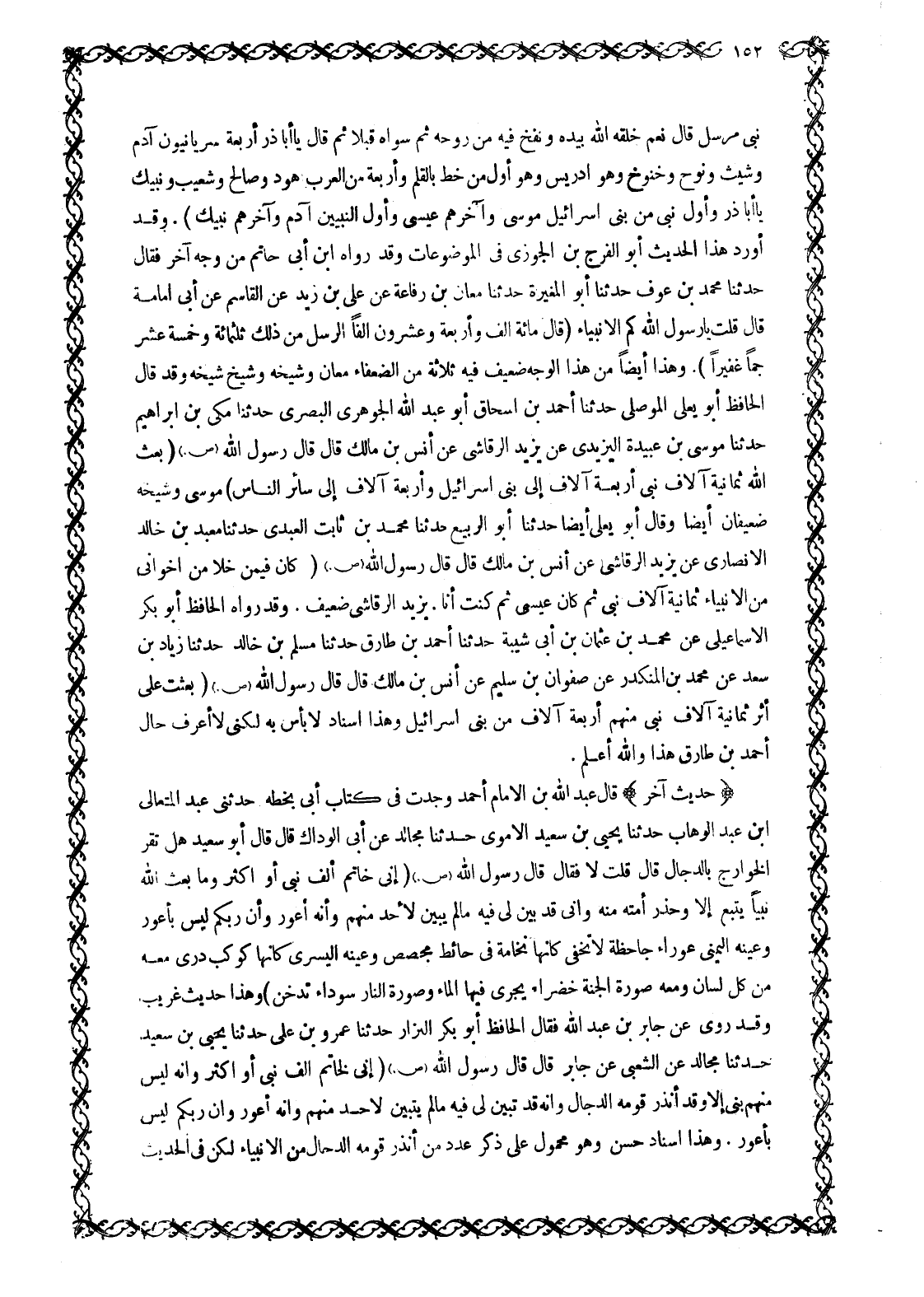 نَبِيٌّ مُرْسَلٌ قَالَ نَعَمْ خَلَقَهُ اللَّهُ بِيَدِهِ وَنَفَخَ فِيهِ مِنْ رُوحِهِ ثُمَّ سَوَّاهُ قَبْلًا ثُمَّ قَالَ يَا أَبَا ذَرٍّ أَرْبَعَةٌ سُرْيَانِيُّونَ آدَمُ وَشِيثٌ وَنُوحٌ وَخَنُوخُ وَهُوَ إِدْرِيسُ وَهُوَ أَوَّلُ مَنْ خَطَّ بِالْقَلَمِ وَأَرْبَعَةٌ مِنَ الْعَرَبِ هُودٌ وَصَالِحٌ وَشُعَيْبٌ وَنَبِيُّكَ يَا أَبَا ذَرٍّ وَأَوَّلُ نَبِيٍّ مِنْ بَنِي إِسْرَائِيلَ مُوسَى وَآخِرُهُمْ عِيسَى وَأَوَّلُ النَّبِيِّينَ آدَمُ وَآخِرُهُمْ نَبِيُّكَ) . وَقَدْ أورد هذا الحديث أَبُو الْفَرَجِ بْنُ الْجَوْزِيِّ فِي الْمَوْضُوعَاتِ وَقَدْ رَوَاهُ ابْنُ أَبِي حَاتِمٍ مِنْ وَجْهٍ آخَرَ فَقَالَ حَدَّثَنَا مُحَمَّدُ بْنُ عَوْفٍ حَدَّثَنَا أَبُو الْمُغِيرَةِ حَدَّثَنَا مَعَانُ بن رفاعة عن على بن زيد عن الْقَاسِمِ عَنْ أَبِي أُمَامَةَ قَالَ قُلْتُ يَا رَسُولَ اللَّهِ كَمِ الْأَنْبِيَاءُ (قَالَ مِائَةُ أَلْفٍ وَأَرْبَعَةٌ وَعِشْرُونَ أَلْفًا الرُّسُلُ مِنْ ذَلِكَ ثَلَاثُمِائَةٍ وَخَمْسَةَ عَشَرَ جَمًّا غَفِيرًا) . وَهَذَا أَيْضًا مِنْ هَذَا الْوَجْهِ ضَعِيفٌ فِيهِ ثَلَاثَةٌ مِنَ الضُّعَفَاءِ مُعَانٌ وَشَيْخُهُ وَشَيْخُ شَيْخِهِ وَقَدْ قَالَ الْحَافِظُ أَبُو يَعْلَى الْمَوْصِلِيُّ حَدَّثَنَا أَحْمَدُ بْنُ إِسْحَاقَ أَبُو عَبْدِ اللَّهِ الْجَوْهَرِيُّ الْبَصْرِيُّ حَدَّثَنَا مَكِّيُّ بْنُ إِبْرَاهِيمَ حَدَّثَنَا مُوسَى بْنُ عبيدة اليزيدي عَنْ يَزِيدَ الرَّقَاشِيِّ عَنْ أَنَسِ بْنِ مَالِكٍ قَالَ قَالَ رَسُولُ اللَّهِ صَلَّى اللَّهُ عَلَيْهِ وَسَلَّمَ (بَعَثَ اللَّهُ ثَمَانِيَةَ آلَافِ نَبِيٍّ أَرْبَعَةَ آلَافٍ إِلَى بَنِي إِسْرَائِيلَ وَأَرْبَعَةَ آلَافٍ إِلَى سائر الناس) موسى وشيخه ضعيفان أيضا وَقَالَ أَبُو يَعْلَى أَيْضًا حَدَّثَنَا أَبُو الرَّبِيعِ حَدَّثَنَا مُحَمَّدُ بْنُ ثَابِتٍ الْعَبْدِيُّ حَدَّثَنَا مَعْبَدُ بْنُ خَالِدٍ الْأَنْصَارِيُّ عَنْ يَزِيدَ الرَّقَاشِيِّ عَنْ أَنَسِ بْنِ مَالِكٍ قَالَ قَالَ رَسُولُ اللَّهِ صَلَّى اللَّهُ عَلَيْهِ وَسَلَّمَ (كَانَ فِيمَنْ خَلَا مِنْ إِخْوَانِي مِنَ الْأَنْبِيَاءِ ثَمَانِيَةُ آلَافِ نَبِيٍّ ثم كان عيسى ثُمَّ كُنْتُ أَنَا. يَزِيدُ الرَّقَاشِيُّ ضَعِيفٌ. وَقَدْ رَوَاهُ الْحَافِظُ أَبُو بَكْرٍ الْإِسْمَاعِيلِيُّ عَنْ مُحَمَّدِ بْنُ عُثْمَانَ بْنِ أَبِي شَيْبَةَ حَدَّثَنَا أحمد بْنُ طَارِقٍ حَدَّثَنَا مُسْلِمُ بْنُ خَالِدٍ حَدَّثَنَا زِيَادُ بْنُ سَعْدٍ عَنْ مُحَمَّدِ بْنِ الْمُنْكَدِرِ عَنْ صَفْوَانَ بْنِ سُلَيْمٍ عَنْ أَنَسِ بْنِ مَالِكٍ قَالَ قَالَ رَسُولُ اللَّهِ صَلَّى اللَّهُ عَلَيْهِ وَسَلَّمَ (بُعِثْتُ عَلَى إِثْرِ ثَمَانِيَةِ آلَافِ نَبِيٍّ مِنْهُمْ أَرْبَعَةُ آلَافٍ مِنْ بَنِي إِسْرَائِيلَ وَهَذَا إِسْنَادٌ لَا بَأْسَ بِهِ لَكِنِّي لَا أَعْرِفُ حَالَ أَحْمَدَ بْنِ طَارِقٍ هَذَا وَاللَّهُ أَعْلَمُ.