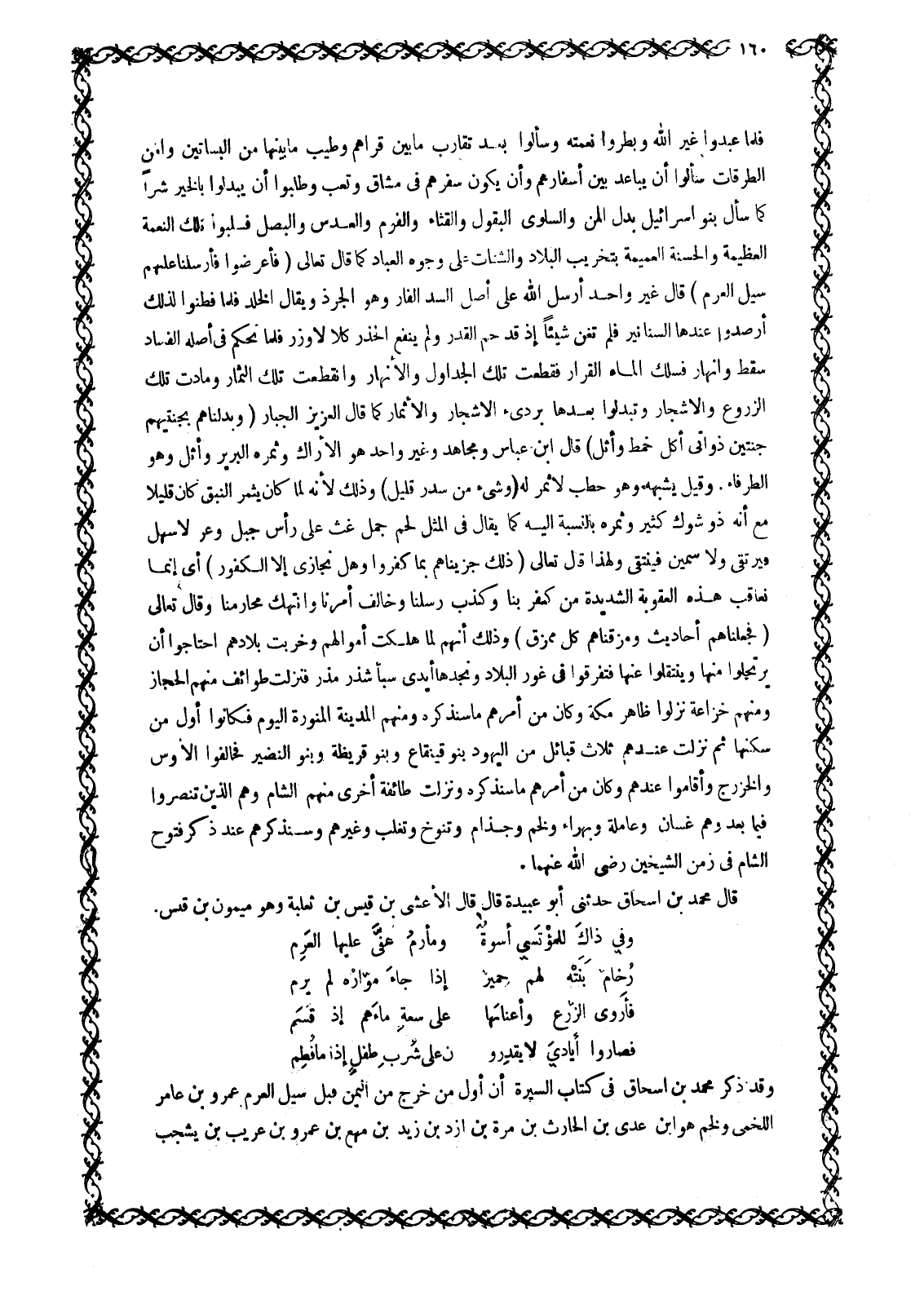 فَلَمَّا عَبَدُوا غَيْرَ اللَّهِ وَبَطَرُوا نِعْمَتَهُ وَسَأَلُوا بَعْدَ تَقَارُبِ مَا بَيْنَ قُرَاهُمْ وَطِيبِ مَا بَيْنَهَا مِنَ الْبَسَاتِينِ وَأَمْنِ الطُّرُقَاتِ سَأَلُوا أَنْ يُبَاعَدَ بَيْنَ أَسْفَارِهِمْ وَأَنْ يَكُونَ سَفَرُهُمْ فِي مَشَاقٍّ وَتَعَبٍ وَطَلَبُوا أَنْ يُبَدَّلُوا بِالْخَيْرِ شَرًّا كَمَا سَأَلَ بَنُو إِسْرَائِيلَ بَدَلَ الْمَنِّ وَالسَّلْوَى الْبُقُولَ وَالْقِثَّاءَ وَالْفُومَ وَالْعَدَسَ وَالْبَصَلَ فَسُلِبُوا تِلْكَ النعمة العظيمة والحسنة العميمة بتخريب البلاد والشنات عَلَى وُجُوهِ الْعِبَادِ كَمَا قَالَ تَعَالَى فَأَعْرَضُوا فَأَرْسَلْنا عَلَيْهِمْ سَيْلَ الْعَرِمِ 34: 16 قَالَ غَيْرُ وَاحِدٍ أَرْسَلَ اللَّهُ عَلَى أَصْلِ السَّدِّ الْفَارَ وَهُوَ الْجُرَذُ وَيُقَالَ الْخُلْدُ فَلَمَّا فَطِنُوا لِذَلِكَ أَرْصَدُوا عِنْدَهَا السَّنَانِيرَ فَلَمْ تُغْنِ شَيْئًا إِذْ قَدْ حُمَّ الْقَدَرُ وَلَمْ يَنْفَعِ الحذر كلا لا وزر فلما نحكم فِي أَصْلِهِ الْفَسَادُ سَقَطَ وَانْهَارَ فَسَلَكَ الْمَاءُ الْقَرَارَ فَقُطِعَتْ تِلْكَ الْجَدَاوِلُ وَالْأَنْهَارُ وَانْقَطَعَتْ تِلْكَ الثمار ومادت تِلْكَ الزُّرُوعُ وَالْأَشْجَارُ وَتَبَدَّلُوا بَعْدَهَا بِرَدِيءِ الْأَشْجَارِ وَالْأَثْمَارِ كَمَا قَالَ الْعَزِيزُ الْجَبَّارُ (وَبَدَّلْناهُمْ بِجَنَّتَيْهِمْ جَنَّتَيْنِ ذَواتَيْ أُكُلٍ خَمْطٍ وَأَثْلٍ) 34: 16 قَالَ ابْنُ عَبَّاسٍ وَمُجَاهِدٌ وَغَيْرُ وَاحِدٍ هُوَ الْأَرَاكُ وَثَمَرُهُ الْبَرِيرُ وَأَثْلٍ وَهُوَ الطَّرْفَاءُ. وَقِيلَ يُشْبِهُهُ وَهُوَ حَطَبٌ لَا ثَمَرَ لَهُ (وَشَيْءٍ من سِدْرٍ قَلِيلٍ) 34: 16 وَذَلِكَ لِأَنَّهُ لَمَّا كَانَ يُثْمِرُ النَّبْقُ كَانَ قَلِيلًا مَعَ أَنَّهُ ذُو شَوْكٍ كَثِيرٍ وَثَمَرُهُ بِالنِّسْبَةِ إِلَيْهِ كَمَا يُقَالَ فِي الْمَثَلِ لَحْمُ جَمَلٍ غَثٍّ عَلَى رَأْسِ جَبَلٍ وَعْرٍ لَا سَهْلَ فَيُرْتَقَى وَلَا سَمِينَ فَيُنْتَقَى وَلِهَذَا قَالَ تَعَالَى ذلِكَ جَزَيْناهُمْ بِما كَفَرُوا وَهَلْ نُجازِي إِلَّا الْكَفُورَ 34: 17 أَيْ إِنَّمَا نُعَاقِبُ هَذِهِ الْعُقُوبَةَ الشَّدِيدَةَ مَنْ كَفَرَ بِنَا وَكَذَّبَ رُسُلَنَا وَخَالَفَ أَمْرَنَا وَانْتَهَكَ مَحَارِمَنَا وَقَالَ تَعَالَى فَجَعَلْناهُمْ أَحادِيثَ وَمَزَّقْناهُمْ كُلَّ مُمَزَّقٍ 34: 19 وَذَلِكَ أَنَّهُمْ لَمَّا هَلَكَتْ أَمْوَالُهُمْ وَخَرِبَتْ بِلَادُهُمُ احْتَاجُوا أَنْ يَرْتَحِلُوا مِنْهَا وَيَنْتَقِلُوا عَنْهَا فَتَفَرَّقُوا فِي غَوْرِ الْبِلَادِ وَنَجْدِهَا أَيْدِيَ سَبَأٍ شَذَرَ مذر فنزلت طوائف منهم الحجاز ومنهم خُزَاعَةُ نَزَلُوا ظَاهِرِ مَكَّةَ وَكَانَ مِنْ أَمْرِهِمْ ما سنذكره ومنهم المدينة المنورة الْيَوْمَ فَكَانُوا أَوَّلَ مَنْ سَكَنَهَا ثُمَّ نَزَلَتْ عِنْدَهُمْ ثَلَاثُ قَبَائِلَ مِنَ الْيَهُودِ بَنُو قَيْنُقَاعَ وبنو قريظة وبنو النضير فخالفوا الْأَوْسَ وَالْخَزْرَجَ وَأَقَامُوا عِنْدَهُمْ وَكَانَ مِنْ أَمْرِهِمْ مَا سَنَذْكُرُهُ وَنَزَلَتْ طَائِفَةٌ أُخْرَى مِنْهُمُ الشَّامَ وَهُمُ الَّذِينَ تَنَصَّرُوا فِيمَا بَعْدُ وَهُمْ غَسَّانُ وَعَامِلَةُ وَبَهْرَاءُ وَلَخْمٌ وَجُذَامٌ وَتَنُوخُ وَتَغْلِبُ وَغَيْرُهُمْ وَسَنَذْكُرُهُمْ عِنْدَ ذِكْرِ فُتُوحِ الشَّامِ فِي زَمَنِ الشَّيْخَيْنِ رَضِيَ اللَّهُ عَنْهُمَا قَالَ مُحَمَّدُ بْنُ إِسْحَاقَ حَدَّثَنِي أَبُو عُبَيْدَةَ قَالَ قَالَ الْأَعْشَى بْنُ قَيْسِ بْنِ ثَعْلَبَةَ وَهُوَ مَيْمُونُ بْنُ قيس.