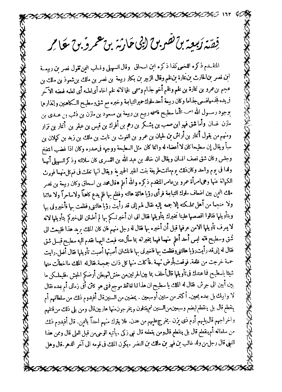 الْمُتَقَدِّمِ ذِكْرُهُ اللَّخْمِيُّ كَذَا ذَكَرَهُ ابْنُ إِسْحَاقَ وَقَالَ السُّهَيْلِيُّ وَنُسَابُّ اليمن تقول نصر بن ربيعة ابن نَصْرِ بْنِ الْحَارِثِ بْنِ نُمَارَةَ بْنِ لَخْمٍ وَقَالَ الزُّبَيْرُ بْنُ بَكَّارٍ رَبِيعَةُ بْنُ نَصْرِ بْنِ مَالِكِ بْنِ شَعْوَذِ بْنِ مَالِكِ بْنِ عَجْمِ بْنِ عَمْرِو بْنِ نُمَارَةَ بْنِ لَخْمٍ وَلَخْمٌ أَخُو جُذَامٍ وَسُمِّي لَخْمًا لِأَنَّهُ لَخَمَ أَخَاهُ أَيْ لَطَمَهُ فَعَضَّهُ الْآخَرُ فِي يَدِهِ فَجَذَمَهَا فَسُمِّيَ جُذَامًا وَكَانَ رَبِيعَةُ أَحَدَ مُلُوكِ حِمْيَرَ التَّبَابِعَةِ وَخَبَرُهُ مَعَ شِقٍّ وَسَطِيحٍ الْكَاهِنَيْنِ وَإِنْذَارُهُمَا بِوُجُودِ رَسُولِ اللَّهِ صَلَّى اللَّهُ عَلَيْهِ وَسَلَّمَ أَمَّا سَطِيحٌ فَاسْمُهُ رَبِيعُ بْنُ رَبِيعَةَ بْنِ مَسْعُودِ بْنِ مَازِنِ بْنِ ذِئْبِ بْنِ عدي بن مازن غَسَّانَ وَأَمَّا شِقٌّ فَهُوَ ابْنُ صَعْبِ بْنِ يشكر بن رهم بن أفرك بن قيس بْنِ عَبْقَرَ بْنِ أَنْمَارِ بْنِ نِزَارٍ وَمِنْهُمْ مَنْ يَقُولُ أَنْمَارُ بْنُ أَرَاشِ بْنِ لَحْيَانَ بن عمرو بن الغوث بن نابت بن مالك بن زبد بْنِ كَهْلَانَ بْنِ سَبَأٍ وَيُقَالَ إِنَّ سَطِيحًا كَانَ لَا أَعْضَاءَ لَهُ وَإِنَّمَا كَانَ مِثْلَ السَّطِيحَةِ وَوَجْهُهُ فِي صَدْرِهِ وَكَانَ إِذَا غَضِبَ انْتَفَخَ وَجَلَسَ وَكَانَ شِقٌّ نِصْفُ إِنْسَانٍ وَيُقَالَ إِنَّ خَالِدَ بْنَ عَبْدِ اللَّهِ بْنِ الْقَسْرِيِّ كَانَ سُلَالَتَهُ وَذَكَرَ السُّهَيْلِيُّ أَنَّهُمَا وُلِدَا فِي يَوْمٍ وَاحِدٍ وَكَانَ ذَلِكَ يَوْمَ مَاتَتْ طَرِيفَةُ بِنْتُ الْخَيْرِ الْحِمْيَرِيَّةُ وَيُقَالَ إِنَّهَا تَفَلَتْ فِي فَمِ كُلٍّ مِنْهُمَا فَوَرِثَ الْكِهَانَةَ عَنْهَا وَهِيَ امْرَأَةُ عَمْرِو بْنِ عَامِرٍ الْمُتَقَدِّمِ ذِكْرُهُ وَاللَّهُ أَعْلَمُ قَالَ مُحَمَّدُ بْنُ إِسْحَاقَ وَكَانَ رَبِيعَةُ بْنُ نَصْرٍ مَلِكَ الْيَمَنِ بَيْنَ أَضْعَافِ مُلُوكِ التبابعة فرأى رؤيا هائلة هَالَتْهُ وَفَظِعَ بِهَا فَلَمْ يَدَعْ كَاهِنًا وَلَا سَاحِرًا وَلَا عَائِفًا وَلَا مُنَجِّمًا مِنْ أَهْلِ مَمْلَكَتِهِ إِلَّا جَمَعَهُ إِلَيْهِ فَقَالَ لَهُمْ إِنِّي قَدْ رَأَيْتُ رُؤْيَا هَالَتْنِي وَفَظِعْتُ بِهَا فَأَخْبَرُونِي بِهَا وَبِتَأْوِيلِهَا فَقَالُوا اقْصُصْهَا عَلَيْنَا نُخْبِرْكَ بِتَأْوِيلِهَا فَقَالَ إِنِّي إِنْ أَخْبَرْتُكُمْ بِهَا لَمْ أَطْمَئِنَّ إِلَى خَبَرِكُمْ بِتَأْوِيلِهَا لِأَنَّهُ لَا يَعْرِفُ تَأْوِيلَهَا إِلَّا مَنْ عَرَفَهَا قَبْلَ أَنْ أُخْبِرَهُ بِهَا فَقَالَ لَهُ رَجُلٌ مِنْهُمْ فَإِنَّ كَانَ الْمَلِكُ يُرِيدُ هَذَا فَلْيَبْعَثْ إِلَى شِقٍّ وَسَطِيحٍ فَإِنَّهُ ليس أحد أعلم منهما فهما يخبر انه بِمَا سَأَلَ عَنْهُ فَبَعَثَ إِلَيْهِمَا فَقَدِمَ إِلَيْهِ سَطِيحٌ قَبْلَ شِقٍّ فَقَالَ لَهُ إِنِّي قَدْ رَأَيْتُ رُؤْيَا هَالَتْنِي وَفَظِعْتُ بِهَا فَأَخْبِرْنِي بِهَا فَإِنَّكَ إِنْ أَصَبْتَهَا أَصَبْتَ تَأْوِيلَهَا فَقَالَ أَفْعَلُ. رَأَيْتَ حُمَمَةً خَرَجَتْ مِنْ ظُلْمَةٍ. فَوَقَعَتْ بِأَرْضٍ تَهَمَةٍ. فَأَكَلَتْ مِنْهَا كُلَّ ذَاتِ جُمْجُمَةٍ. فَقَالَ لَهُ الْمَلِكُ مَا أَخْطَأْتَ مِنْهَا شَيْئًا يَا سَطِيحُ فَمَا عِنْدَكَ فِي تَأْوِيلِهَا قَالَ أَحْلِفُ بِمَا بَيْنَ الْحَرَّتَيْنِ مِنْ حَنَشٍ لَتَهْبِطَنَّ أَرْضَكُمُ الْحَبَشُ. فَلْيَمْلِكُنَّ مَا بَيْنَ أَبْيَنَ إِلَى جُرَشَ فقال له الملك يَا سَطِيحُ إِنَّ هَذَا لَنَا لَغَائِظٌ مُوجِعٌ فَمَتَى هُوَ كَائِنٌ أَفِي زَمَانِي أَمْ بَعْدَهُ فقال لا وأبيك بَلْ بَعْدَهُ بِحِينٍ. أَكْثَرَ مِنْ سِتِّينَ أَوْ سَبْعَيْنَ. يَمْضِينَ مِنَ السِّنِينَ قَالَ أَفَيَدُومُ ذَلِكَ مِنْ سُلْطَانِهِمْ أَمْ يَنْقَطِعُ قَالَ بَلْ يَنْقَط