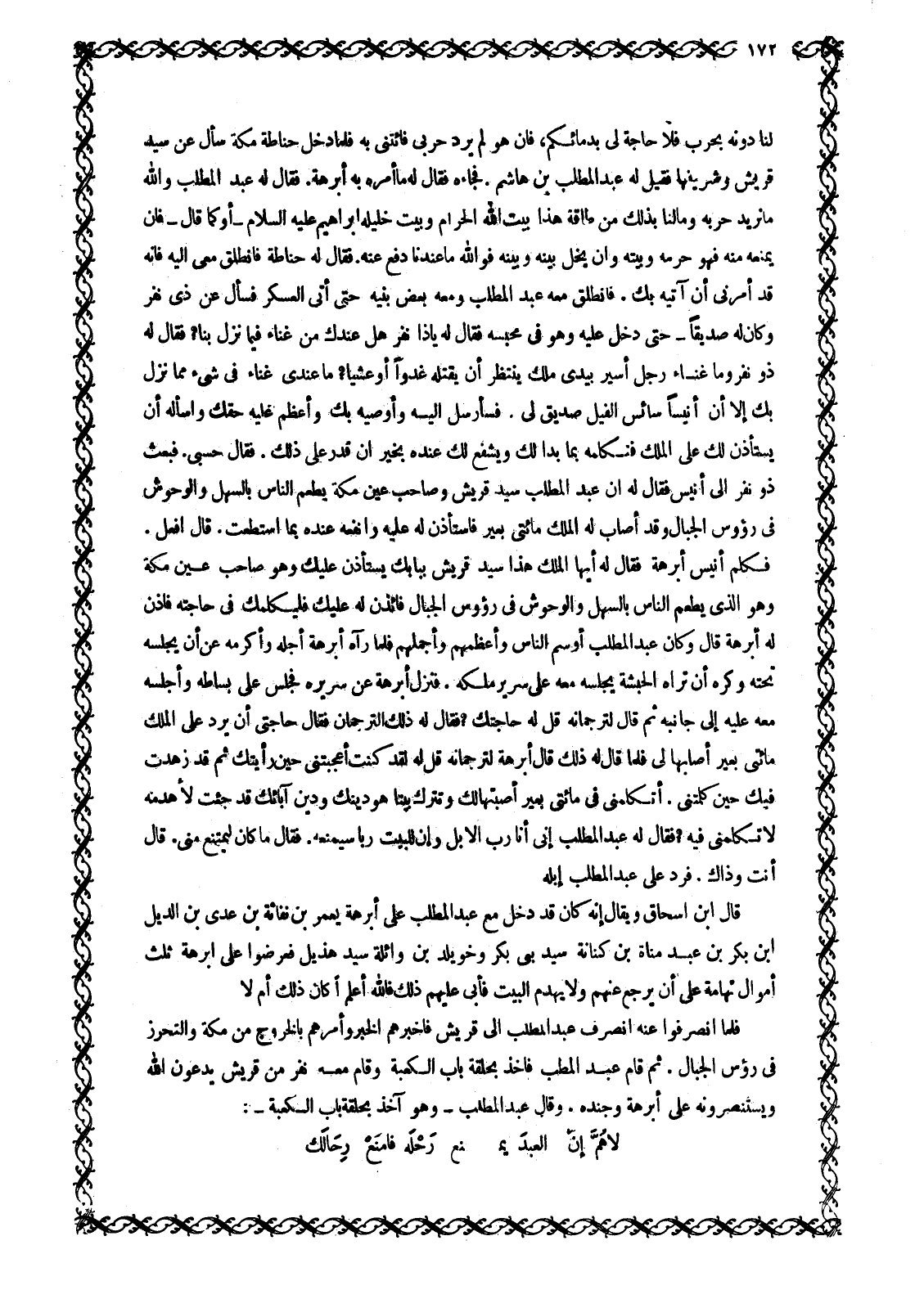 لَنَا دُونَهُ بِحَرْبٍ فَلَا حَاجَةَ لِي بِدِمَائِكُمْ، فان هو لم يرد حربي فائتنى بِهِ فَلَمَّا دَخَلَ حُنَاطَةُ مَكَّةَ سَأَلَ عَنْ سَيِّدِ قُرَيْشٍ وَشَرِيفِهَا فَقِيلَ لَهُ عَبْدُ الْمُطَّلَبِ بْنُ هَاشِمٍ. فَجَاءَهُ فَقَالَ لَهُ مَا أَمَرَهُ بِهِ أَبْرَهَةُ. فَقَالَ لَهُ عَبْدُ الْمُطَّلِبِ وَاللَّهِ مَا نُرِيدُ حَرْبَهُ وَمَا لَنَا بِذَلِكَ مِنْ طَاقَةٍ هَذَا بَيْتُ اللَّهِ الْحَرَامُ وَبَيْتُ خَلِيلِهِ إِبْرَاهِيمَ عَلَيْهِ السَّلَامُ- أَوْ كَمَا قَالَ- فَإِنْ يَمْنَعْهُ مِنْهُ فَهُوَ حَرَمُهُ وَبَيْتُهُ وَإِنْ يُخَلِّ بينه وبينه فو الله مَا عِنْدَنَا دَفْعٌ عَنْهُ. فَقَالَ لَهُ حُنَاطَةُ فَانْطَلِقْ مَعِي إِلَيْهِ فَإِنَّهُ قَدْ أَمَرَنِي أَنْ آتِيَهُ بِكَ. فَانْطَلَقَ مَعَهُ عَبْدُ الْمُطَّلِبِ وَمَعَهُ بَعْضُ بَنِيهِ حَتَّى أَتَى الْعَسْكَرَ فَسَأَلَ عَنْ ذِي نَفَرٍ وَكَانَ لَهُ صَدِيقًا- حَتَّى دَخَلَ عَلَيْهِ وَهُوَ فِي مَحْبِسِهِ فَقَالَ لَهُ يَا ذَا نَفَرٍ هَلْ عِنْدَكَ مِنْ غَنَاءٍ فِيمَا نَزَلَ بِنَا؟ فَقَالَ لَهُ ذُو نَفَرٍ وَمَا غَنَاءُ رَجُلٍ أَسِيرٍ بِيَدَيْ مَلِكٍ يَنْتَظِرُ أَنْ يَقْتُلَهُ غُدُوًّا أَوْ عَشِيًّا؟ مَا عِنْدِي غَنَاءٌ فِي شَيْءٍ مِمَّا نَزَلَ بِكَ إِلَّا أَنَّ أُنَيْسًا سَائِسَ الْفِيلِ صَدِيقٌ لِي. فَسَأُرْسِلُ إِلَيْهِ وَأُوصِيهِ بِكَ وَأُعَظِّمُ عَلَيْهِ حَقَّكَ وَأَسْأَلُهُ أَنْ يَسْتَأْذِنَ لَكَ عَلَى الْمَلِكِ فَتُكَلِّمَهُ بِمَا بَدَا لَكَ وَيَشْفَعَ لَكَ عِنْدَهُ بِخَيْرٍ إِنْ قَدَرَ عَلَى ذَلِكَ. فَقَالَ حَسْبِي. فَبَعَثَ ذُو نَفَرٍ إِلَى أُنَيْسٍ فَقَالَ لَهُ إِنَّ عَبْدَ الْمُطَّلِبِ سيد قريش وصاحب عين مَكَّةَ يُطْعِمُ النَّاسَ بِالسَّهْلِ وَالْوُحُوشَ فِي رُءُوسِ الْجِبَالِ وَقَدْ أَصَابَ لَهُ الْمَلِكُ مِائَتَيْ بَعِيرٍ فَاسْتَأْذِنْ لَهُ عَلَيْهِ وَانْفَعْهُ عِنْدَهُ بِمَا اسْتَطَعْتَ. قَالَ أَفْعَلُ.