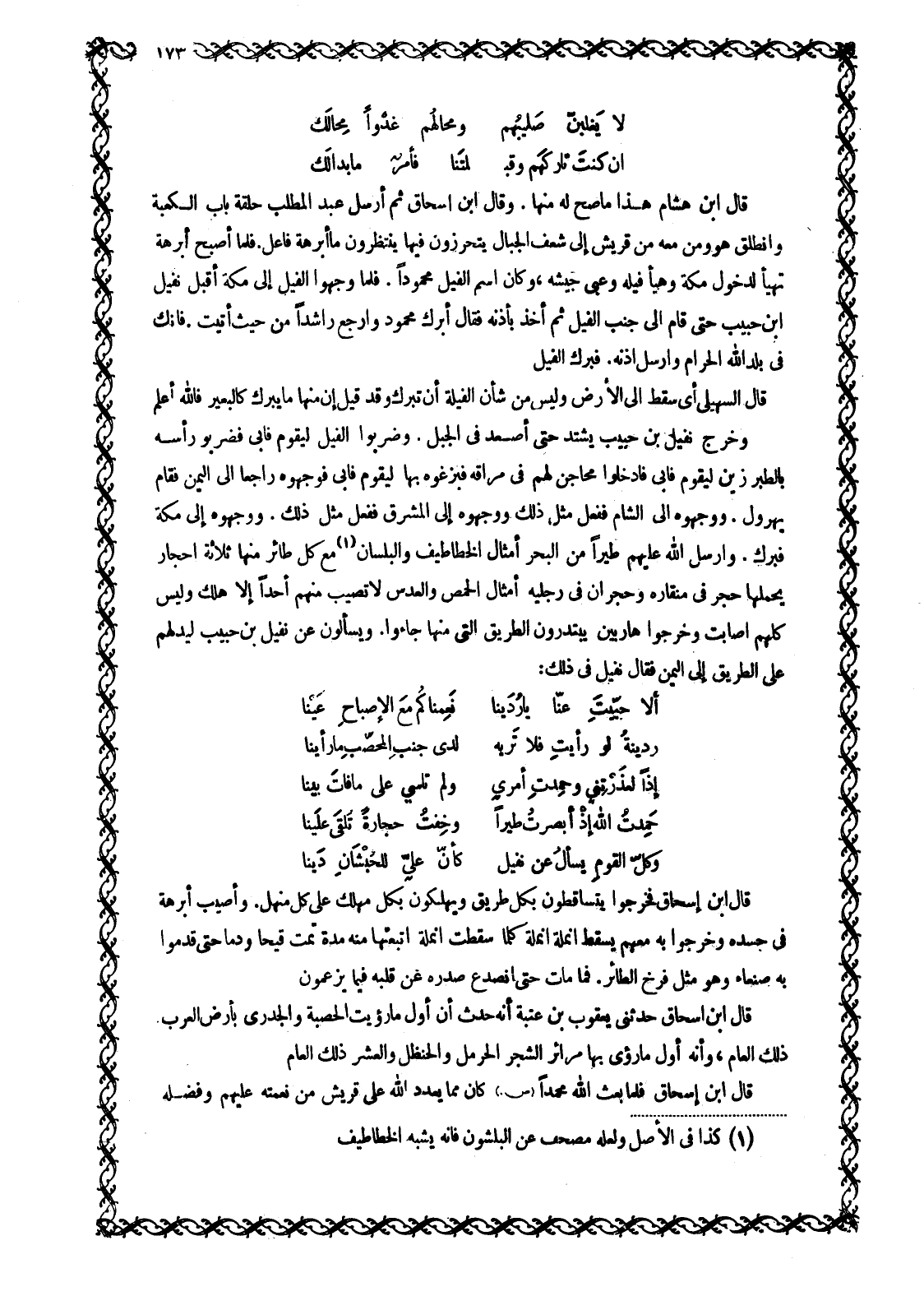 قَالَ ابْنُ هِشَامٍ هَذَا مَا صَحَّ لَهُ مِنْهَا. وَقَالَ ابْنُ إِسْحَاقَ ثُمَّ أَرْسَلَ عَبْدُ الْمُطَّلِبِ حَلْقَةَ بَابِ الْكَعْبَةِ وَانْطَلَقَ هُوَ وَمَنْ مَعَهُ مِنْ قُرَيْشٍ إِلَى شَعَفِ الْجِبَالِ يَتَحَرَّزُونَ فِيهَا يَنْتَظِرُونَ مَا أَبْرَهَةُ فَاعِلٌ. فَلَمَّا أَصْبَحَ أَبْرَهَةُ تَهَيَّأَ لِدُخُولِ مَكَّةَ وَهَيَّأَ فِيلَهُ وَعَبَّى جَيْشَهُ، وَكَانَ اسْمُ الْفِيلِ مَحْمُودًا. فَلَمَّا وَجَّهُوا الْفِيلَ إِلَى مَكَّةَ أقبل نفيل ابن حَبِيبٍ حَتَّى قَامَ إِلَى جَنْبِ الْفِيلِ ثُمَّ أَخَذَ بِأُذُنِهِ فَقَالَ ابْرُكْ مَحْمُودُ وَارْجِعْ رَاشِدًا مِنْ حَيْثُ أَتَيْتَ. فَإِنَّكَ فِي بَلَدِ اللَّهِ الْحَرَامِ وَأَرْسَلَ أُذُنَهُ. فَبَرَكَ الْفِيلُ قَالَ السُّهَيْلِيُّ أَيْ سَقَطَ إِلَى الْأَرْضِ وَلَيْسَ مِنْ شَأْنِ الْفِيَلَةِ أَنَّ تَبْرُكَ وَقَدْ قِيلَ إِنَّ مِنْهَا مَا يَبْرُكُ كَالْبَعِيرِ فاللَّه أَعْلَمُ وَخَرَجَ نُفَيْلُ بْنُ حَبِيبٍ يَشْتَدُّ حَتَّى أَصْعَدَ فِي الْجَبَلِ. وَضَرَبُوا الْفِيلَ لِيَقُومَ فَأَبَى فَضَرَبُوا رَأْسَهُ بِالطَّبَرْزِينِ لِيَقُومَ فَأَبَى فَأَدْخَلُوا مَحَاجِنَ لَهُمْ فِي مَرَاقِّهِ فَبَزَغُوهُ بِهَا لِيَقُومَ فَأَبَى فَوَجَّهُوهُ رَاجِعًا إِلَى الْيَمَنِ فَقَامَ يُهَرْوِلُ. وَوَجَّهُوهُ إِلَى الشَّامِ فَفَعَلَ مِثْلَ ذَلِكَ وَوَجَّهُوهُ إِلَى الْمَشْرِقِ فَفَعَلَ مِثْلَ ذَلِكَ. وَوَجَّهُوهُ إِلَى مَكَّةَ فَبَرَكَ. وَأَرْسَلَ اللَّهُ عَلَيْهِمْ طَيْرًا مِنَ الْبَحْرِ أَمْثَالَ الْخَطَاطِيفِ وَالْبَلَسَانِ [1] مَعَ كُلِّ طَائِرٍ مِنْهَا ثَلَاثَةُ أَحْجَارٍ يَحْمِلُهَا حَجَرٌ فِي مِنْقَارِهِ وَحَجَرَانِ فِي رِجْلَيْهِ أَمْثَالَ الْحِمَّصِ وَالْعَدَسِ لَا تُصِيبُ مِنْهُمْ أَحَدًا إِلَّا هَلَكَ وَلَيْسَ كُلُّهُمْ أَصَابَتْ وَخَرَجُوا هَارِبِينَ يَبْتَدِرُونَ الطَّرِيقَ الَّتِي مِنْهَا جَاءُوا. وَيَسْأَلُونَ عَنْ نُفَيْلِ بْنِ حَبِيبٍ لِيَدُلَّهُمْ عَلَى الطَّرِيقِ إِلَى الْيَمَنِ فَقَالَ نُفَيْلٌ فِي ذَلِكَ: