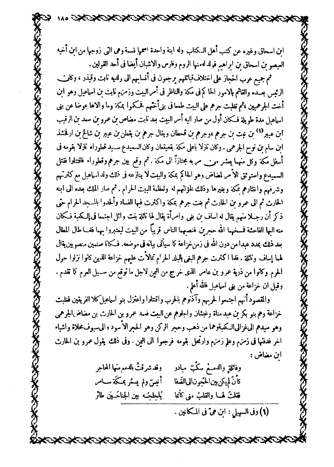ثُمَّ جَمِيعُ عَرَبِ الْحِجَازِ عَلَى اخْتِلَافِ قَبَائِلِهِمْ يَرْجِعُونَ فِي أَنْسَابِهِمْ إِلَى وَلَدَيْهِ نَابِتٍ وَقَيْذَرَ، وَكَانَ الرَّئِيسُ بَعْدَهُ وَالْقَائِمُ بِالْأُمُورِ الْحَاكِمُ فِي مَكَّةَ وَالنَّاظِرُ فِي أَمْرِ الْبَيْتِ وَزَمْزَمَ نَابِتُ بْنُ إِسْمَاعِيلَ وَهُوَ ابْنُ أُخْتِ الْجُرْهُمِيِّينَ، ثُمَّ تَغَلَّبَتْ جُرْهُمٌ عَلَى الْبَيْتِ طَمَعًا فِي بَنِي أُخْتِهِمْ فَحَكَمُوا بِمَكَّةَ وَمَا وَالَاهَا عِوَضًا عَنْ بَنِي إِسْمَاعِيلَ مُدَّةً طَوِيلَةً فَكَانَ أَوَّلُ مَنْ صَارَ إِلَيْهِ أَمْرُ الْبَيْتِ بَعْدَ نَابِتٍ مُضَاصَ بْنَ عَمْرِو بن سعد بن الرقيب ابن عيبر [1] بْنِ نَبْتِ بْنِ جُرْهُمٍ، وَجُرْهُمُ بْنُ قَحْطَانَ وَيُقَالُ جُرْهُمُ بْنُ يَقْطُنَ بْنُ عَيْبَرِ بْنِ شالخ بن ارفخشذ ابن سَامِ بْنِ نُوحٍ الْجُرْهُمِيُّ. وَكَانَ نَازِلًا بِأَعْلَى مَكَّةَ بِقُعَيْقِعَانَ وَكَانَ السَّمَيْدَعُ سَيِّدُ قَطُورَاءَ نَازِلًا بِقَوْمِهِ فِي أَسْفَلِ مَكَّةَ وَكُلٌّ مِنْهُمَا يَعْشُرُ مَنْ مَرَّ بِهِ مُجْتَازًا إِلَى مَكَّةَ. ثُمَّ وَقَعَ بَيْنَ جُرْهُمٍ وَقَطُورَاءَ فَاقْتَتَلُوا فَقُتِلَ السَّمَيْدَعُ وَاسْتَوْثَقَ الْأَمْرُ لِمُضَاضٍ وَهُوَ الْحَاكِمُ بِمَكَّةَ وَالْبَيْتِ لَا يُنَازِعُهُ فِي ذَلِكَ وَلَدُ إِسْمَاعِيلَ مَعَ كثرتهم وشرفهم وانتثارهم بمكة وبغيرها وذلك لخؤولتهم لَهُ وَلِعَظَمَةِ الْبَيْتِ الْحَرَامِ. ثُمَّ صَارَ الْمُلْكُ بَعْدَهُ إِلَى ابْنِهِ الْحَارِثِ ثُمَّ إِلَى عَمْرِو بْنِ الْحَارِثِ ثُمَّ بَغَتْ جُرْهُمٌ بِمَكَّةَ وَأَكْثَرَتْ فِيهَا الْفَسَادَ وَأَلْحَدُوا بِالْمَسْجِدِ الْحَرَامِ حَتَّى ذُكِرَ أَنَّ رَجُلًا مِنْهُمْ يُقَالَ لَهُ إِسَافُ بْنُ بَغِيٍّ وَامْرَأَةٌ يُقَالُ لَهَا نَائِلَةُ بِنْتُ وَائِلٍ اجْتَمَعَا فِي الْكَعْبَةِ فَكَانَ مِنْهُ إِلَيْهَا الْفَاحِشَةُ فَمَسَخَهُمَا اللَّهُ حَجَرَيْنِ فَنَصَبَهُمَا النَّاسُ قَرِيبًا مِنَ الْبَيْتِ لِيَعْتَبِرُوا بِهِمَا فَلَمَّا طَالَ الْمَطَالُ بَعْدَ ذَلِكَ بِمُدَدٍ عُبِدَا مِنْ دُونِ اللَّهِ فِي زَمَنِ خُزَاعَةَ كَمَا سَيَأْتِي بَيَانُهُ فِي مَوْضِعِهِ. فَكَانَا صَنَمَيْنِ مَنْصُوبَيْنِ يُقَالُ لَهُمَا إِسَافٌ وَنَائِلَةُ. فَلَمَّا أَكْثَرَتْ جُرْهُمٌ الْبَغْيَ بِالْبَلَدِ الْحَرَامِ تَمَالَأَتْ عَلَيْهِمْ خُزَاعَةُ الَّذِينَ كَانُوا نَزَلُوا حَوْلَ الْحَرَمِ وكانوا مِنْ ذُرِّيَّةِ عَمْرِو بْنِ عَامِرٍ الَّذِي خَرَجَ مِنَ الْيَمَنِ لِأَجْلِ مَا تَوَقَّعَ مِنْ سَيْلِ الْعَرِمِ كَمَا تَقَدَّمَ.