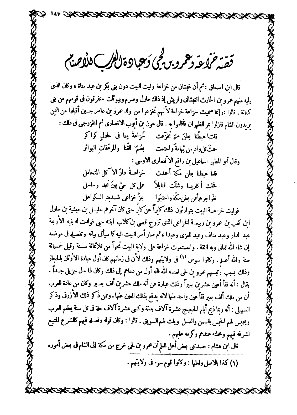 قَالَ ابْنُ هِشَامٍ: حَدَّثَنِي بَعْضُ أَهْلِ الْعِلْمِ أَنَّ عَمْرَو بْنَ لُحَيٍّ خَرَجَ مِنْ مكة إلى الشام في بعض أموره