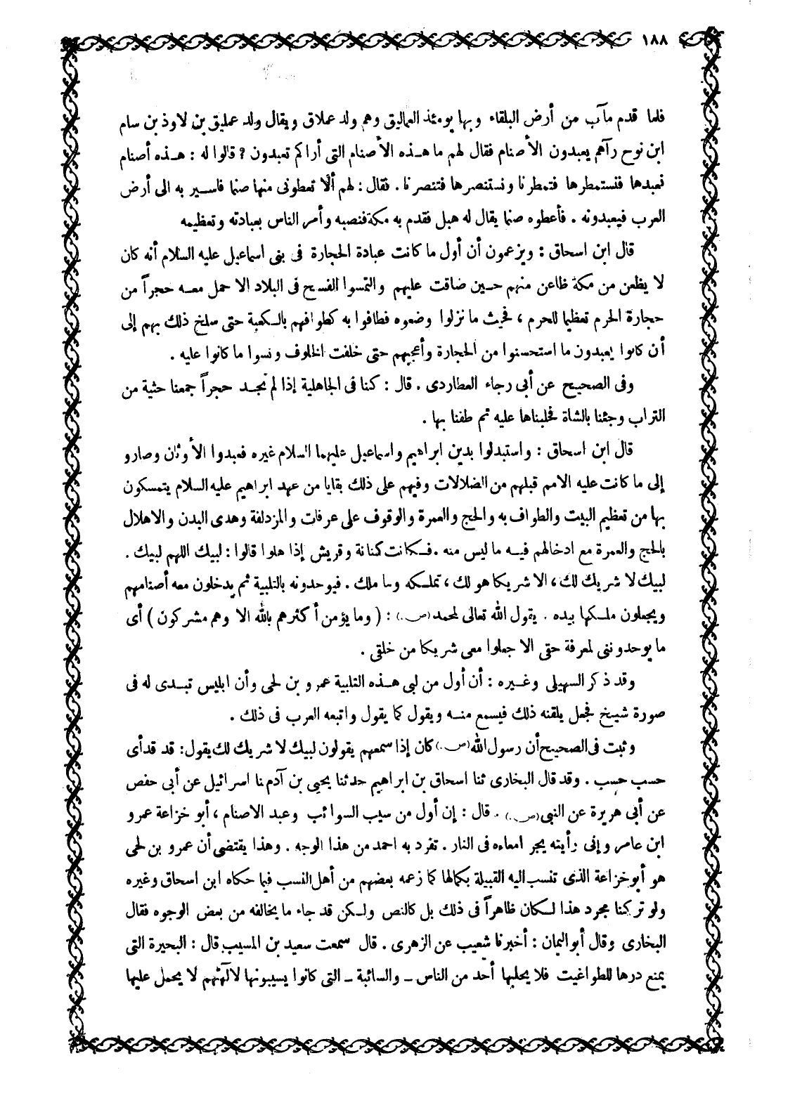 وَثَبَتَ فِي الصَّحِيحِ أَنَّ رَسُولَ اللَّهِ صَلَّى اللَّهُ عَلَيْهِ وَسَلَّمَ كَانَ إِذَا سَمِعَهُمْ يَقُولُونَ لَبَّيْكَ لَا شَرِيكَ لَكَ يَقُولُ: قَدْ قَدْ أَيْ حَسْبُ حَسْبُ. وَقَدْ قَالَ الْبُخَارِيُّ ثنا إِسْحَاقُ بْنُ ابْرَاهِيمَ حَدَّثَنَا يَحْيَى بْنُ آدَمَ ثَنَا إِسْرَائِيلُ عَنْ أَبِي حفص عَنْ أَبِي هُرَيْرَةَ عَنِ النَّبِيِّ صَلَّى اللَّهُ عَلَيْهِ وَسَلَّمَ. قَالَ: إِنَّ أَوَّلَ مَنْ سَيَّبَ السَّوَائِبَ وَعَبَدَ الْأَصْنَامَ، أبو خزاعة عمرو ابن عَامِرٍ وَإِنِّي رَأَيْتُهُ يَجُرُّ أَمْعَاءَهُ فِي النَّارِ. تَفَرَّدَ بِهِ أَحْمَدُ مِنْ هَذَا الْوَجْهِ. وَهَذَا يَقْتَضِي أَنَّ عَمْرَو بْنَ لُحَيٍّ هُوَ أَبُو خُزَاعَةَ الَّذِي تُنْسَبُ إِلَيْهِ الْقَبِيلَةُ بِكَمَالِهَا كَمَا زَعَمَهُ بَعْضُهُمْ مِنْ أَهْلِ النَّسَبِ فِيمَا حَكَاهُ ابْنُ إِسْحَاقَ وَغَيْرُهُ وَلَوْ تَرَكْنَا مُجَرَّدَ هَذَا لَكَانَ ظَاهِرًا فِي ذَلِكَ بَلْ كَالنَّصِّ وَلَكِنْ قَدْ جَاءَ مَا يُخَالِفُهُ مِنْ بَعْضِ الْوُجُوهِ فَقَالَ الْبُخَارِيُّ وَقَالَ أَبُو الْيَمَانِ: أَخْبَرَنَا شُعَيْبٌ عَنِ الزُّهْرِيِّ. قَالَ سَمِعْتُ سَعِيدَ بْنَ الْمُسَيَّبِ قَالَ: الْبَحِيرَةُ الَّتِي يُمْنَعُ دَرُّهَا لِلطَّوَاغِيتِ فَلَا يَحْلِبُهَا أَحَدٌ مِنَ النَّاسِ- وَالسَّائِبَةُ- الَّتِي كَانُوا يَسُيِّبُونَهَا لِآلِهَتِهِمْ لَا يُحْمَلُ عَلَيْهَا