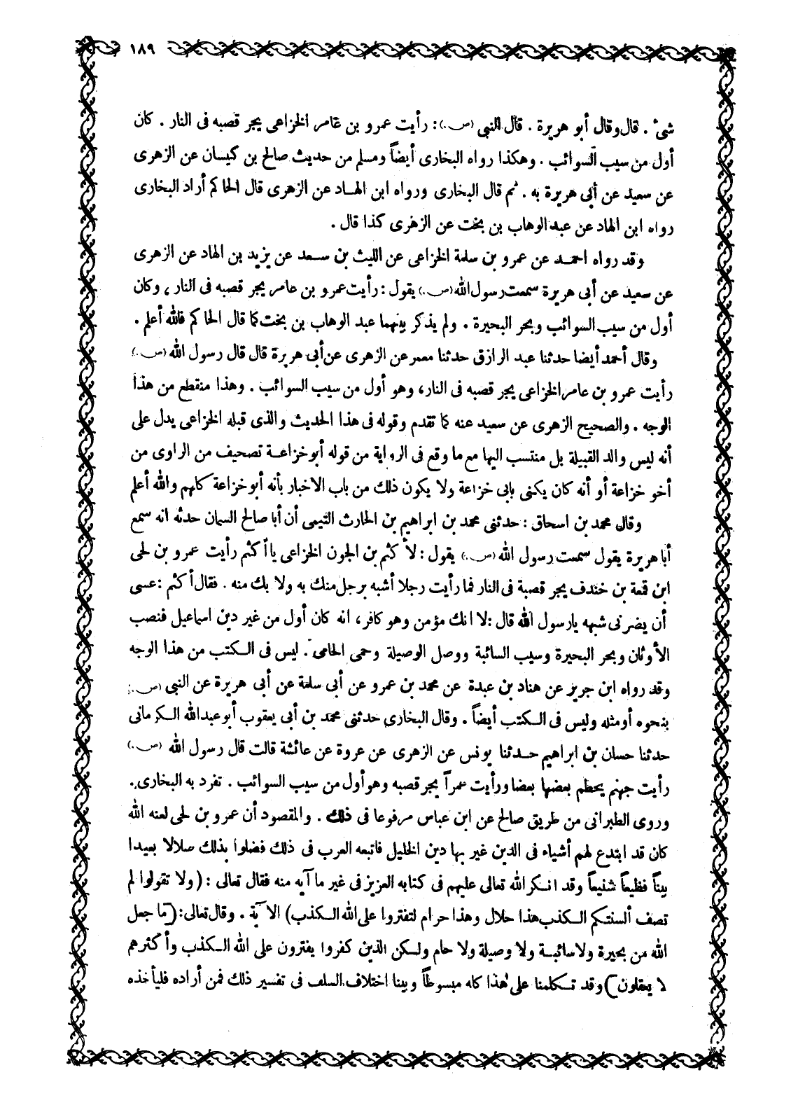 شَيْءٌ. قَالَ وَقَالَ أَبُو هُرَيْرَةَ. قَالَ النَّبِيُّ صَلَّى اللَّهُ عَلَيْهِ وَسَلَّمَ: رَأَيْتُ عَمْرَو بْنَ عَامِرٍ الْخُزَاعِيَّ يَجُرُّ قُصْبَهُ فِي النَّارِ. كَانَ أَوَّلَ مَنْ سَيَّبَ السَّوَائِبَ. وَهَكَذَا رَوَاهُ الْبُخَارِيُّ أَيْضًا وَمُسْلِمٌ مِنْ حَدِيثِ صَالِحِ بْنِ كِيسَانَ عَنِ الزُّهْرِيِّ عَنْ سَعِيدٍ عَنْ أَبِي هُرَيْرَةَ بِهِ. ثُمَّ قَالَ الْبُخَارِيُّ وَرَوَاهُ ابْنُ الْهَادِ عَنِ الزُّهْرِيِّ قَالَ الْحَاكِمُ أَرَادَ الْبُخَارِيُّ رَوَاهُ ابْنُ الْهَادِ عَنْ عَبْدِ الْوَهَّابِ بْنِ بُخْتٍ عَنِ الزُّهْرِيِّ كَذَا قَالَ.