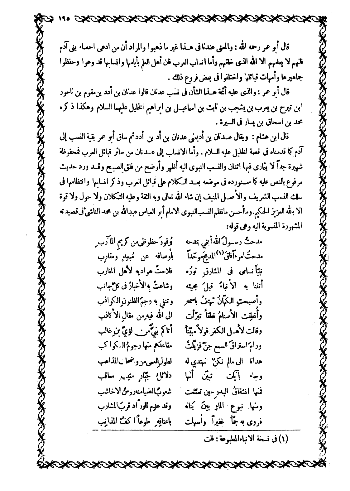 قَالَ ابْنُ هِشَامٍ: وَيُقَالُ عَدْنَانُ بْنُ أُدٍّ يَعْنِي عَدْنَانَ بْنِ أُدِّ بْنِ أُدَدَ ثُمَّ سَاقَ أَبُو عُمَرَ بَقِيَّةَ النَّسَبِ إِلَى آدَمَ كَمَا قَدَّمْنَاهُ فِي قِصَّةِ الْخَلِيلِ عَلَيْهِ السَّلَامُ. وَأَمَّا الْأَنْسَابُ إِلَى عَدْنَانَ مِنْ سَائِرِ قَبَائِلِ الْعَرَبِ فَمَحْفُوظَةٌ شَهِيرَةٌ جِدًّا لَا يَتَمَارَى فِيهَا اثْنَانِ وَالنَّسَبُ النَّبَوِيُّ إِلَيْهِ أَظْهَرُ وَأَوْضَحُ مِنْ فَلَقِ الصُّبْحِ وَقَدْ وَرَدَ حَدِيثٌ مَرْفُوعٌ بِالنَّصِّ عَلَيْهِ كَمَا سَنُورِدُهُ فِي مَوْضِعِهِ بَعْدَ الْكَلَامِ عَلَى قَبَائِلِ الْعَرَبِ وَذِكْرِ أَنْسَابِهَا وَانْتِظَامِهَا فِي سِلْكِ النَّسَبِ الشَّرِيفِ وَالْأَصْلِ الْمُنِيفِ إِنْ شَاءَ اللَّهُ تَعَالَى وَبِهِ الثِّقَةُ وَعَلَيْهِ التُّكْلَانُ وَلَا حَوْلَ وَلَا قُوَّةَ إِلَّا باللَّه الْعَزِيزِ الْحَكِيمِ. وَمَا أَحْسَنَ مَا نَظَمَ النَّسَبَ النَّبَوِيَّ الْإِمَامُ أَبُو الْعَبَّاسِ عَبْدُ اللَّهِ بْنُ مُحَمَّدٍ النَّاشِئُ فِي قَصِيدَتِهِ الْمَشْهُورَةِ الْمَنْسُوبَةِ إِلَيْهِ وَهِيَ قَوْلُهُ:
