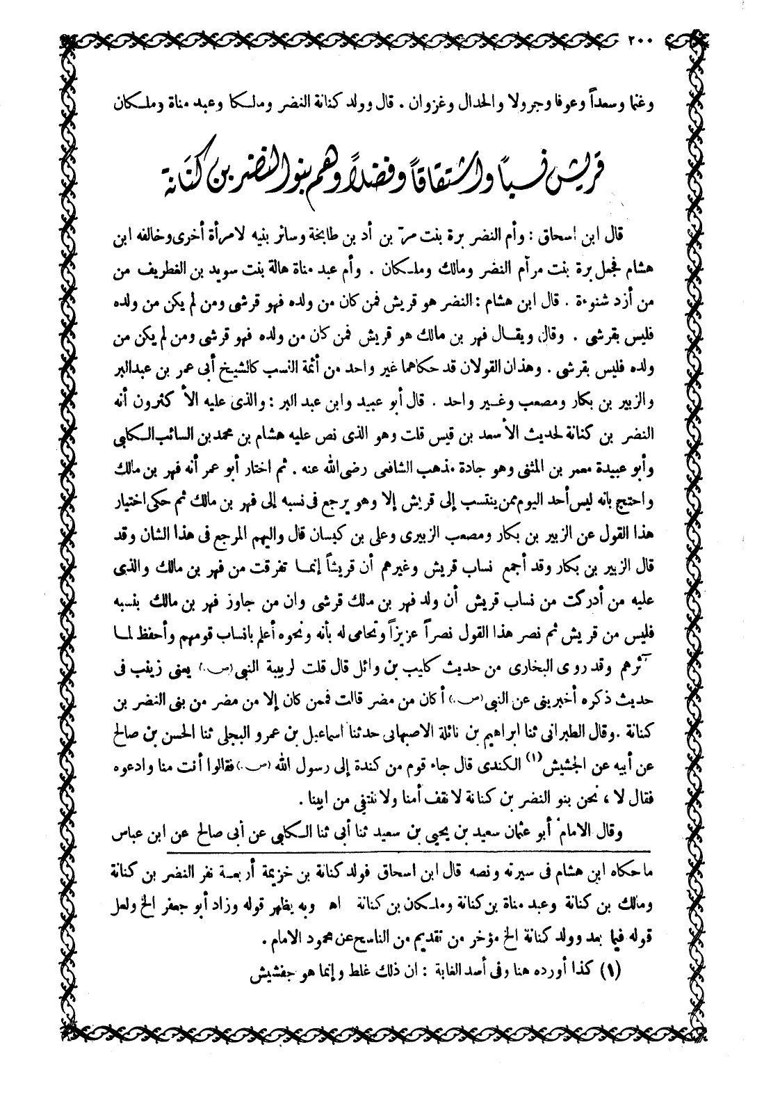 الْكَلَامُ عَلَى قُرَيْشٍ نَسَبًا وَاشْتِقَاقًا وَفَضْلًا وَهُمْ بَنُو النَّضْرِ بْنِ كِنَانَةَ