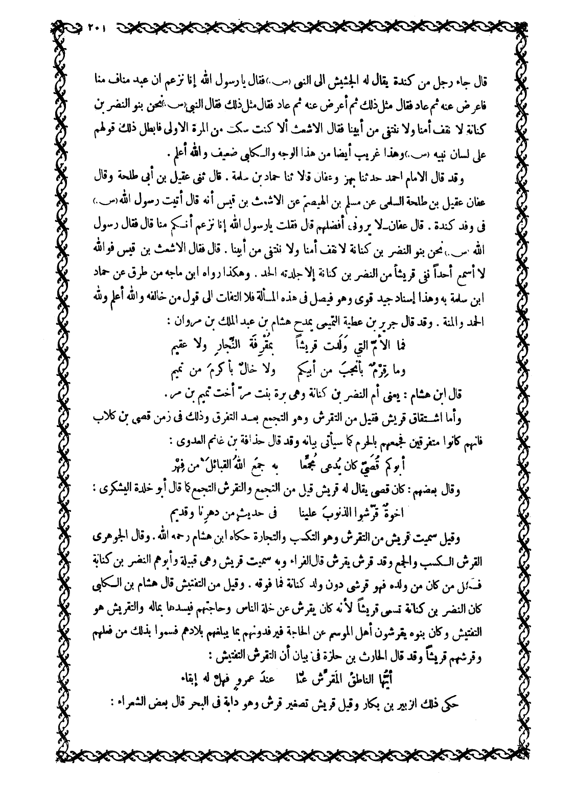 وَقَدْ قَالَ الْإِمَامُ أَحْمَدُ حَدَّثَنَا بَهْزٌ وَعَفَّانُ قَالَا ثنا حَمَّادُ بْنُ سَلَمَةَ. قَالَ ثني عَقِيلُ بْنُ أَبِي طَلْحَةَ وَقَالَ عَفَّانُ عَقِيلُ بْنُ طَلْحَةَ السُّلَمِيُّ عَنْ مُسْلِمِ بْنِ الْهَيْصَمِ عَنِ الْأَشْعَثِ بْنِ قَيْسٍ أَنَّهُ قَالَ أَتَيْتُ رَسُولَ اللَّهِ صَلَّى اللَّهُ عَلَيْهِ وَسَلَّمَ فِي وَفْدِ كِنْدَةَ. قَالَ عَفَّانُ- لَا يَرَوْنِي أَفْضَلَهُمْ قَالَ فَقُلْتُ يَا رَسُولَ اللَّهِ إِنَّا نَزْعُمُ أَنَّكُمْ مِنَّا قَالَ فَقَالَ رَسُولُ اللَّهِ صَلَّى اللَّهُ عَلَيْهِ وَسَلَّمَ نَحْنُ بَنُو النَّضْرِ بْنِ كِنَانَةَ لَا نقف أُمَّنَا وَلَا نَنْتَفِي مِنْ أَبِينَا. قَالَ فَقَالَ الأشعث بن قيس فو الله لَا أَسْمَعُ أَحَدًا نَفَى قُرَيْشًا مِنَ النَّضْرِ بْنِ كِنَانَةَ إِلَّا جَلَدْتُهُ الْحَدَّ. وَهَكَذَا رَوَاهُ ابن ماجة من طرق عن حماد ابن سَلَمَةَ بِهِ وَهَذَا إِسْنَادٌ جَيِّدٌ قَوِيٌّ وَهُوَ فَيْصَلٌ فِي هَذِهِ الْمَسْأَلَةِ فَلَا الْتِفَاتَ إِلَى قول من خالفه والله أعلم وللَّه الحمد والمنة. وَقَدْ قَالَ جَرِيرُ بْنُ عَطِيَّةَ التَّمِيمِيُّ يَمْدَحُ هِشَامَ بْنَ عَبْدِ الْمَلِكِ بْنِ مَرْوَانَ: