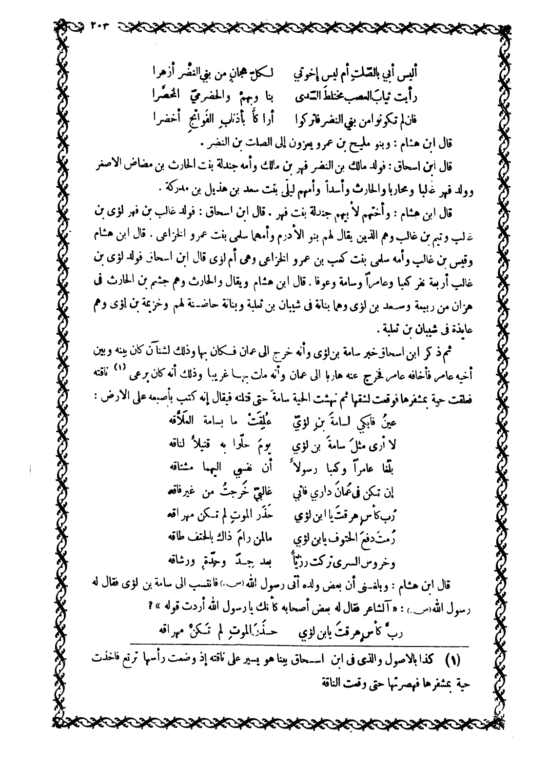 قَالَ ابْنُ هِشَامٍ: وَبَلَغَنِي أَنَّ بَعْضَ وَلَدِهِ أَتَى رَسُولَ اللَّهِ صَلَّى اللَّهُ عَلَيْهِ وَسَلَّمَ فَانْتَسَبَ إِلَى سَامَةَ بْنِ لُؤَيٍّ فَقَالَ لَهُ رَسُولُ اللَّهِ صَلَّى اللَّهُ عَلَيْهِ وَسَلَّمَ: «آلشَّاعِرُ فَقَالَ لَهُ بَعْضُ أَصْحَابِهِ كَأَنَّكَ يَا رَسُولَ اللَّهِ أَرَدْتَ قَوْلَهُ» ؟