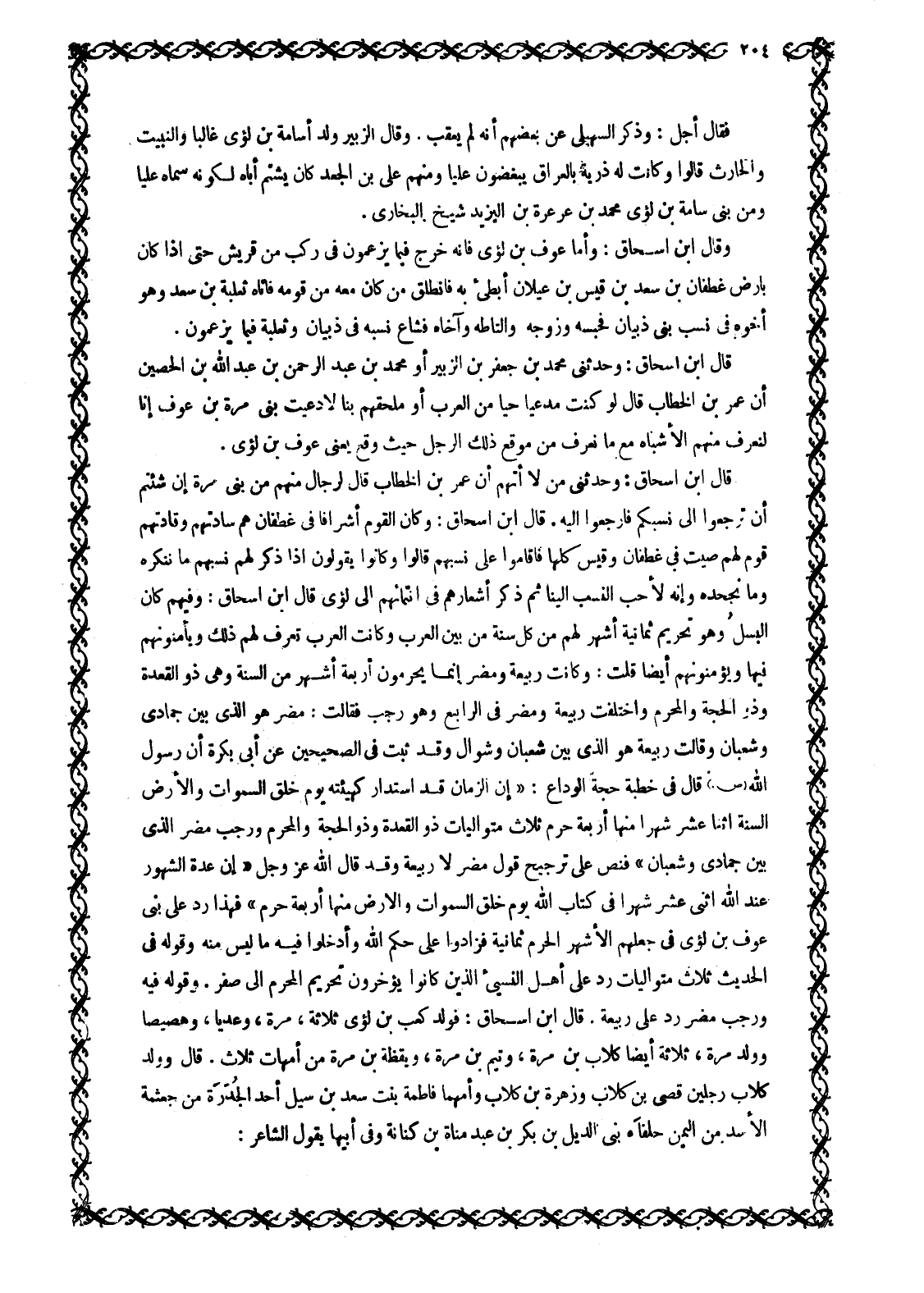 قَالَ ابْنُ إِسْحَاقَ: وَحَدَّثَنِي مَنْ لَا أَتَّهِمُ أَنَّ عُمَرَ بْنَ الْخَطَّابِ قَالَ لِرِجَالٍ مِنْهُمْ مِنْ بَنِي مُرَّةَ إِنْ شِئْتُمْ أَنْ تَرْجِعُوا إِلَى نَسَبِكُمْ فَارْجِعُوا إِلَيْهِ. قَالَ ابْنُ إِسْحَاقَ: وَكَانَ الْقَوْمُ أَشْرَافًا فِي غَطَفَانَ هُمْ سَادَتُهُمْ وَقَادَتُهُمْ قَوْمٌ لَهُمْ صِيتٌ فِي غَطَفَانَ وَقَيْسٍ كلها فأقاموا على نسبهم قالوا وَكَانُوا يَقُولُونَ إِذَا ذُكِرَ لَهُمْ نَسَبُهُمْ مَا نُنْكِرُهُ وَمَا نَجْحَدُهُ وَإِنَّهُ لَأَحَبُّ النَّسَبِ إِلَيْنَا ثُمَّ ذَكَرَ أَشْعَارَهُمْ فِي انْتِمَائِهِمْ إِلَى لُؤَيٍّ قَالَ ابْنُ إِسْحَاقَ: وَفِيهِمْ كَانَ الْبَسْلُ وَهُوَ تَحْرِيمُ ثَمَانِيَةِ أَشْهُرٍ لَهُمْ مِنْ كُلِّ سَنَةٍ مِنْ بَيْنِ الْعَرَبِ وَكَانَتِ الْعَرَبُ تَعْرِفُ لَهُمْ ذَلِكَ وَيَأْمَنُونَهُمْ فِيهَا وَيُؤَمِّنُونَهُمْ أَيْضًا قُلْتُ: وَكَانَتْ رَبِيعَةُ وَمُضَرُ إِنَّمَا يُحَرِّمُونَ أَرْبَعَةَ أَشْهُرٍ مِنَ السَّنَةِ وَهِيَ ذُو الْقَعْدَةِ وَذُو الْحِجَّةِ وَالْمُحَرَّمُ وَاخْتَلَفَتْ رَبِيعَةُ وَمُضَرُ فِي الرَّابِعِ وَهُوَ رَجَبٌ فَقَالَتْ: مُضَرُ هُوَ الَّذِي بَيْنَ جُمَادَى وَشَعْبَانَ وَقَالَتْ رَبِيعَةُ هُوَ الَّذِي بَيْنَ شَعْبَانَ وَشَوَّالٍ وَقَدْ ثَبَتَ فِي الصَّحِيحَيْنِ عَنْ أَبِي بَكْرَةَ أَنَّ رَسُولَ اللَّهِ صَلَّى اللَّهُ عَلَيْهِ وَسَلَّمَ قَالَ فِي خُطْبَةِ حِجَّةِ الْوَدَاعِ: «إِنَّ الزَّمَانَ قَدِ اسْتَدَارَ كَهَيْئَتِهِ يَوْمَ خَلَقَ السموات وَالْأَرْضَ السَّنَةُ اثْنَا عَشَرَ شَهْرًا مِنْهَا أَرْبَعَةٌ حُرُمٌ ثَلَاثٌ مُتَوَالِيَاتٌ ذُو الْقَعْدَةِ وَذُو الْحِجَّةِ وَالْمُحَرَّمُ وَرَجَبُ مُضَرَ الَّذِي بَيْنَ جُمَادَى وَشَعْبَانَ» فَنَصَّ عَلَى تَرْجِيحِ قَوْلِ مُضَرَ لَا رَبِيعَةَ وَقَدْ قَالَ اللَّهُ عَزَّ وَجَلَّ «إِنَّ عِدَّةَ الشُّهُورِ عِنْدَ اللَّهِ اثْنا عَشَرَ شَهْراً فِي كِتابِ اللَّهِ يَوْمَ خَلَقَ السَّماواتِ وَالْأَرْضَ مِنْها أَرْبَعَةٌ حُرُمٌ» 9: 36 فَهَذَا رَدٌّ عَلَى بَنِي عَوْفِ بْنِ لُؤَيٍّ فِي جَعْلِهِمُ الْأَشْهُرَ الْحُرُمَ ثَمَانِيَةً فَزَادُوا عَلَى حُكْمِ اللَّهِ وَأَدْخَلُوا فِيهِ مَا لَيْسَ مِنْهُ وَقَوْلُهُ فِي الْحَدِيثِ ثَلَاثٌ مُتَوَالِيَاتٌ رَدٌّ عَلَى أَهْلِ النَّسِيءِ الَّذِينَ كَانُوا يُؤَخِّرُونَ تَحْرِيمَ الْمُحَرَّمِ إِلَى صَفَرَ. وَقَوْلُهُ فِيهِ وَرَجَبُ مُضَرَ رَدٌّ عَلَى رَبِيعَةَ. قَالَ ابْنُ إِسْحَاقَ: فَوَلَدَ كَعْبُ بْنُ لُؤَيٍّ ثَلَاثَةً، مُرَّةَ، وَعَدِيًّا، وَهُصَيْصًا وَوَلَدَ مُرَّةُ، ثَلَاثَةً أَيْضًا كِلَابَ بْنَ مُرَّةَ، وَتَيْمَ بْنَ مُرَّةَ، وَيَقَظَةَ بْنَ مُرَّةَ مِنْ أُمَّهَاتٍ ثَلَاثٍ. قَالَ وَوَلَدَ كِلَابٌ رَجُلَيْنِ قُصَيَّ بْنَ كِلَابٍ وَزُهْرَةَ بْنَ كِلَابٍ وَأُمُّهُمَا فَاطِمَةُ بِنْتُ سَعْدِ بْنِ سَيَلٍ أَحَدِ الْجَدَرَةِ مِنْ جُعْثُمَةَ الأسد من اليمن حلفاء بنى الديل بْنِ بَكْرِ بْنِ عَبْدِ مَنَاةَ بْنِ كِنَانَةَ وَفِي أَبِيهَا يَقُولُ الشَّاعِرُ: