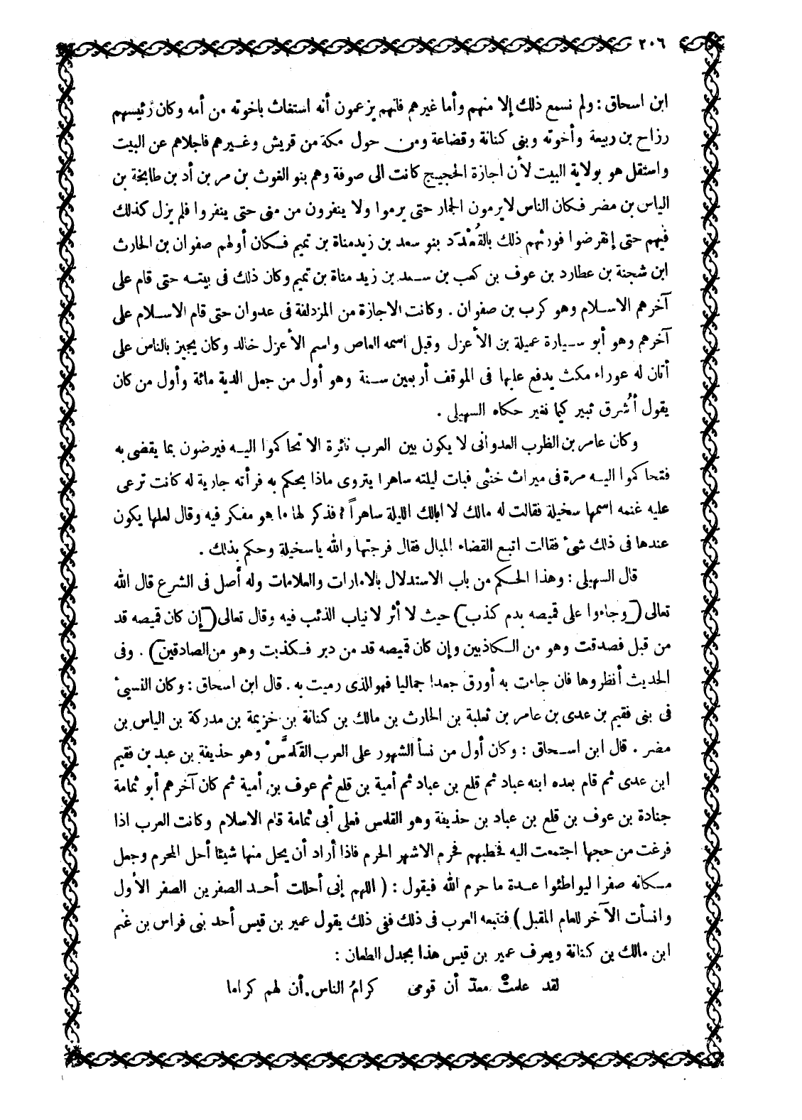 قَالَ السُّهَيْلِيُّ: وَهَذَا الْحُكْمُ مِنْ بَابِ الِاسْتِدْلَالِ بِالْأَمَارَاتِ وَالْعَلَامَاتِ وَلَهُ أَصْلٌ فِي الشَّرْعِ قَالَ الله تعالى وَجاؤُ عَلى قَمِيصِهِ بِدَمٍ كَذِبٍ 12: 18 حَيْثُ لَا أَثَرَ لِأَنْيَابِ الذِّئْبِ فِيهِ وَقَالَ تَعَالَى إِنْ كانَ قَمِيصُهُ قُدَّ مِنْ قُبُلٍ فَصَدَقَتْ وَهُوَ مِنَ الْكاذِبِينَ وَإِنْ كانَ قَمِيصُهُ قُدَّ مِنْ دُبُرٍ فَكَذَبَتْ وَهُوَ مِنَ الصَّادِقِينَ 12: 26- 27. وَفِي الْحَدِيثِ أَنِظْرُوهَا فَإِنْ جَاءَتْ بِهِ أَوْرَقَ جعدا جماليا فهو للذي رُمِيَتْ بِهِ. قَالَ ابْنُ إِسْحَاقَ: وَكَانَ النَّسِيءُ فِي بَنِي فُقَيْمِ بْنِ عَدِيِّ بْنِ عَامِرِ بْنِ ثَعْلَبَةَ بْنِ الْحَارِثِ بْنِ مَالِكِ بْنِ كِنَانَةَ بْنِ خُزَيْمَةَ بْنِ مُدْرِكَةَ بْنِ إِلْيَاسَ بْنِ مُضَرَ. قَالَ ابْنُ إِسْحَاقَ: وَكَانَ أَوَّلُ مَنْ نَسَأَ الشُّهُورَ عَلَى الْعَرَبِ الْقَلَمَّسُ وَهُوَ حذيفة بن عبد بن فقيم ابن عَدِيٍّ ثُمَّ قَامَ بَعْدَهُ ابْنُهُ عَبَّادٌ ثُمَّ قَلَعُ بْنُ عَبَّادٍ ثُمَّ أُمَيَّةُ بْنُ قَلَعٍ ثُمَّ عَوْفُ بْنُ أُمَيَّةَ ثُمَّ كَانَ آخِرَهُمْ أَبُو ثُمَامَةَ جُنَادَةُ بْنُ عَوْفِ بْنِ قَلَعِ بْنِ عَبَّادِ بْنِ حُذَيْفَةَ وَهُوَ الْقَلَمَّسُ فَعَلَى أَبِي ثُمَامَةَ قَامَ الْإِسْلَامُ وَكَانَتِ الْعَرَبُ إِذَا فَرَغَتْ مِنْ حَجِّهَا اجْتَمَعَتْ إِلَيْهِ فَخَطَبَهُمْ فَحَرَّمَ الْأَشْهُرَ الْحُرُمَ فَإِذَا أَرَادَ أَنْ يُحِلَّ مِنْهَا شَيْئًا أَحَلَّ الْمُحَرَّمَ وَجَعَلَ مَكَانَهُ صَفَرًا لِيُوَاطِئُوا عِدَّةَ مَا حَرَّمَ اللَّهُ فَيَقُولُ: (اللَّهمّ إِنِّي أَحْلَلْتُ أَحَدَ الصَّفَرَيْنِ الصَّفَرَ الْأَوَّلَ وَأَنْسَأْتُ الْآخَرَ لِلْعَامِ الْمُقْبِلِ) فَتَتَّبِعُهُ الْعَرَبُ فِي ذَلِكَ فَفِي ذَلِكَ يَقُولُ عُمَيْرُ بْنُ قَيْسٍ أَحَدُ بَنِي فراس بن غنم ابن مَالِكِ بْنِ كِنَانَةَ وَيُعْرَفُ عُمَيْرُ بْنُ قَيْسٍ هذا بجدل الطِّعَانِ: