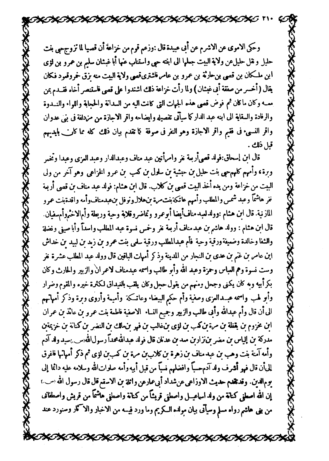 قَالَ ابْنُ إِسْحَاقَ: فَوَلَدَ قُصَيٌّ أَرْبَعَةَ نَفَرٍ وَامْرَأَتَيْنِ عَبْدَ مَنَافٍ وَعَبْدَ الدَّارِ وَعَبْدَ الْعُزَّى وَعَبْدًا وَتَخْمُرَ وَبَرَّةَ، وَأُمُّهُمْ كُلُّهُمْ حبى بنت حليل بن حبشية بن سلول بْنِ كَعْبِ بْنِ عَمْرٍو الْخُزَاعِيُّ وَهُوَ آخِرُ مَنْ وَلِيَ الْبَيْتَ مِنْ خُزَاعَةَ وَمِنْ يَدِهِ أَخَذَ الْبَيْتَ قُصَيُّ بْنُ كِلَابٍ. قَالَ ابْنُ هشام: فَوَلَدَ عَبْدُ مَنَافِ بْنُ قُصَيٍّ أَرْبَعَةَ نَفَرٍ هَاشِمًا وَعَبْدَ شَمْسٍ وَالْمُطَّلِبَ وَأُمُّهُمْ عَاتِكَةُ بِنْتُ مُرَّةَ بْنِ هِلَالٍ وَنَوْفَلَ بْنَ عَبْدِ مَنَافٍ وَأُمُّهُ وَاقِدَةُ بِنْتُ عَمْرٍو الْمَازِنِيَّةُ. قَالَ ابْنُ هِشَامٍ: وَوُلِدَ لِعَبْدِ مَنَافٍ أَيْضًا أَبُو عَمْرٍو وَتُمَاضِرُ وَقِلَابَةُ وَحَيَّةُ وَرَيْطَةُ وَأُمُّ الْأَخْثَمِ وَأُمُّ سُفْيَانَ قَالَ ابْنُ هِشَامٍ: وَوَلَدَ هَاشِمُ بْنُ عَبْدِ مَنَافٍ أَرْبَعَةَ نَفَرٍ وَخَمْسَ نِسْوَةٍ عَبْدَ المطلب وأسدا وأبا صيفي ونضلة والشفا وَخَالِدَةَ وَضَعِيفَةَ وَرُقَيَّةَ وَحَيَّةَ فَأُمُّ عَبْدِ الْمُطَّلِبِ وَرُقَيَّةَ سَلْمَى بِنْتُ عَمْرِو بْنِ زَيْدِ بْنِ لبيد بن خداش ابن عَامِرِ بْنِ غَنْمِ بْنِ عَدِيِّ بْنِ النَّجَّارِ مِنَ الْمَدِينَةِ وَذَكَرَ أُمَّهَاتِ الْبَاقِينَ قَالَ وَوَلَدَ عَبْدُ الْمُطَّلِبِ عَشَرَةَ نَفَرٍ وَسِتَّ نِسْوَةٍ وَهُمُ الْعَبَّاسُ وَحَمْزَةُ وَعَبْدُ اللَّهِ وَأَبُو طَالِبٍ وَاسْمُهُ عَبْدُ مَنَافٍ لَا عِمْرَانَ وَالزُّبَيْرُ وَالْحَارِثُ وَكَانَ بِكْرَ أَبِيهِ وَبِهِ كَانَ يُكَنَّى وَجَحْلٌ وَمِنْهُمْ مَنْ يَقُولُ حَجْلٌ وَكَانَ يُلَقَّبُ بِالْغَيْدَاقِ لِكَثْرَةِ خَيْرِهِ وَالْمُقَوِّمُ وَضِرَارٌ وَأَبُو لَهَبٍ وَاسْمُهُ عَبْدُ الْعُزَّى وَصْفِيَّةُ وَأُمُّ حَكِيمٍ الْبَيْضَاءُ وَعَاتِكَةُ وَأُمَيْمَةُ وَأَرْوَى وَبَرَّةُ وَذَكَرَ أُمَّهَاتِهِمْ إِلَى أَنْ قَالَ وَأُمُّ عَبْدِ اللَّهِ وَأَبِي طَالِبٍ وَالزُّبَيْرِ وَجَمِيعِ النِّسَاءِ إِلَّا صَفِيَّةَ فَاطِمَةُ بِنْتُ عَمْرِو بْنِ عائذ بن عمران ابن مخزوم بن يقظة بْنِ مُرَّةَ بْنِ كَعْبِ بْنِ لُؤَيِّ بْنِ غَالِبِ بْنِ فِهْرِ بْنِ مَالِكِ بْنِ النَّضْرِ بْنِ كِنَانَةَ بْنِ خُزَيْمَةَ بْنِ مُدْرِكَةَ بْنِ إِلْيَاسَ بْنِ مُضَرَ بْنِ نِزَارِ بْنِ مَعَدِّ بْنِ عَدْنَانَ قَالَ فَوَلَدَ عَبْدُ اللَّهِ مُحَمَّدًا رَسُولَ اللَّهِ صَلَّى اللَّهُ عَلَيْهِ وَسَلَّمَ سَيِّدَ وَلَدِ آدَمَ وَأُمُّهُ آمِنَةُ بنت وهب بْنِ عَبْدِ مَنَافِ بْنِ زُهْرَةَ بْنِ كِلَابِ بْنِ مُرَّةَ بْنِ كَعْبِ بْنِ لُؤَيٍّ ثُمَّ ذَكَرَ أُمَّهَاتِهَا فَأَغْرَقُ إِلَى أَنْ قَالَ فَهُوَ أَشْرَفُ وَلَدِ آدَمَ حَسَبًا وَأَفْضَلُهُمْ نَسَبًا مِنْ قِبَلِ أَبِيهِ وَأُمِّهِ صَلَوَاتُ اللَّهِ وَسَلَامُهُ عَلَيْهِ دَائِمًا إِلَى يَوْمِ الدِّينِ. وَقَدْ تَقَدَّمَ حَدِيثُ الْأَوْزَاعِيِّ عَنْ شَدَّادٍ أَبِي عَمَّارٍ عَنْ وَاثِلَةَ بْنِ الْأَسْقَعِ قَالَ قَالَ رَسُولُ اللَّهِ صَلَّى اللَّهُ عَلَيْهِ وسلم إن الله اصْطَفَى كِنَانَةَ مِنْ وَلَدِ إِسْمَاعِيلَ وَاصْطَفَى قُرَيْشًا من كنانة واصطفى هاشما من قريش وَاصْطَفَانِي مِنْ بَنِي هَاشِمٍ رَوَاهُ مُسْلِمٌ وَسَيَأْتِي بَيَانُ مَوْلِدِهِ الْكَرِيمِ وَمَا وَرَدَ فِيهِ مِنَ الْأَخْبَارِ وَالْآثَارِ وَسَنُورِدُ عِنْدَ
