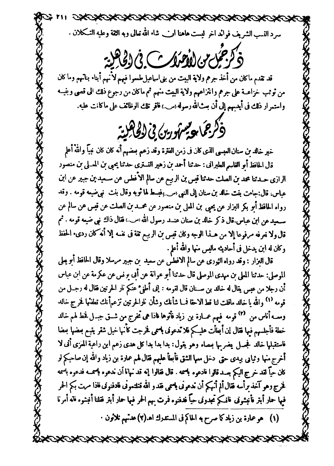 قَالَ الْبَزَّارُ: وَقَدْ رَوَاهُ الثَّوْرِيُّ عَنْ سَالِمٍ الْأَفْطَسِ عَنْ سَعِيدِ بْنِ جُبَيْرٍ مُرْسَلًا وَقَالَ الْحَافِظُ أَبُو يَعْلَى الْمُوصِلِيُّ: حَدَّثَنَا الْمُعَلَّى بْنُ مَهْدِيٍّ الْمَوْصِلِيُّ قَالَ حَدَّثَنَا أَبُو عَوَانَةَ عَنْ أَبِي يُونُسَ عَنْ عِكْرِمَةَ عَنِ ابْنِ عَبَّاسٍ أَنَّ رَجُلًا مِنْ عَبْسٍ يُقَالَ لَهُ خَالِدُ بن سنان قال لقومه: إني أطفئ عنكم نار الحرتين فَقَالَ لَهُ رَجُلٌ مِنْ قَوْمِهِ [1] وَاللَّهِ يَا خَالِدُ مَا قُلْتَ لَنَا قَطُّ إِلَّا حَقًّا فما شأنك وشأن نار الحرتين تَزْعُمُ أَنَّكَ تُطْفِئُهَا فَخَرَجَ خَالِدٌ وَمَعَهُ أُنَاسٌ مِنْ [2] قَوْمِهِ فِيهِمْ عِمَارَةُ بْنُ زِيَادٍ فَأَتَوْهَا فَاذَا هِيَ تَخْرُجُ مِنْ شِقِّ جَبَلٍ فَخَطَّ لَهُمْ خَالِدٌ خُطَّةً فَأَجْلَسَهُمْ فِيهَا فَقَالَ إِنْ أَبْطَأْتُ عَلَيْكُمْ فَلَا تَدْعُونِي بِاسْمِي فَخَرَجَتْ كَأَنَّهَا خَيْلٌ شُقْرٌ يَتْبَعُ بَعْضُهَا بَعْضًا فَاسْتَقْبَلَهَا خَالِدٌ فَجَعَلَ يَضْرِبُهَا بِعَصَاهُ وَهُوَ يَقُولُ: بَدَا بَدَا بَدَا كُلُّ هُدَى زَعَمَ ابْنُ رَاعِيَةِ الْمِعْزَى أتى لا أخرج منها وثيابي بيدي حَتَّى دَخَلَ مَعَهَا الشَّقَّ فَأَبْطَأَ عَلَيْهِمْ فَقَالَ لَهُمْ عُمَارَةُ بْنُ زِيَادٍ وَاللَّهِ إِنَّ صَاحِبَكُمْ لَوْ كَانَ حَيًّا لَقَدْ خَرَجَ إِلَيْكُمْ بَعْدُ قَالُوا فَادْعُوهُ بِاسْمِهِ. قَالَ فَقَالُوا إِنَّهُ قَدْ نَهَانَا أَنْ نَدْعُوَهُ بِاسْمِهِ فَدَعَوْهُ بِاسْمِهِ فَخَرَجَ وَهُوَ آخِذٌ بِرَأْسِهِ فَقَالَ أَلَمْ أَنْهَكُمْ أَنْ تَدْعُونِي بِاسْمِي فَقَدْ وَاللَّهِ قَتَلْتُمُونِي فَادْفِنُونِي فَاذَا مَرَّتْ بِكُمُ الْحُمُرُ فِيهَا حِمَارٌ أَبْتَرُ فَانْبِشُونِي فَإِنَّكُمْ تَجِدُونِي حَيًّا فَدَفَنُوهُ فَمَرَّتْ بِهِمُ الْحُمُرُ فِيهَا حِمَارٌ أَبْتَرُ فَقُلْنَا انْبِشُوهُ فَإِنَّهُ أَمَرَنَا