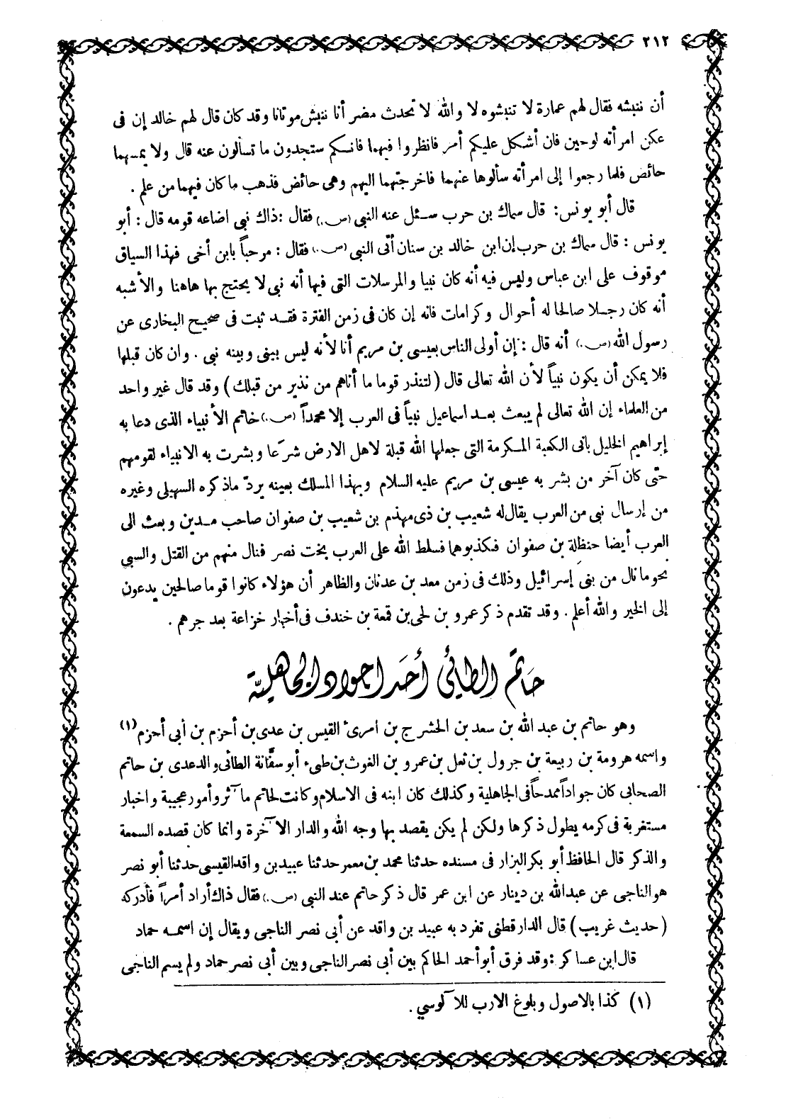 وَهُوَ حَاتِمُ بْنُ عَبْدِ اللَّهِ بْنِ سَعْدِ بْنِ الْحَشْرَجِ بْنِ امْرِئِ الْقَيْسِ بْنِ عَدِيِّ بن أحزم بن أبى أحزم [1] واسمه هرومة بن ربيعة بن جرول بن ثعل بْنِ عَمْرِو بْنِ الْغَوْثِ بْنِ طيِّئ أَبُو سفّانة الطائي والدعدى بْنِ حَاتِمٍ الصَّحَابِيِّ كَانَ جَوَادًا مُمَدَّحًا فِي الْجَاهِلِيَّةِ وَكَذَلِكَ كَانَ ابْنُهُ فِي الْإِسْلَامِ وَكَانَتْ لِحَاتِمٍ مَآثِرُ وَأُمُورٌ عَجِيبَةٌ وَأَخْبَارٌ مُسْتَغْرَبَةٌ فِي كَرَمِهِ يَطُولُ ذِكْرُهَا وَلَكِنْ لَمْ يَكُنْ يَقْصِدُ بِهَا وَجْهَ اللَّهِ وَالدَّارَ الْآخِرَةَ وَإِنَّمَا كَانَ قَصْدُهُ السُّمْعَةَ وَالذِّكْرَ قَالَ الْحَافِظُ أَبُو بَكْرٍ الْبَزَّارُ فِي مُسْنَدِهِ حَدَّثَنَا مُحَمَّدُ بْنُ مَعْمَرٍ حَدَّثَنَا عُبَيْدُ بْنُ وَاقَدٍ الْقَيْسِيُّ حَدَّثَنَا أَبُو نصر هُوَ النَّاجِيُّ عَنْ عَبْدِ اللَّهِ بْنِ دِينَارٍ عَنِ ابْنِ عُمَرَ قَالَ ذُكِرَ حَاتِمٌ عِنْدَ النَّبِيِّ صَلَّى اللَّهُ عَلَيْهِ وَسَلَّمَ فَقَالَ ذاك أَرَادَ أَمْرًا فَأَدْرَكَهُ (حَدِيثٌ غَرِيبٌ) قَالَ الدَّارَقُطْنِيُّ تَفَرَّدَ بِهِ عُبَيْدُ بْنُ وَاقَدٍ عَنْ أَبِي نصر النَّاجِيِّ وَيُقَالُ إِنَّ اسْمَهُ حَمَّادٌ قَالَ ابْنُ عَسَاكِرَ: وَقَدْ فَرَّقَ أَبُو أَحْمَدَ الْحَاكِمُ بَيْنَ أبى نصر النَّاجِيِّ وَبَيْنَ أَبِي نَصْرٍ حَمَّادٍ وَلَمْ يُسَمِّ الناجي
